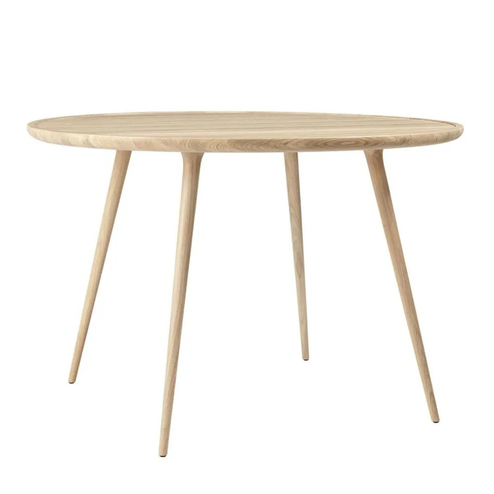 Der Accent Esstisch wurde von Space Copenhagen für die Marke Mater entworfen. Die Accent-Kollektion, die Tische in unterschiedlichen Größen umfasst, setzt wie der Name schon vermuten lässt Akzente in jeden Raum. Es gibt aus der Accent-Serie auch Couchtische.