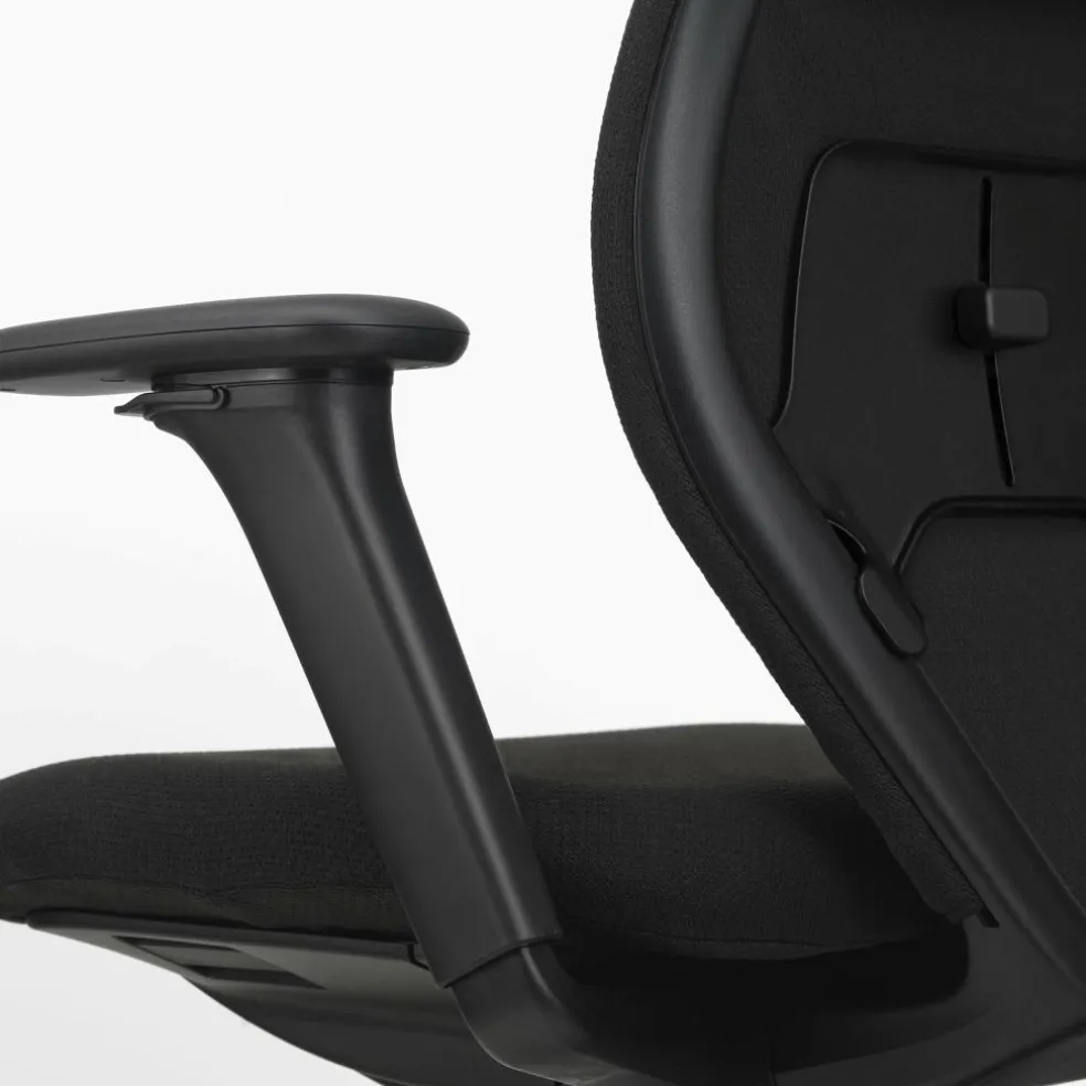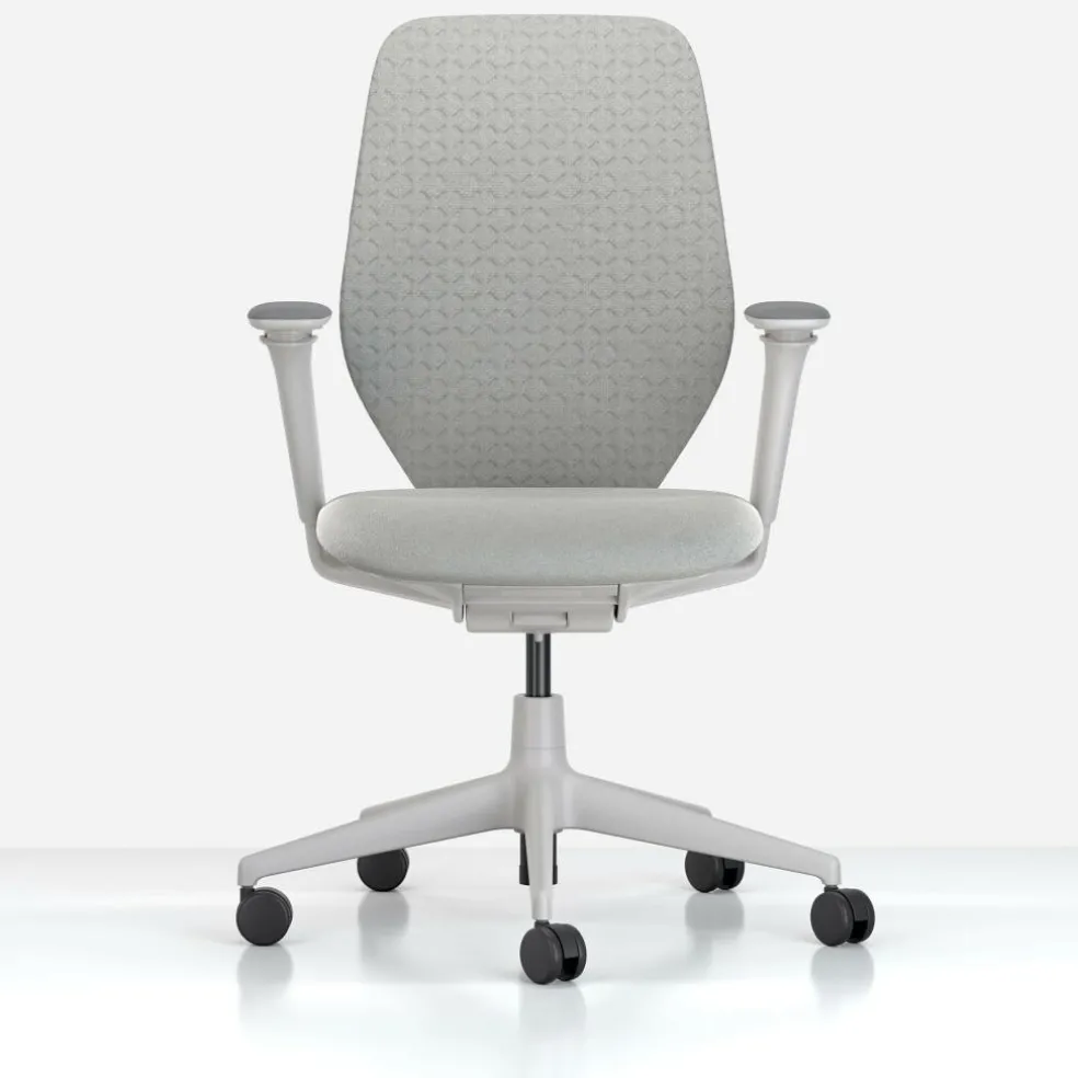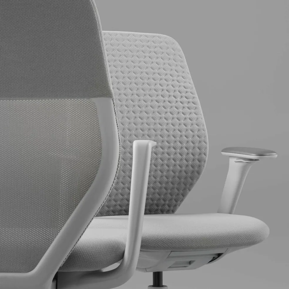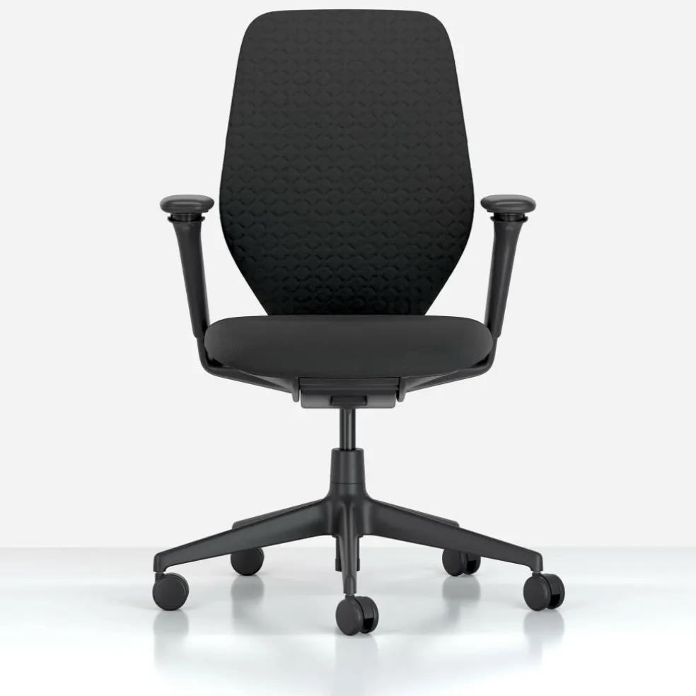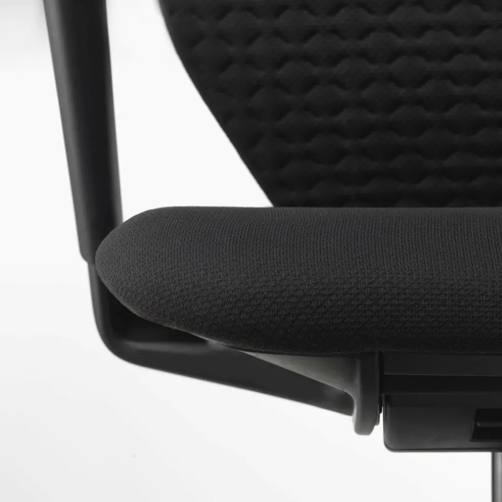 Der ACX Soft Bürostuhl ist mit einer ausgeklügelten Technik ausgestattet. Dank der Synchronmechanik passt sich der Stuhl an das Körpergewicht an. Er wippt bei der Verlagerung der Position mit. Man kann diese Mechanik auch ausschalten und den Sitz in aufrechter Position arretieren. Sowohl die Sitzfläche als auch die Rückenlehne werden zu 100 Prozent aus recyceltem Polyester gemacht. Unter dem Stoff befindet sich eine Schicht Polyurethanschaum. Die Steppung an der Rückenlehne verleiht dem Stuhl ein dreidimensionales Aussehen. Der 5-Sternfuß wird aus Polyamid gemacht. An der Unterseite sind Doppelrollen mit einem Durchmesser von 6cm befestigt. Auch die in der Höhe, der Breite und Tiefe verstellbaren 3D-Armlehnen bestehen aus Polyamid.