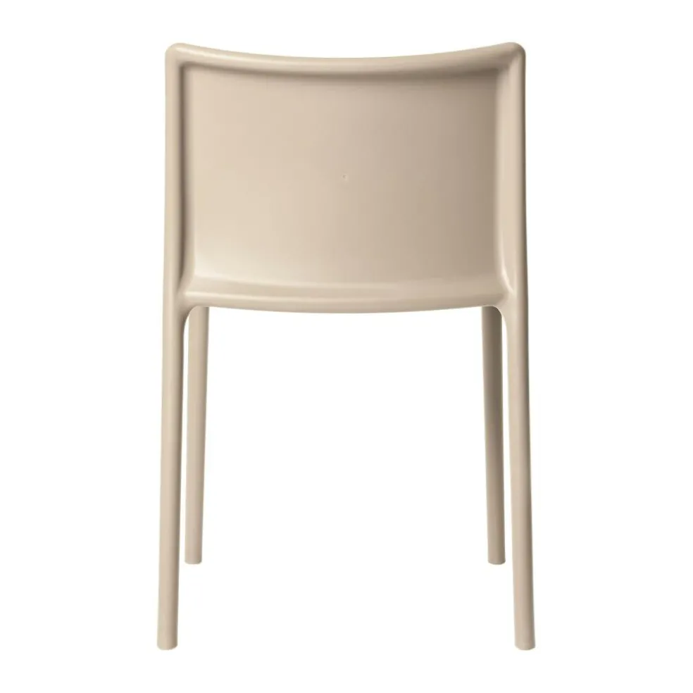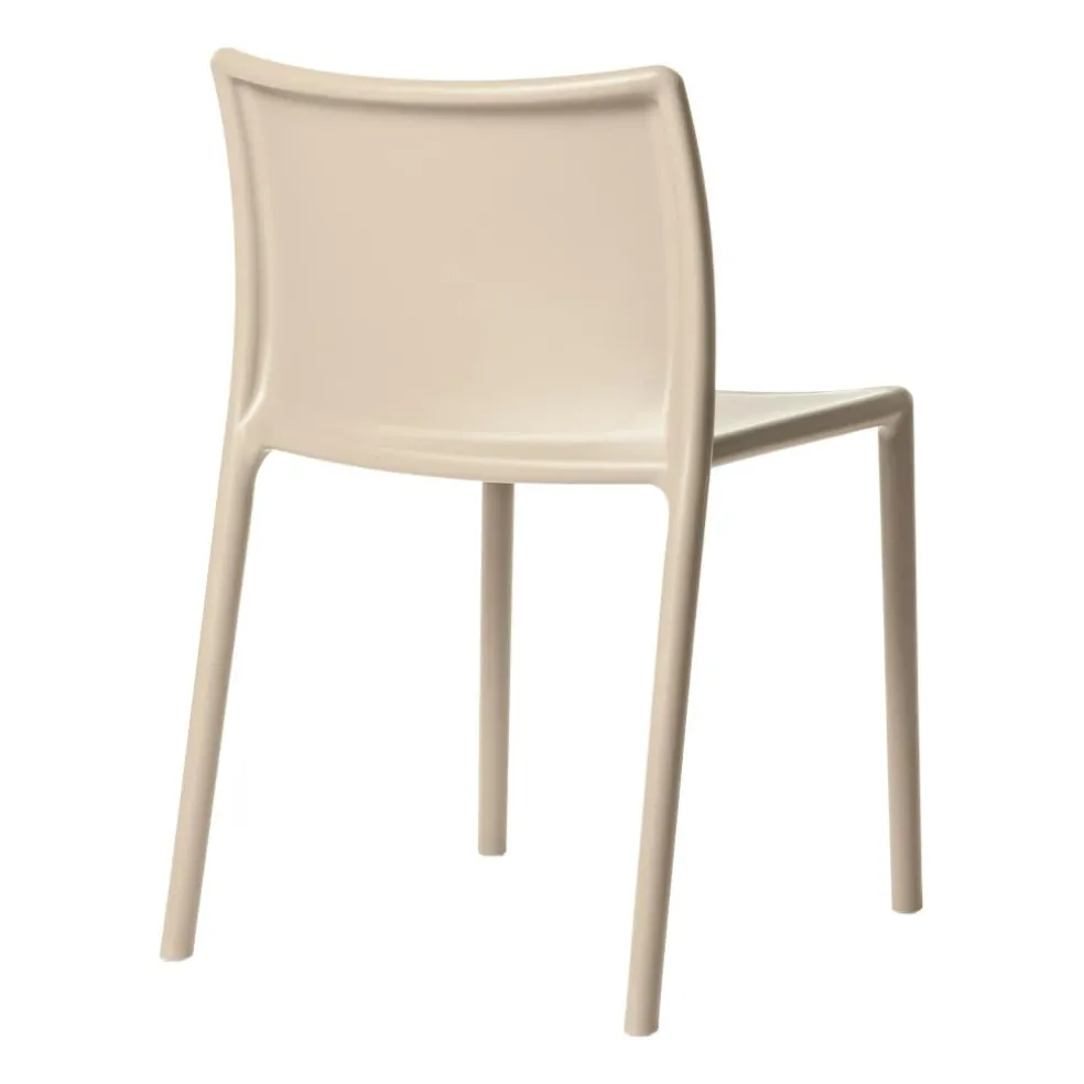 Das Design des Air Stuhl ist klassisch. Sitzfläche und Rückenlehne sind ergonomisch geformt, alle Kanten großzügig abgerundet. Seine Oberfläche ist matt. Die Lehne wirkt wie in einen Rahmen eingefasst, der sich bis in die hinteren Stuhlbeine fortsetzt. Ihr ausgestellter Schwung und die exakt im rechten Winkel zur Sitzfläche stehenden vorderen Stuhlbeine verleihen dem Air Stuhl seine Stabilität. Zudem ist der Designstuhl aus Polyethylen unter Zugabe von Glasfaser gefertigt, was ihn besonders langlebig und robust macht. Der Air Stuhl ist ein zeitloses Sitzmöbel für die Kantine oder den Wartebereich im Foyer und kann, mit Verbindungsstücken ausgestattet, auch als Bestuhlung für Veranstaltungsräume dienen. Dank der witterungsbeständigen Eigenschaft seines Materials und einer in die Sitzfläche eingelassenen Rille, durch die Regenwasser schnell abfließen kann, eignet sich der Air Stuhl ebenso gut für den Outdoor-Einsatz.