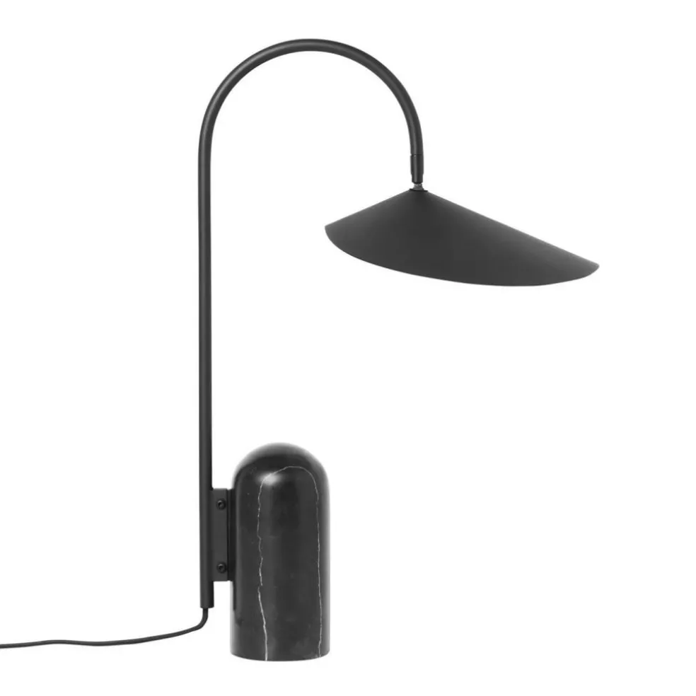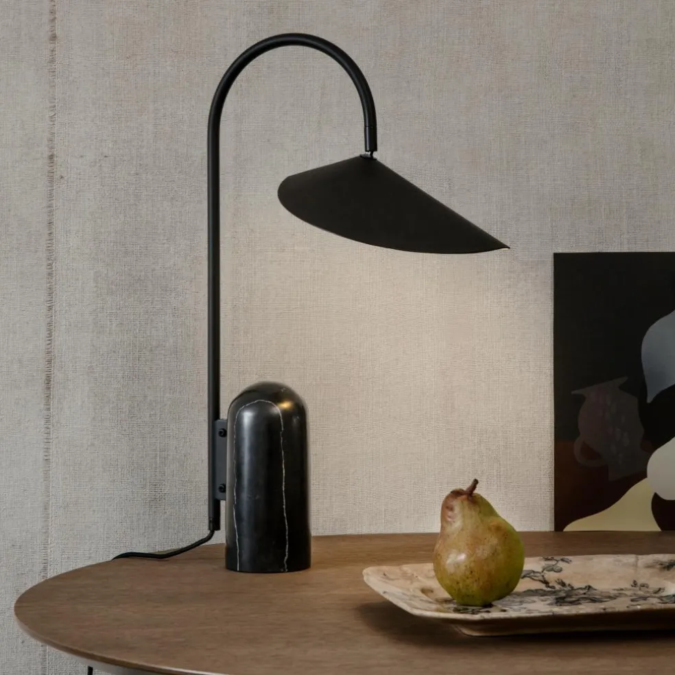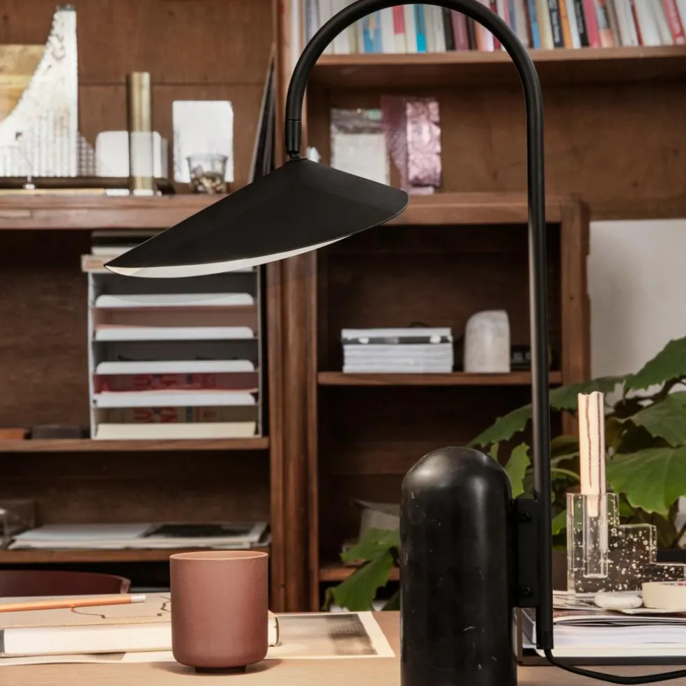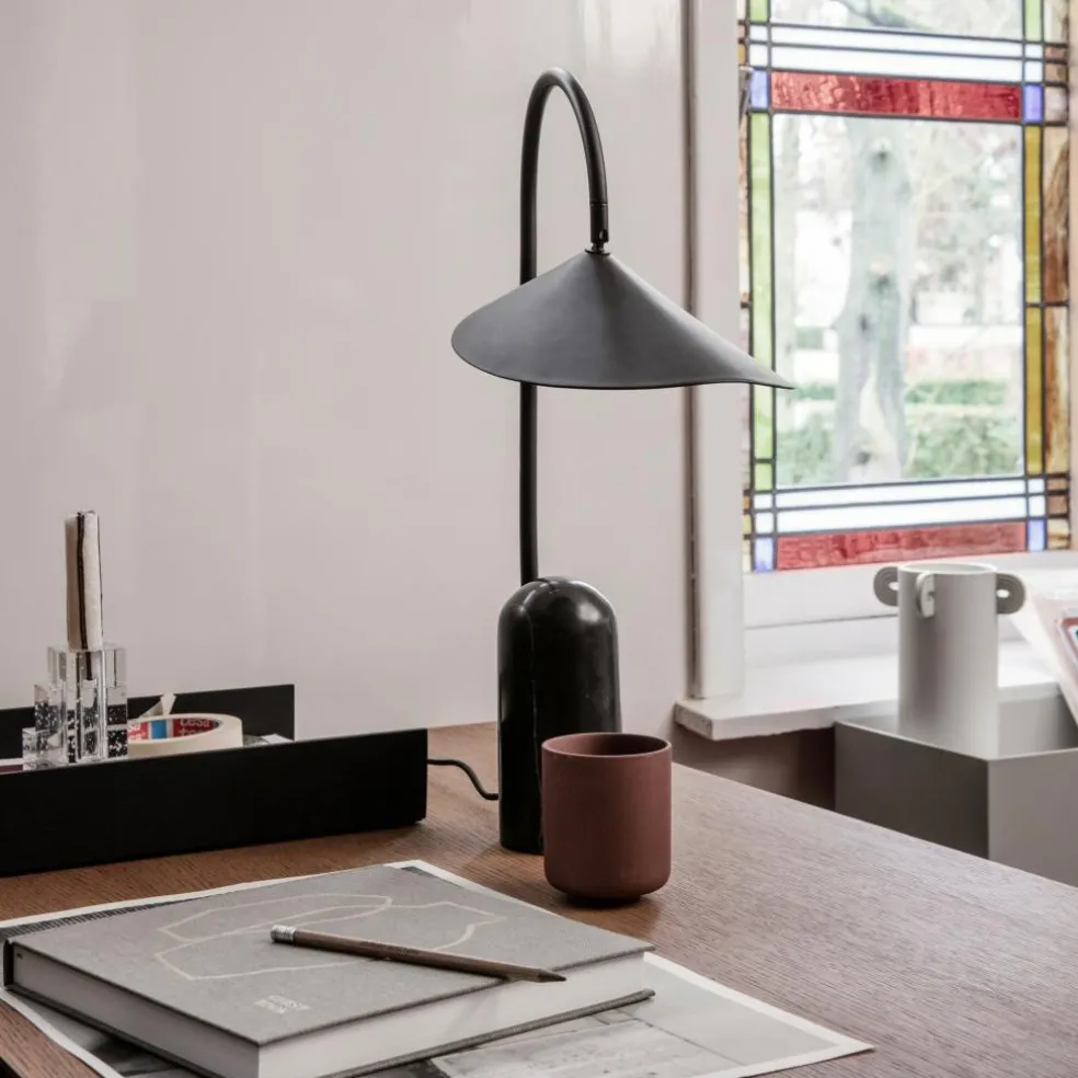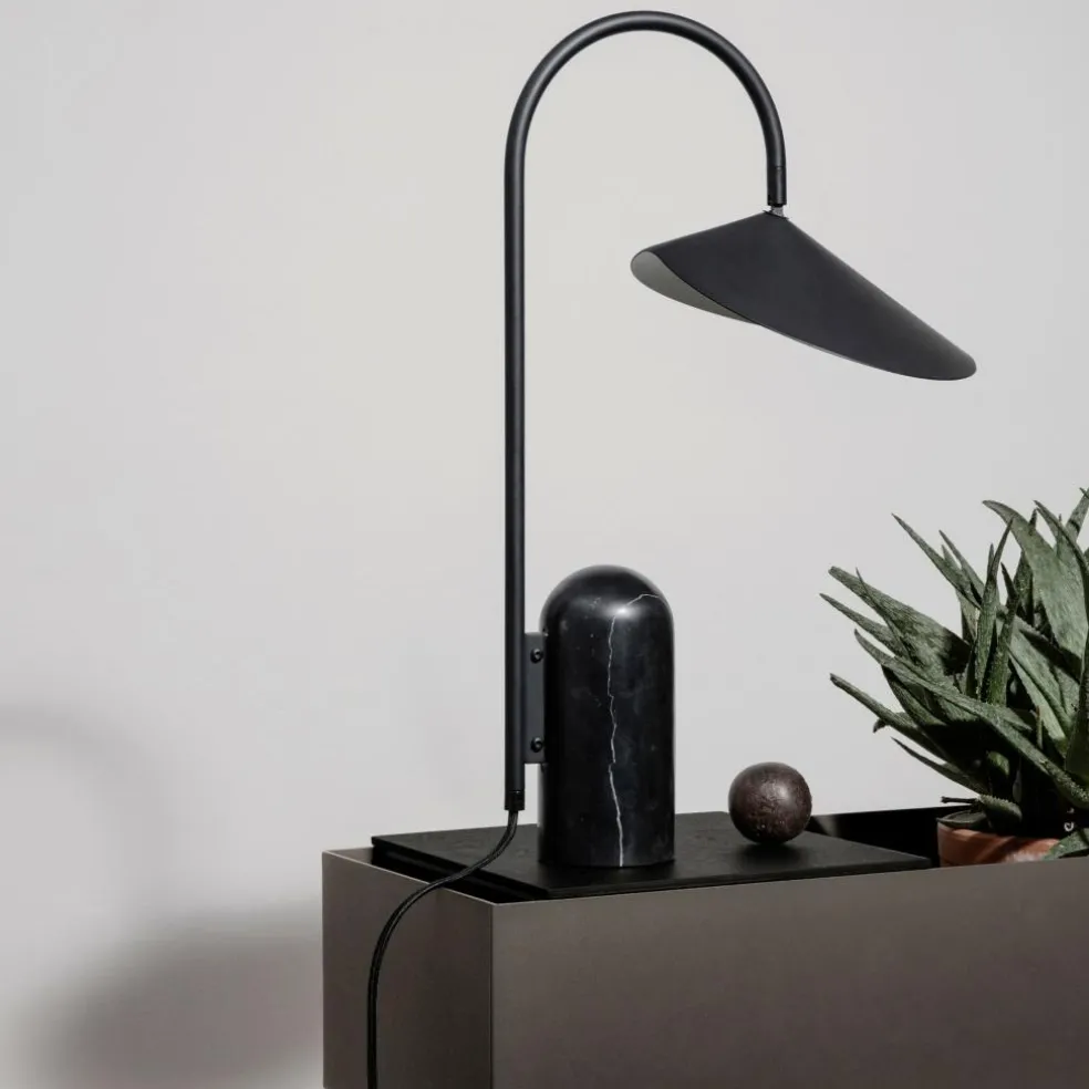 Die Arum Tischleuchte wurde für die Marke Ferm Living entworfen. Mit ihrem prägnanten Schirm erinnert diese Leuchte an die Entwürfe von Bernard Schottlander und Serge Mouille. Jedoch wurde das Design im Kontext des 21. Jahrhunderts weitergedacht und orientiert sich am dänischen Minimalismus. Diese grafische Schönheit spielt gekonnt mit Proportionen. Der große Leuchtenschirm hängt am Metallbogen wie ein Blatt am Stängel einer Pflanze. Balanciert wird diese Kombination durch einen schweren Fuß aus Marmor.