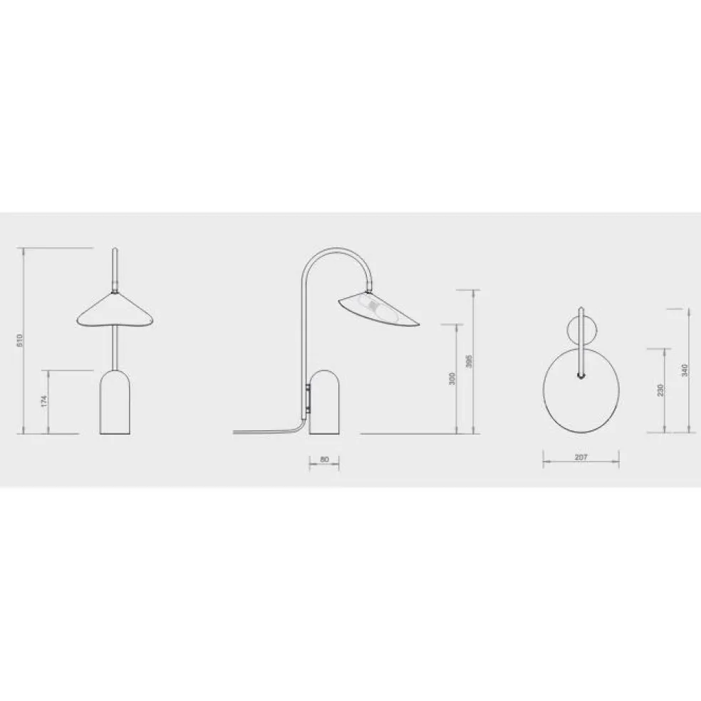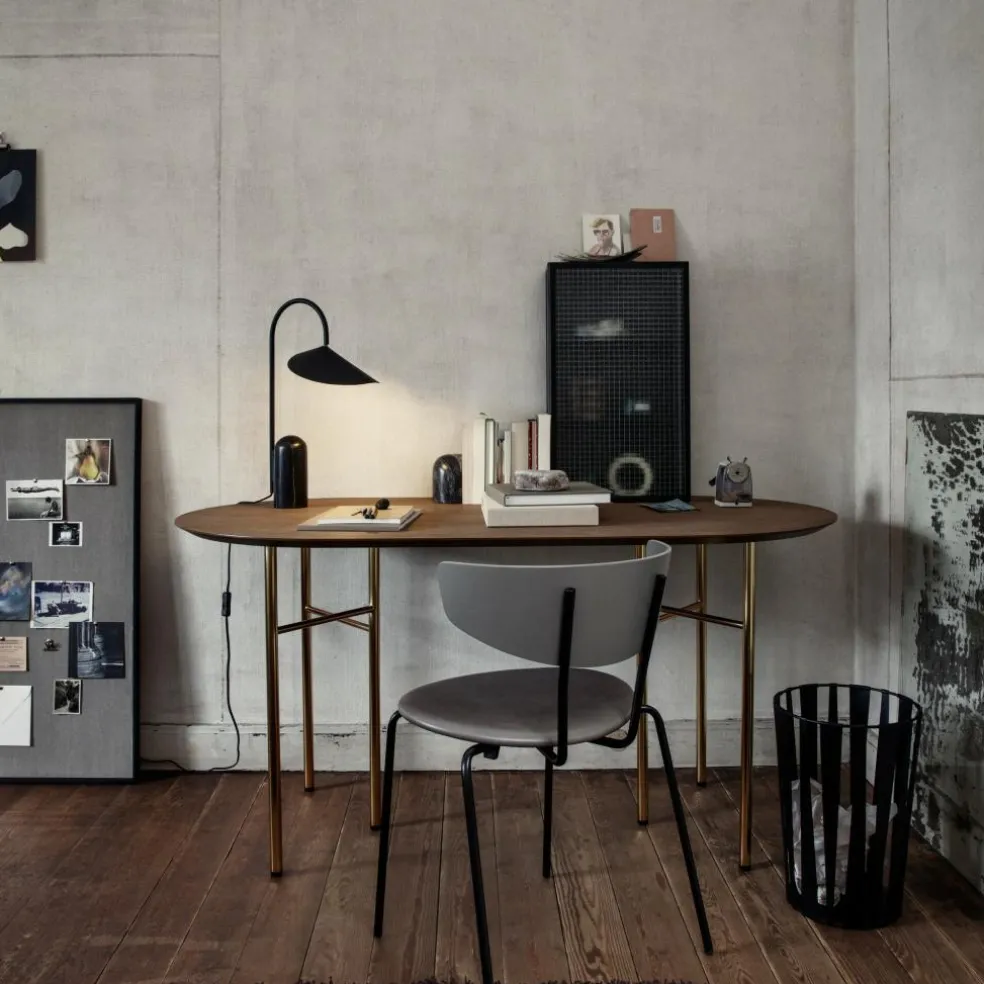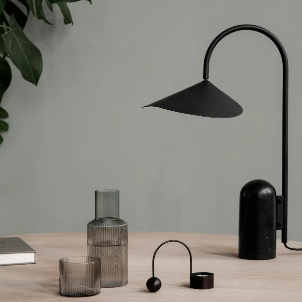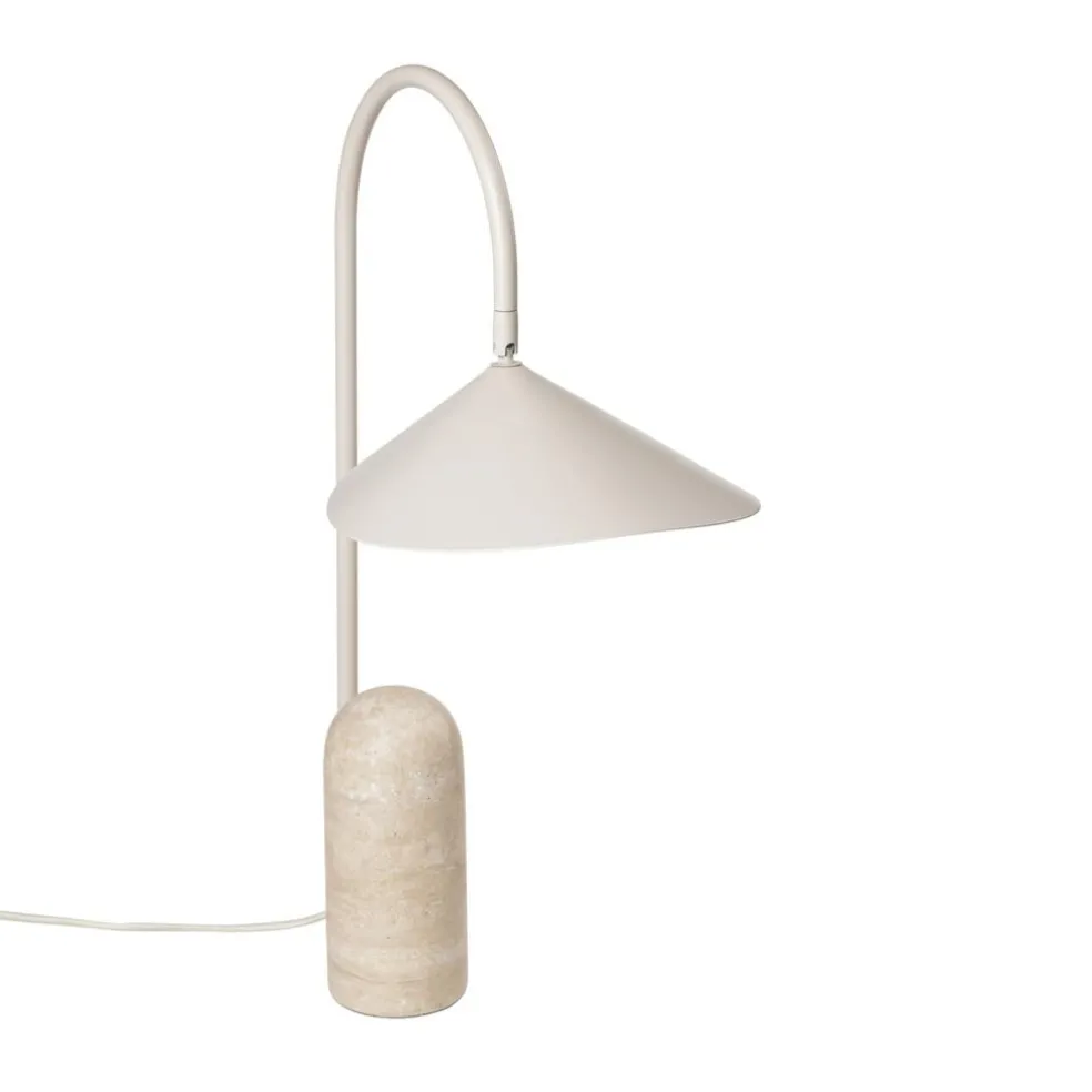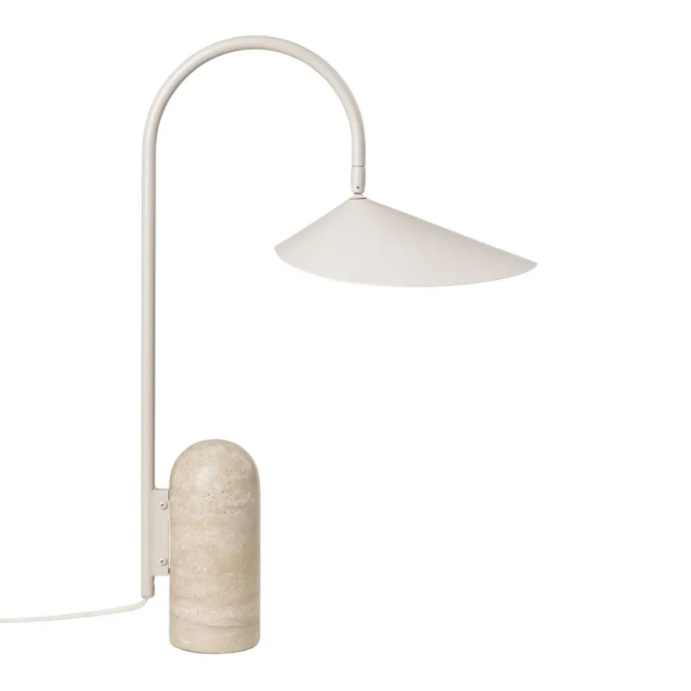 Die Arum Tischleuchte wurde für die Marke Ferm Living entworfen. Mit ihrem prägnanten Schirm erinnert diese Leuchte an die Entwürfe von Bernard Schottlander und Serge Mouille. Jedoch wurde das Design im Kontext des 21. Jahrhunderts weitergedacht und orientiert sich am dänischen Minimalismus. Diese grafische Schönheit spielt gekonnt mit Proportionen. Der große Leuchtenschirm hängt am Metallbogen wie ein Blatt am Stängel einer Pflanze. Balanciert wird diese Kombination durch einen schweren Fuß aus Marmor.
