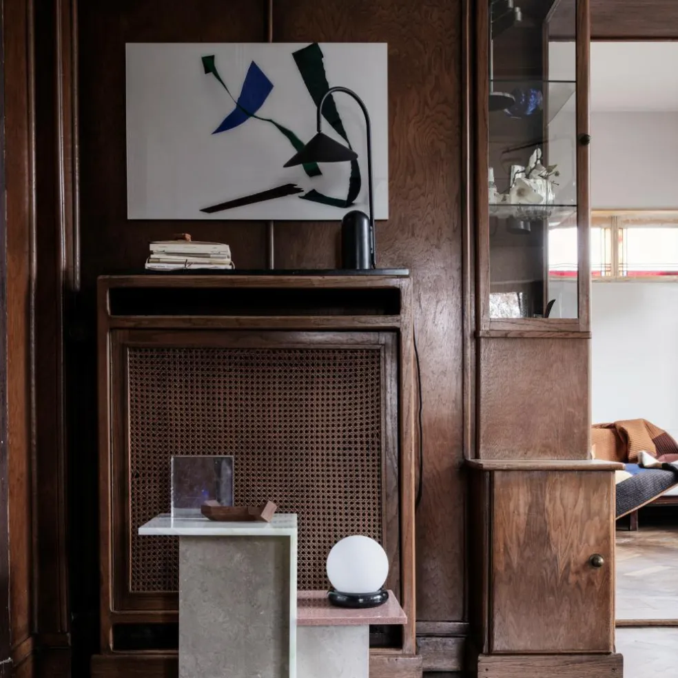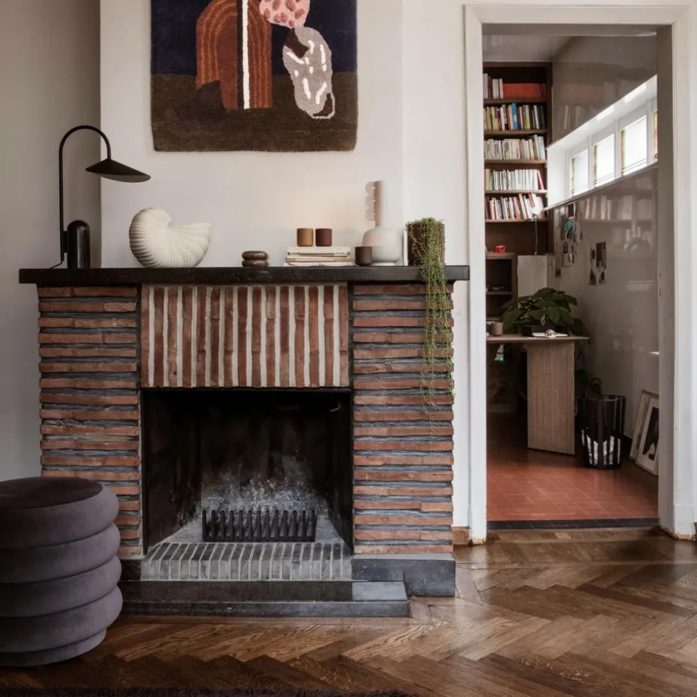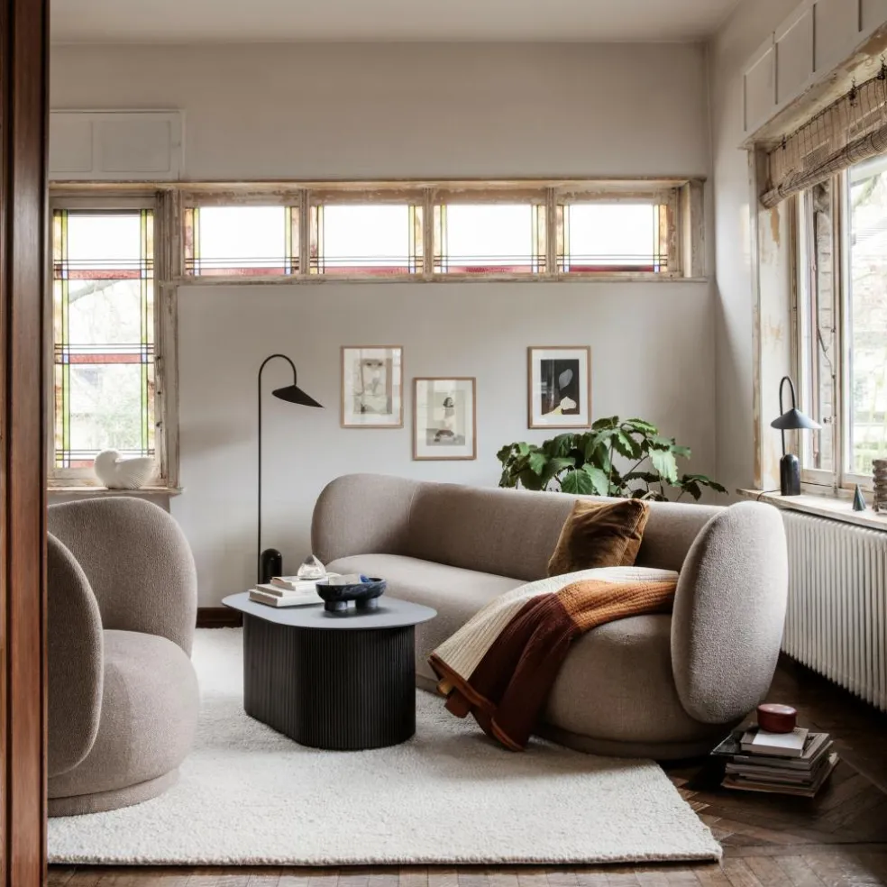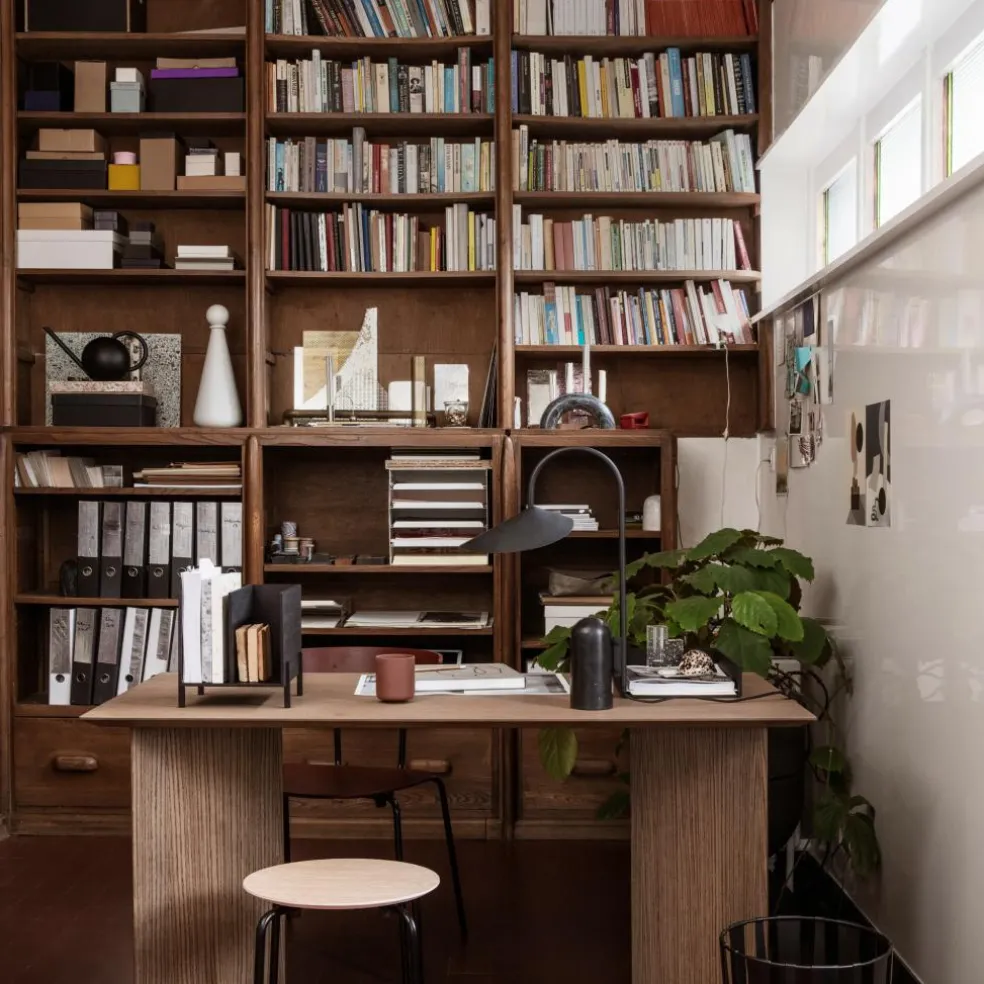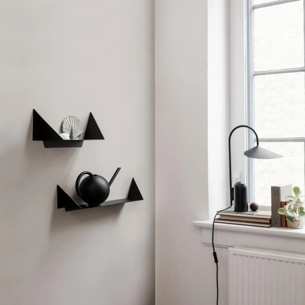 Die Arum Tischleuchte wurde für die Marke Ferm Living entworfen. Mit ihrem prägnanten Schirm erinnert diese Leuchte an die Entwürfe von Bernard Schottlander und Serge Mouille. Jedoch wurde das Design im Kontext des 21. Jahrhunderts weitergedacht und orientiert sich am dänischen Minimalismus. Diese grafische Schönheit spielt gekonnt mit Proportionen. Der große Leuchtenschirm hängt am Metallbogen wie ein Blatt am Stängel einer Pflanze. Balanciert wird diese Kombination durch einen schweren Fuß aus Marmor.