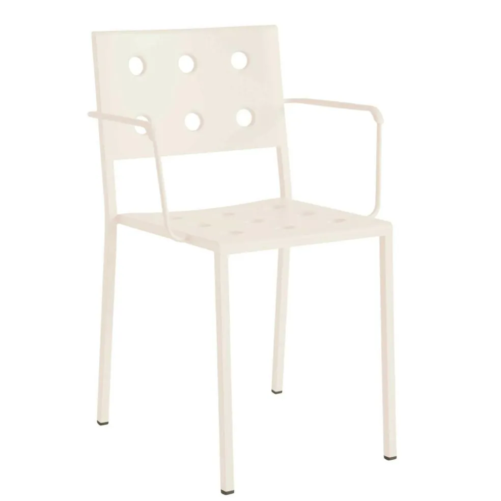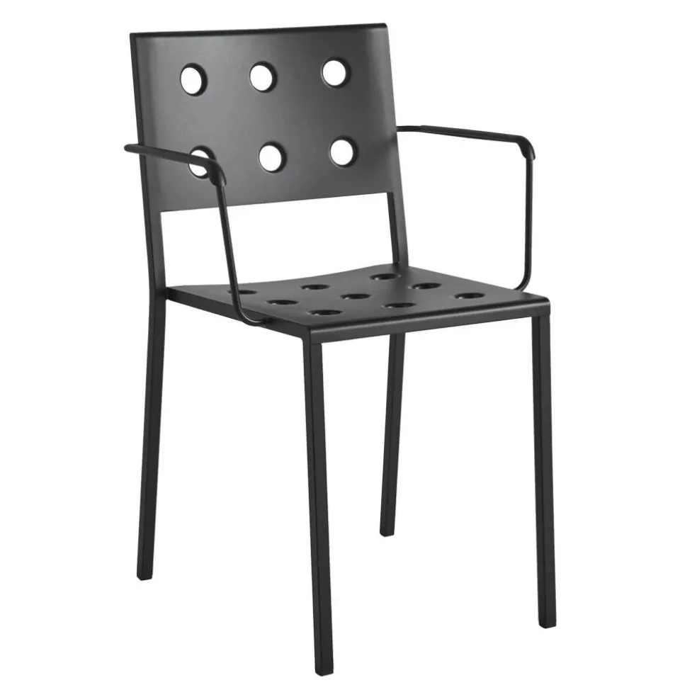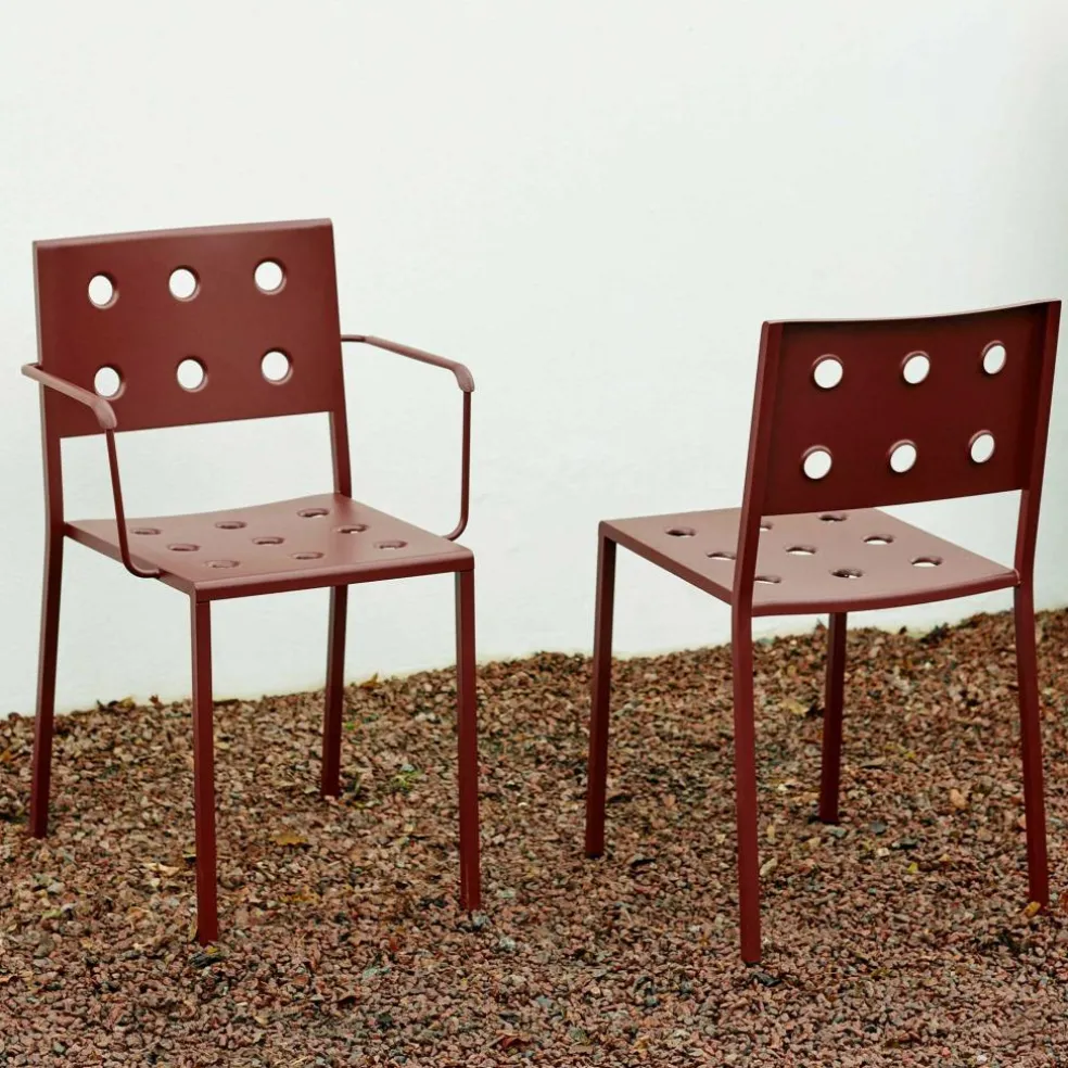 Der Balcony Dining Gartenarmlehnstuhl von HAY, entworfen von Ronan und Erwan Bouroullec, bringt grafische Klarheit und funktionale Raffinesse in den Außenbereich. Mit seiner markanten quadratischen Sitz- und Rückenfläche, die durch abgerundete Kanten und eine regelmäßige Lochstruktur optisch aufgelockert wird, verbindet der Stuhl architektonische Strenge mit subtiler Leichtigkeit.