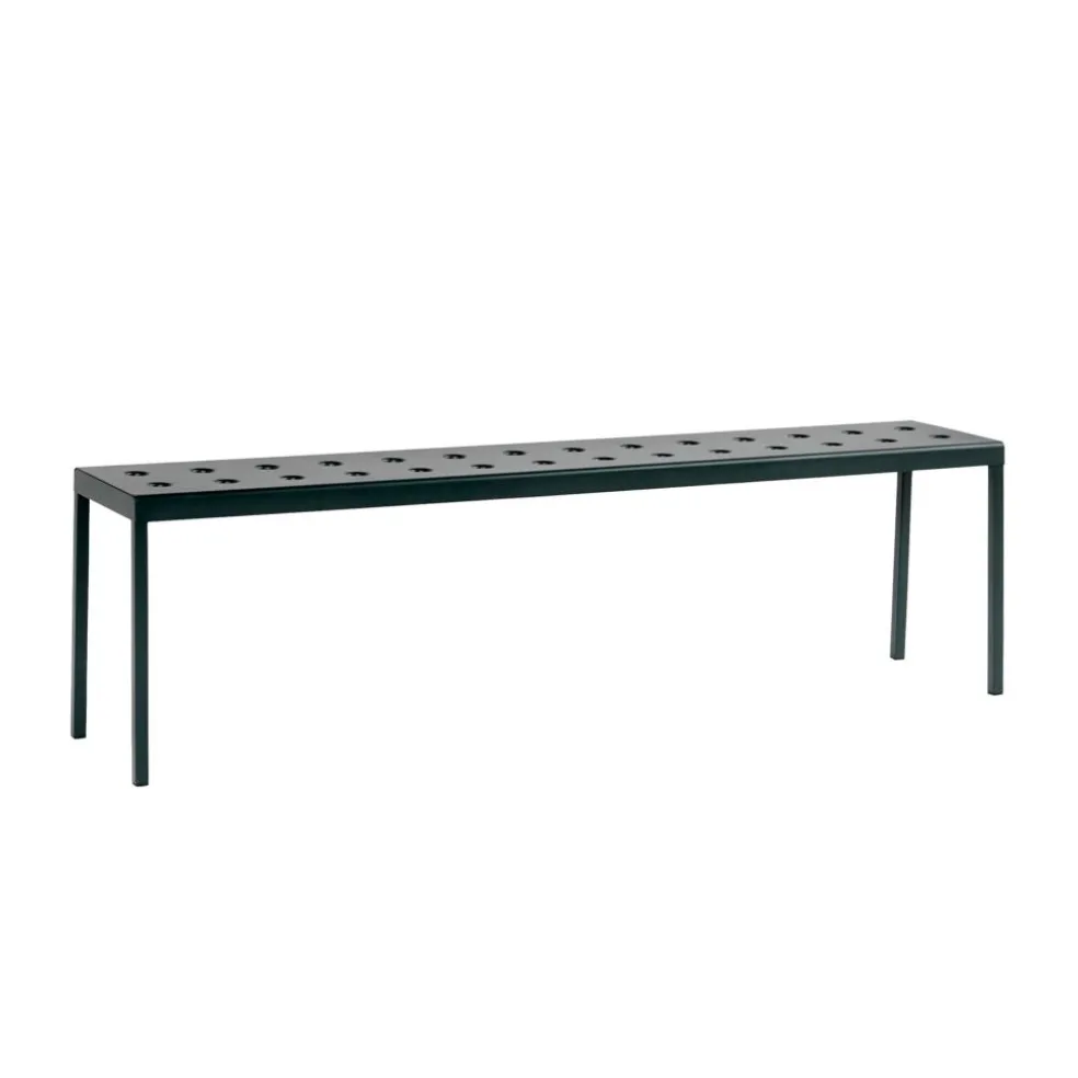 Zur im Jahr 2022 vorgestellten Kollektion gehören auch Tische, Stühle und Armlehnstühle. Sie sind im modernen Stil gestaltet und passen sich jedem Umfeld an. Unverwechselbar machen sie die Löcher, die in Rückenlehnen, Sitzflächen und Tischplatten eingearbeitet sind. Die Balcony Gartenbank 165,5cm ist in verschiedenen Farben zu haben. Die abgerundeten Kanten tragen zur eleganten Silhouette des für den Gartenbereich geeigneten Möbelstücks bei. Es wird aus pulverbeschichtetem Stahl hergestellt. Eine Outdoor-Beschichtung sorgt dafür, dass die Oberfläche der Balcony Gartenbank 165,5cm für viele Jahre wie neu aussieht. Sie schützt vor Korrosion. Sie kann auch bei schlechtem Wetter im Freien bleiben. Durch die Löcher fließt Nässe im Nu ab. An der Unterseite der gerade gestalteten vier Beine sind Kunststoffgleiter montiert. Damit werden empfindliche Böden geschont. Die Beine bestehen aus massiven Stahlrohren.