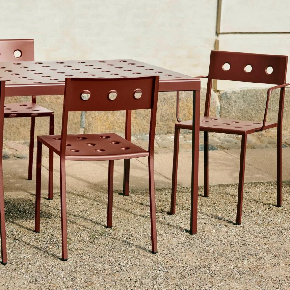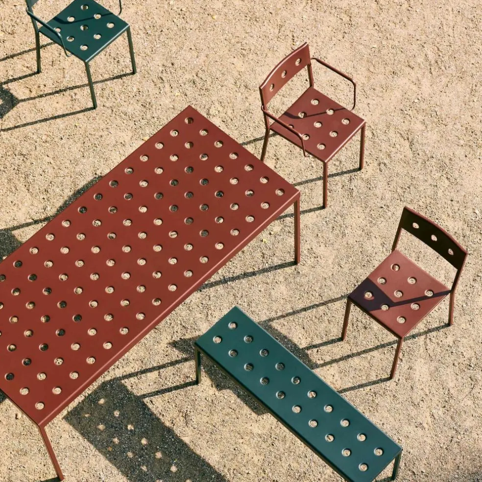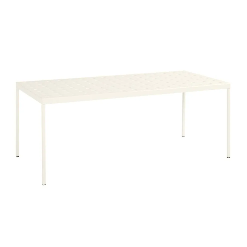 Als Erweiterung der beliebten Balcony-Serie, die auch Stühle und Bänke umfasst, brachten die Brüder Bouroullec den Balcony Gartentisch 190x87x74cm auf den Markt. Sein Markenzeichen sind die zahlreichen Löcher, die in einem strengen geometrischen Muster in die Tischplatte eingearbeitet sind. Durch sie kann Regenwasser rasch abfließen. Außerdem lässt sich die pflegeleichte Oberfläche mit einem weichen Tuch reinigen. Hergestellt wird der Balcony Gartentisch 190x87x74cm aus pulverbeschichtetem Stahl. Zahlreiche Farben stehen zur Auswahl. Das Design des Balcony Gartentischs 190x87x74cm beschränkt sich auf ein Minimum: Die vier Beine aus Stahlrohr sind gerade geschnitten. An der Unterseite sind Gleiter montiert. Die Tischplatte ist rechteckig geformt.