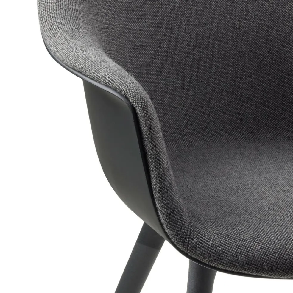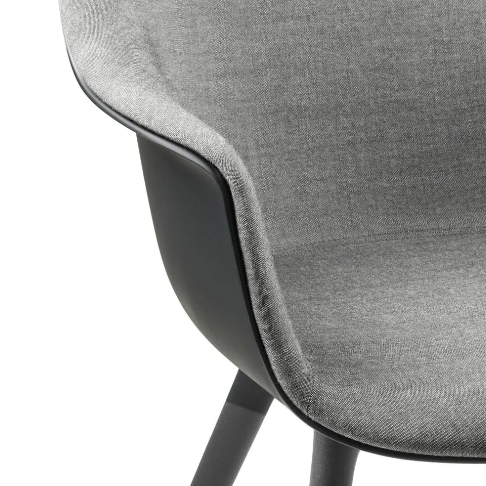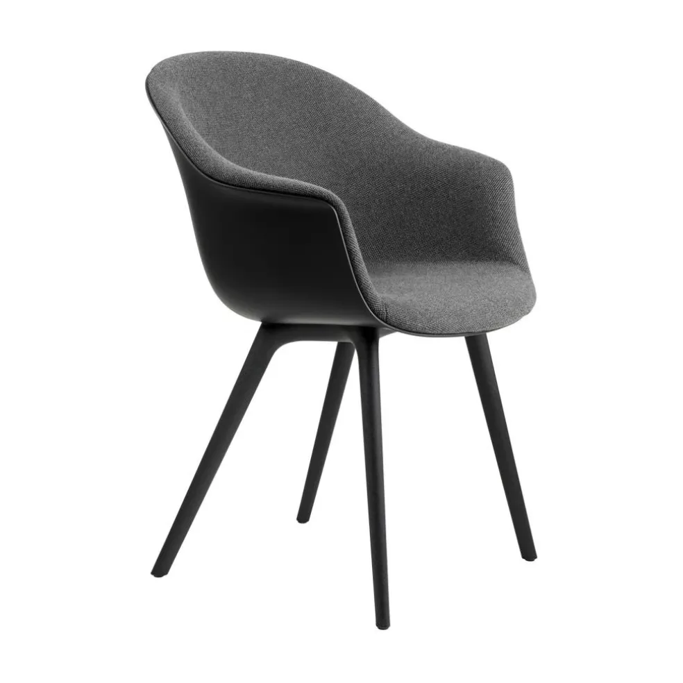 Die großzügige Schale mit ihren hohen, nach außen gebogenen Armlehnen und der rückwärts geneigten Rückenlehne bietet eine komfortable Unterlage. An der Innenseite mit Schaumstoff ausgestattet und mit Stoff bezogen, verspricht sie zudem ein weiches Sitzgefühl. Der strapazierfähige Bezugstoff besteht aus einem Mischgewebe, das je nach gewählter Ausführung einen Wollanteil von bis zu 90% aufweist. Daneben sorgt das Kunststoffgestell mit seinen konischen Beinen für eine moderne Optik. Die ausgestellte Konstruktion schenkt dem Bat Schalenstuhl Frontpolsterung Gestell Kunststoff einen stabilen Stand. So eignet sich der Designstuhl nicht nur für den Esstisch. Er findet auch im Wartebereich einer Praxis oder im Vorzimmer eines Büros Verwendung. Dank der regionalen Produktion, die kurze Transportwege voraussetzt, zeichnet sich der Stuhl als nachhaltige Wahl aus.
