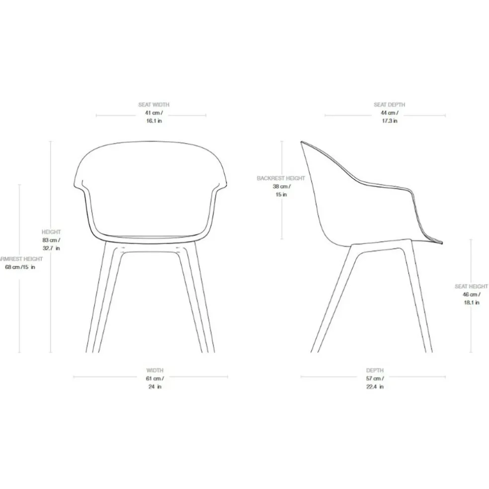 Der Bat Schalenstuhl Frontpolsterung Gestell Kunststoff ist 61cm breit und 57cm tief. Seine Sitzhöhe beträgt 46cm und die Armlehnhöhe 68cm. Die Gesamthöhe misst 83cm. Der Designstuhl wiegt 9kg. Er ist mit verschiedenen Bezugstoffen zu haben. Weiters gibt es aus der Bat-Reihe verschiedene Modelle mit Stahlgestell oder Vollpolsterung.