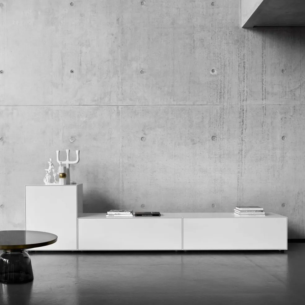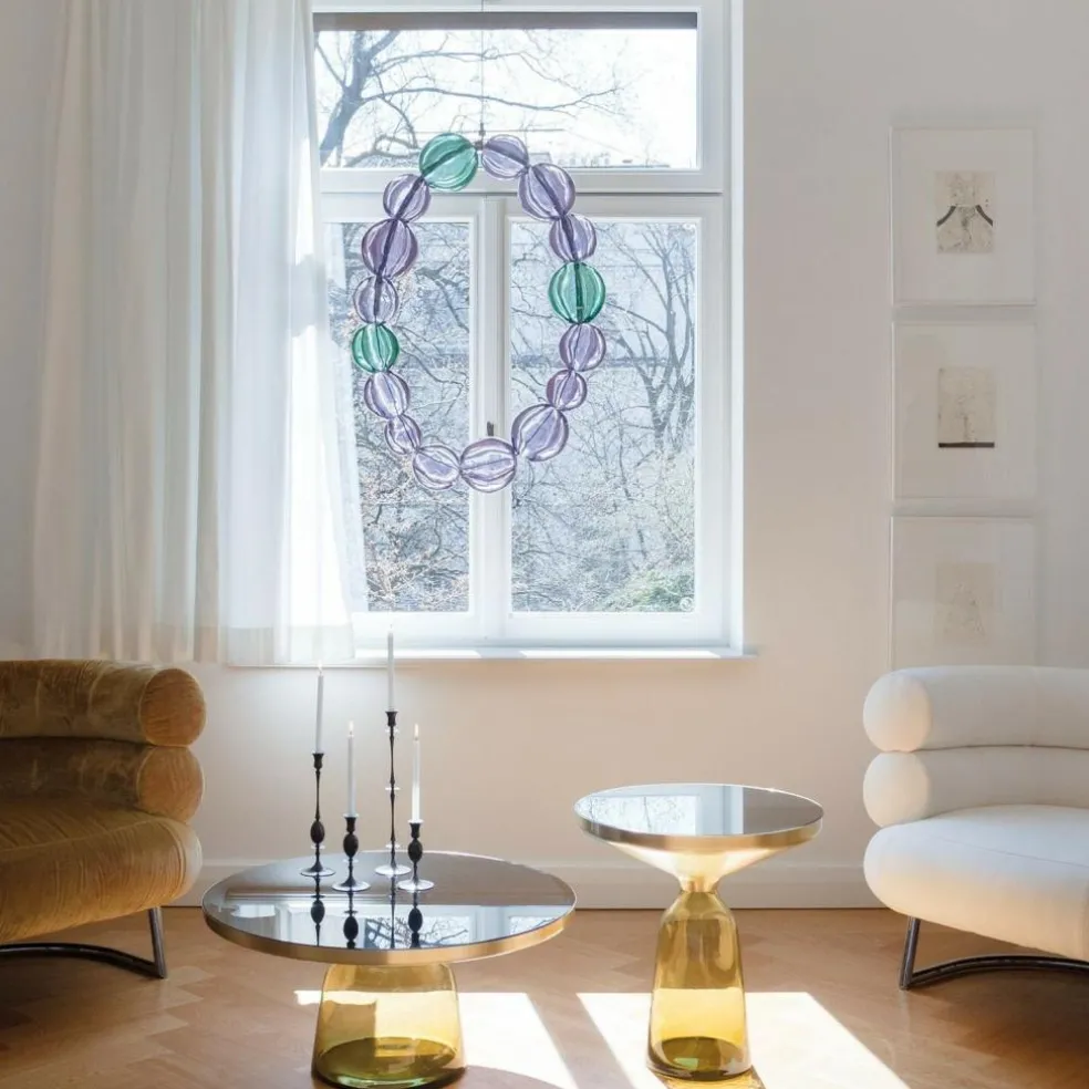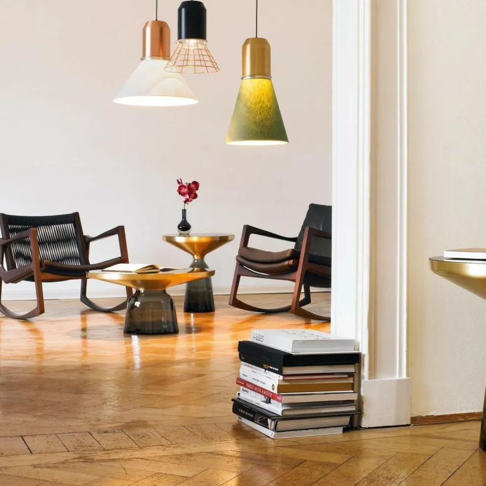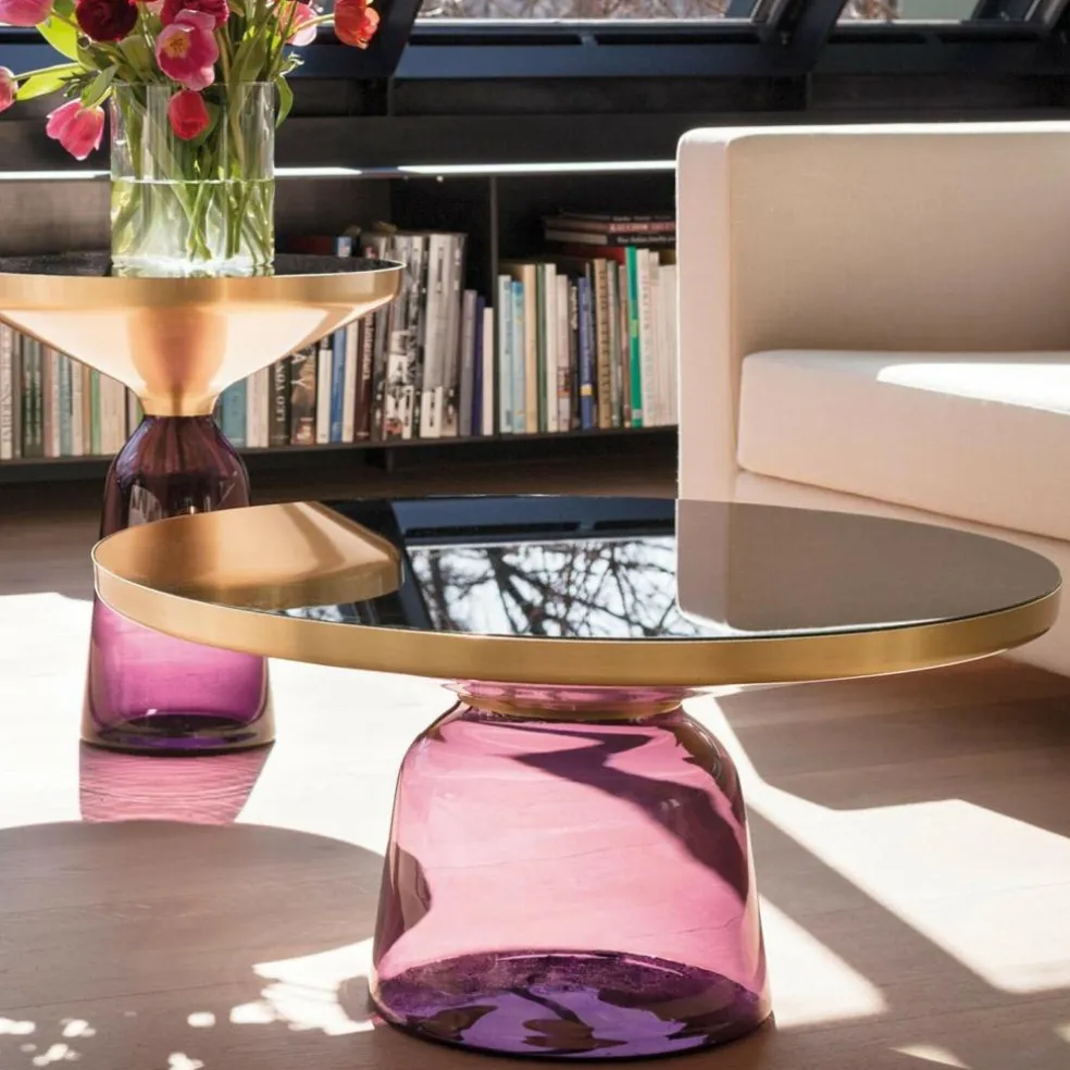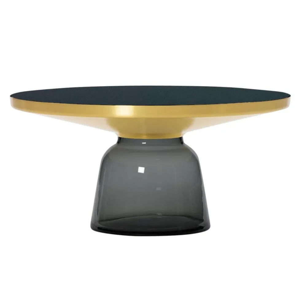 Im Jahr 2012 wurde der Bell Coffee Table Kaffeetisch Messing erstmals vorgestellt. Schon damals zog er wegen seines auffallenden Materialmixes alle Blicke auf sich. Anders als viele andere Tische dient nämlich filigranes Glas als Basis. Der glockenförmige Sockel wird mundgeblasen. Bei dieser traditionellen Handwerkskunst kommt es zu kleinen Unregelmäßigkeiten im Glas, was jeden Bell Coffee Table Kaffeetisch Messing einzigartig macht. Auf der Glasbasis ist ein Metallaufsatz aus Messing befestigt. Für die Tischplatte verwendet der Designer lackiertes Kristallglas. Fällt Licht auf den Bell Coffee Table Kaffeetisch Messing,schimmert die Oberfläche faszinierend.