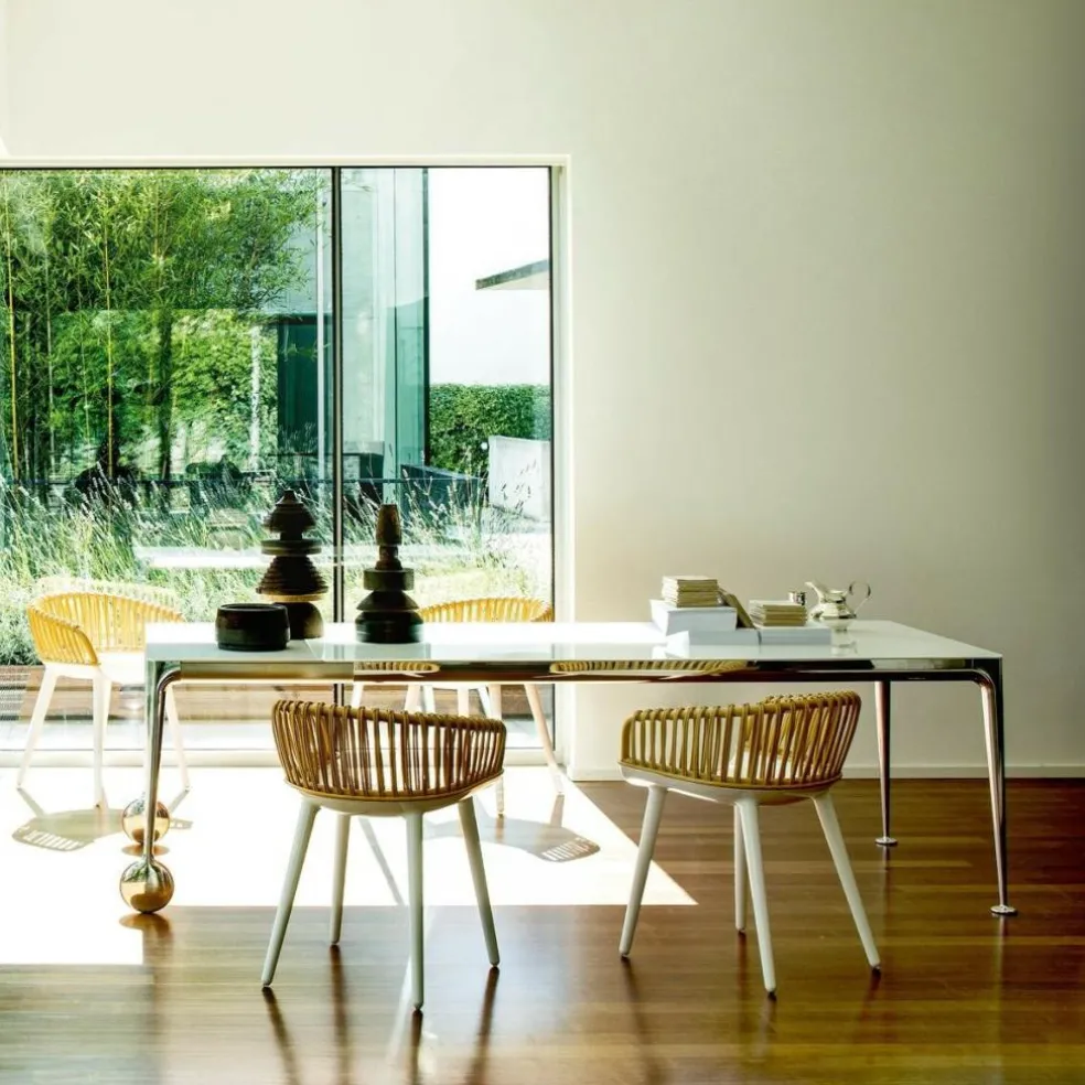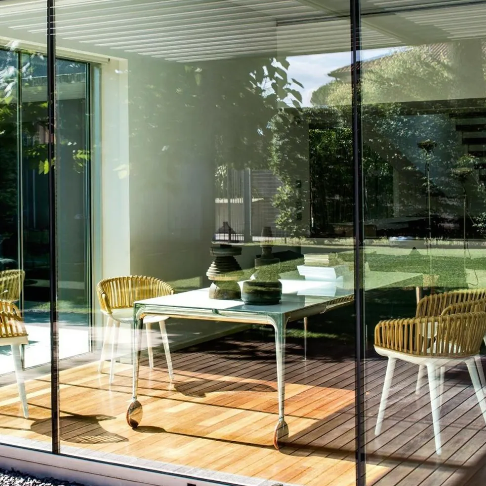 Die Tischplatte besteht aus kratzfestem, 10 Millimeter starkem, gehärtetem Glas, das entweder geätzt matt oder glänzend ist, der Korpus ist aus Aluminium-Druckguss. Beides zusammen ergibt einen spannenden und dennoch harmonischen Materialmix.