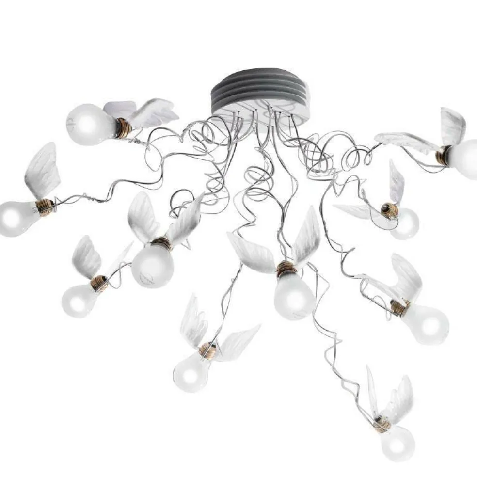 Mit 10 extra von Ingo Maurer gefertigten Halogen Niedervolt-Glühlampen und handgefertigten Flügeln aus Gänsefedern wird Birdie’s Nest zu einer sehr außergewöhnlichen Designleuchte. Sie können die einzelnen Drähte verdrehen, verbiegen und strecken.