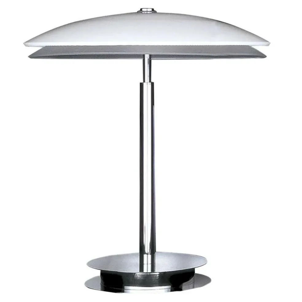 Beim Betrachten der Bis – Tris Tischleuchte werden sofort Assoziationen mit einem Pilz wach. Schließlich ist der Leuchtenschirm in einem deutlichen Halbrund geformt. Außergewöhnlich ist, dass das Modell mit zwei Leuchtschirmen gefertigt wird. Beide bestehen aus sandgestrahltem Glas, wobei der obere an der Innenseite eine Beschichtung aufweist. Dadurch wird der Lichtstrahl auf interessante Weise reflektiert. Einen außergewöhnlichen Kontrast zu den Leuchtschirmen mit matter Oberfläche stellt der Fuß dar: Er ist nämlich aus Messing hergestellt; wahlweise glänzend oder verchromt erhältlich. Der Sockel besteht aus zwei dünnen Scheiben, dazwischen sitzt eine dickere Scheibe mit einem geringeren Durchmesser. Der Schalter der Bis – Tris Tischleuchte ist im Kabel integriert.