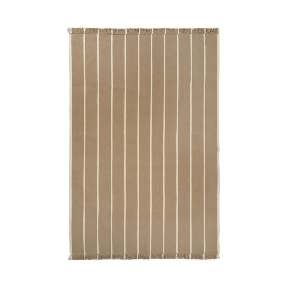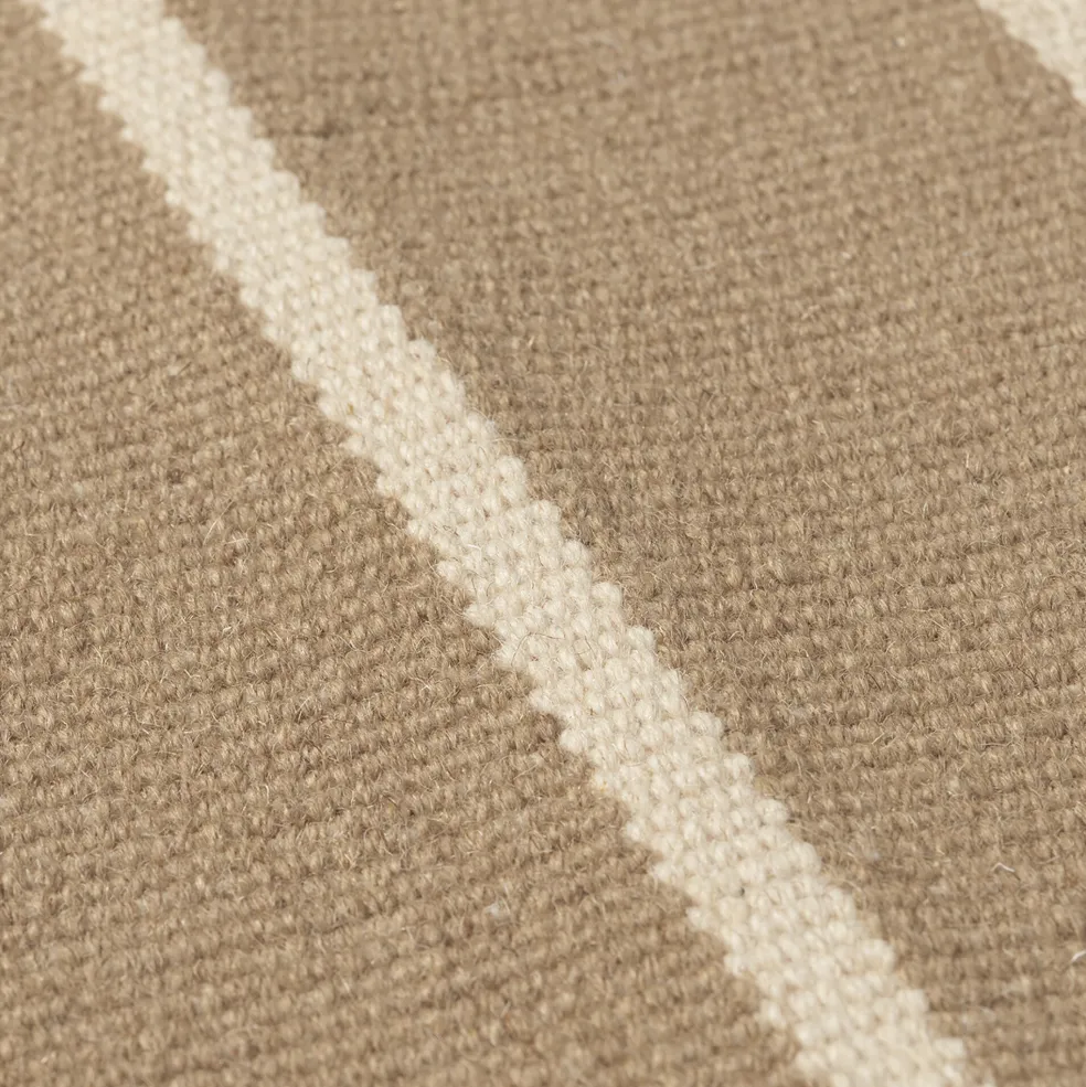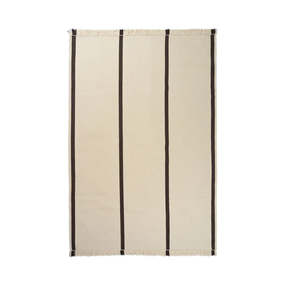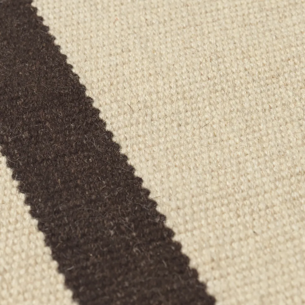Der Calm Kelim Wollteppich 200x140cm wiegt 4,1 kg und lässt sich durch regelmäßiges Absaugen unkompliziert pflegen. Er ist Teil der Calm Kollektion von Ferm Living – einer Serie, die modernes Wohndesign mit traditionellen Webtechniken stilvoll vereint.