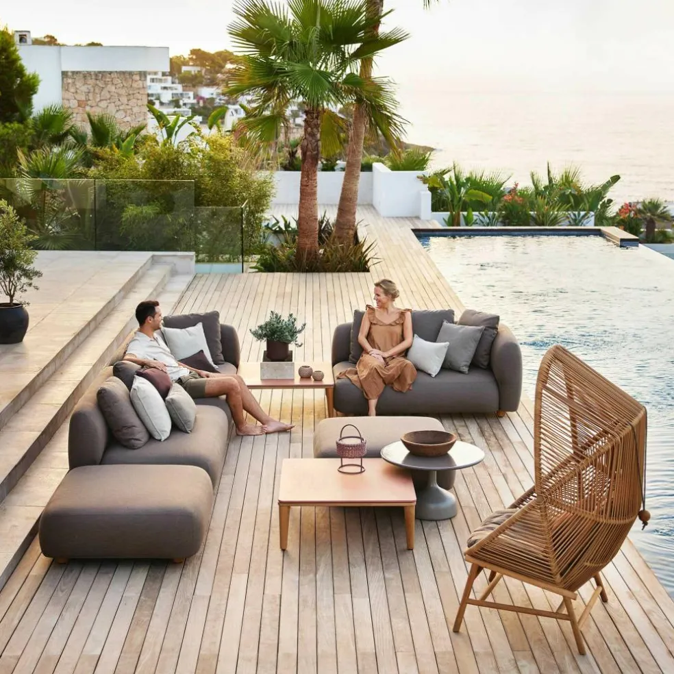 Das Capture 2-Sitzer Sofamodul Mitte wurde für die Marke Cane-Line entworfen. Es ist ein Teil des innovativen Modulsystems Capture, das auch Sofas mit Seitenteilen und Ottomane umfasst. Das Ensemble ist am Pool, auf der Terrasse oder im Garten eine gemütliche Sitzgelegenheit.