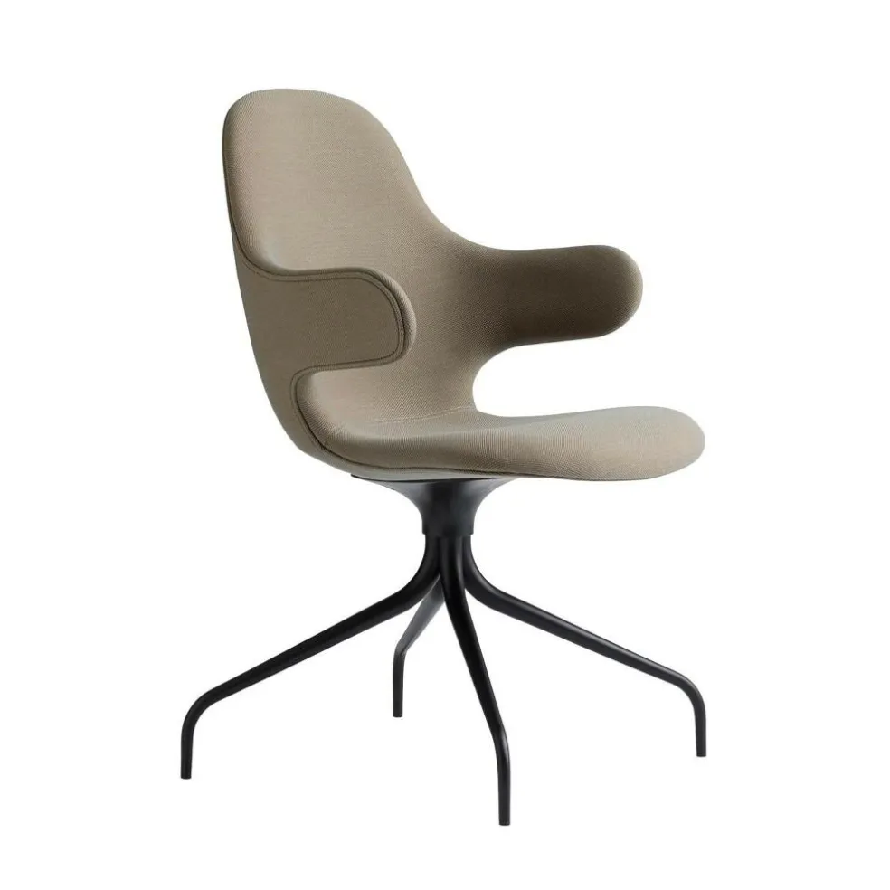 Der ergonomisch designte Catch JH2 Drehstuhlist der erste Beitrag des Designers zu einer Stuhlkollektion. Das Gestell in Form eines Kreuzfußes besticht mit schwarzer Pulverbeschichtung, die Polsterung mit PU&CMHR-Schaum sorgt für Komfort. Der beige Stoffbezug harmoniert auch zu dunklerem Einrichtungsambiente. Der elegante Stuhl misst 58 x 90 x 58 cm und bietet eine angenehme Sitzhöhe von 45cm. Die Armlehnen auf einer Höhe von 68cm verlängern die Rückenlehne ergonomisch so, dass sie förmlich dazu einladen, Platz darauf zu nehmen. Der Catch JH2 Drehstuhl von &Tradition ist mit seinem gelungenen Design nicht nur ein Blickfang für Gäste und Besucher, sondern kann auch in allen Indoorbereichen eingesetzt werden, sei es im Büro, Schlaf- oder Wohnzimmer. Zur Pflege reicht ein weiches Tuch.