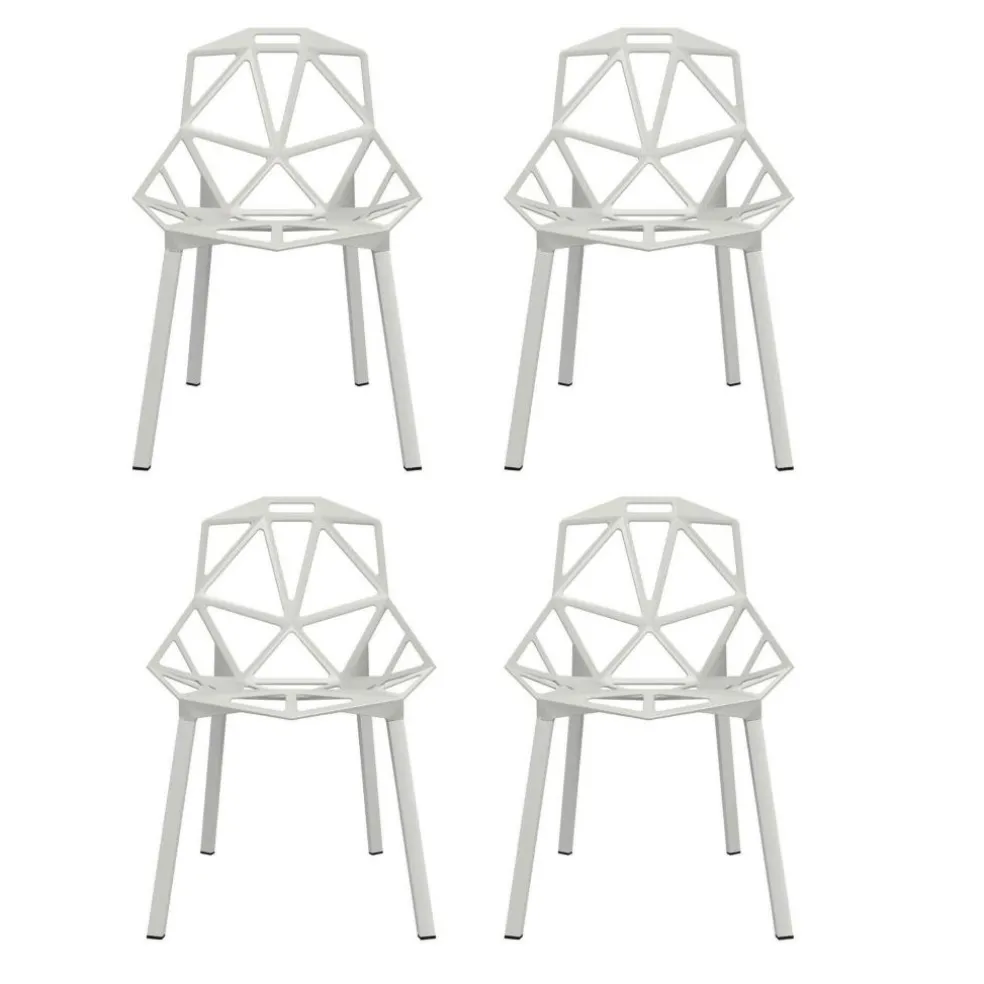 Das Chair One Stuhl stapelbar 4er Set trägt das Label Nordic Swan: Das nordische Umweltlabel wurde 1989 ins Leben gerufen und zeichnet nachhaltig hergestellte Produkte aus. Der bekannte Industriedesigner leistete intensive Vorarbeit: Bis er mit dem Design zufrieden war, fertigte er unzählige Skizzen und Prototypen an. So entstand eine markante Sitzschale, die aus Streben zusammengesetzt ist und ein interessantes geometrisches Muster bildet. Gefertigt wird das Chair One Stuhl stapelbar 4er Set aus Profilaluminium, das in einem Druckgussverfahren in die richtige Form gebracht wird. Die Oberfläche hat eine Polyesterlackierung. Die vier Füße sind aus eloxiertem Profilaluminium gemacht.