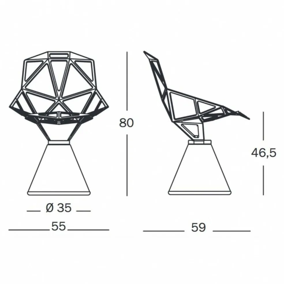 34,5 kg wiegt der Chair One Stuhl Zementfuß.Er ist 55 cm breit und die Höhe beträgt 80 cm. Das Modell ist 59 cm tief und hat eine Sitzhöhe von 46,5 cm. Aus derselben Serie ist auch eine drehbare Variante zu haben.