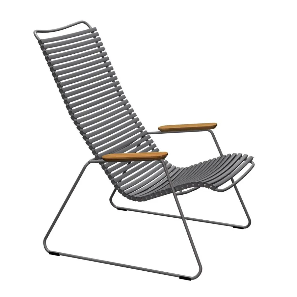 Charakteristisch für den Click Loungestuhl sind seine bequeme niedrige Sitzhöhe und die angenehm zurückgelehnte Position – perfekt für entspannte Stunden. Die ergonomisch geformte Sitzfläche geht nahtlos in die Rückenlehne über und bietet optimalen Sitzkomfort. Die Lamellen, die an das Gestell geklickt sind und der Kollektion ihren Namen verleihen, bestehen aus robustem Polypropylen, das UV- und witterungsbeständig ist. Sie passen sich durch ihre flexible Beschaffenheit perfekt dem Körper an. Diese Konstruktion sorgt für ein angenehmes Sitzerlebnis ohne zusätzliche Polster. Das Gestell aus pulverbeschichtetem Stahl ist wetterbeständig und langlebig – ideal für den Einsatz im Freien. Der Click Loungestuhl bietet dank seiner großzügigen Maße von 63 cm Breite, 90 cm Tiefe und einer Höhe von 95,5 cm eine stets entspannte Sitzposition. Die beiden Armlehnen aus Bambusholz sind in einer Höhe von 51,5 cm. Die Sitzhöhe beträgt 37,5 cm, während die niedrige Sitzfläche und die zurückgelehnte Lehne zum Relaxen einladen. Die Breite des Sitzes ist 49 cm. Mit einem Gewicht von 10,8 kg ist der Click Loungestuhl stabil und gleichzeitig leicht genug, um ihn bei Bedarf umzustellen. In den kalten Monaten sollten die Outdoor-Möbel im Innenbereich gelagert werden. Das Bambusholz der Armlehnen sollte regelmäßig mit einer geeigneten Pflege behandelt werden. Der Click Loungestuhl wird montiert geliefert, lediglich die beiden Armlehnen müssen mit jeweils drei Schrauben befestigt werden.
