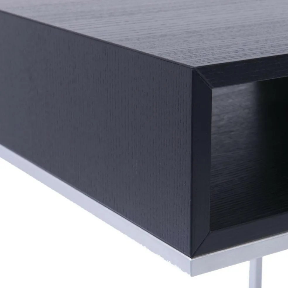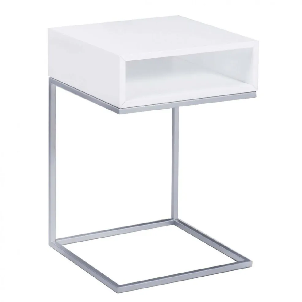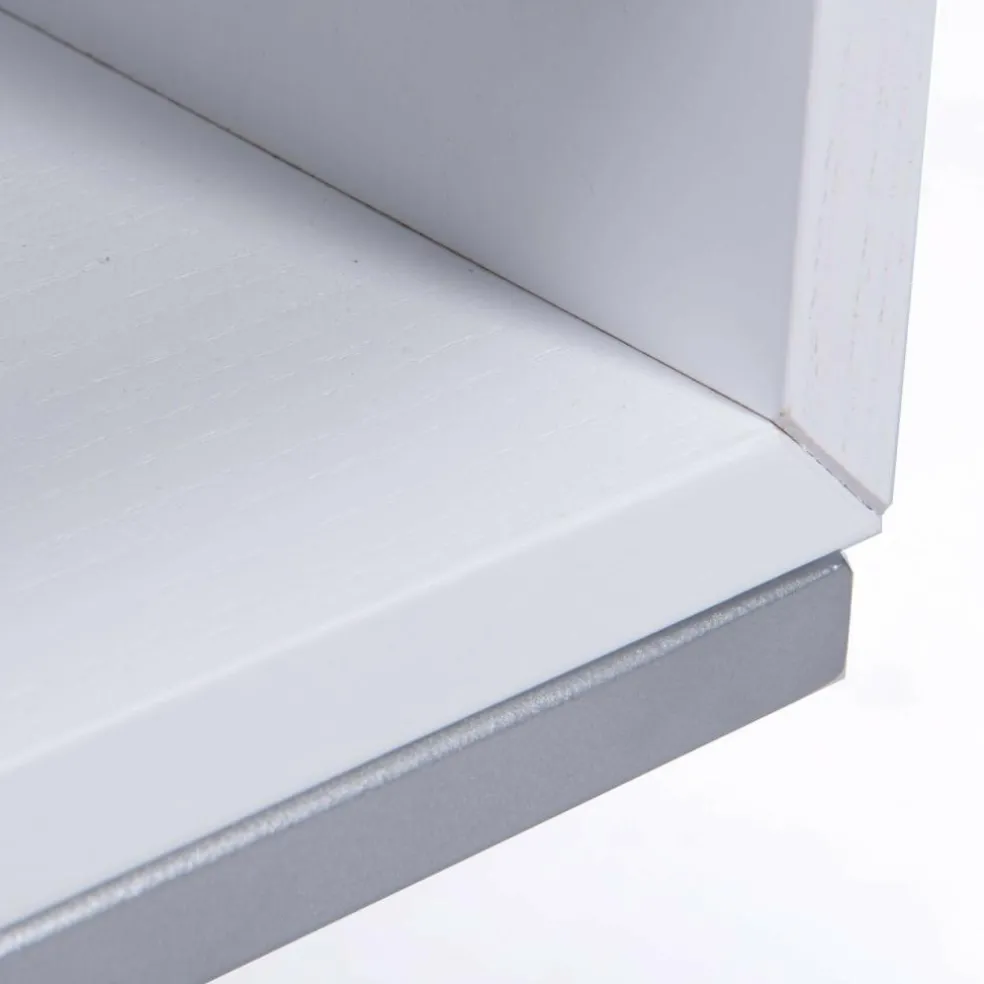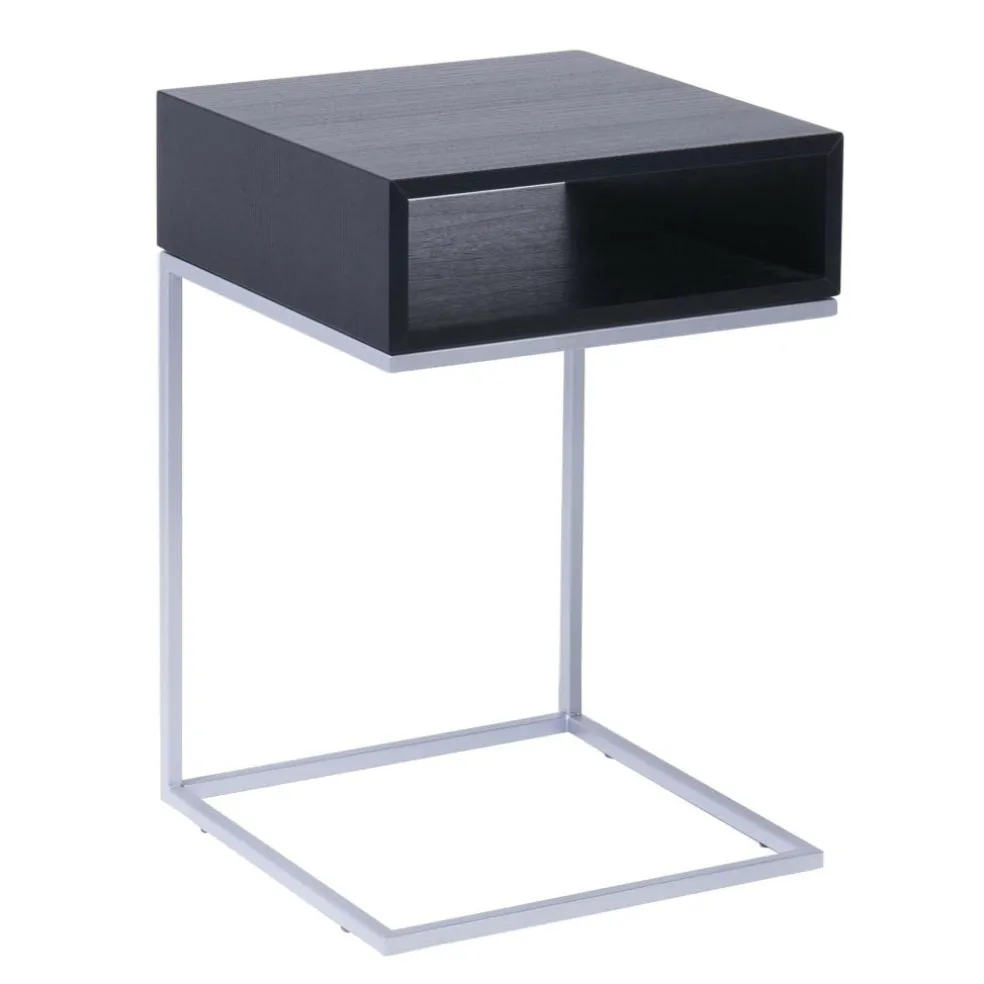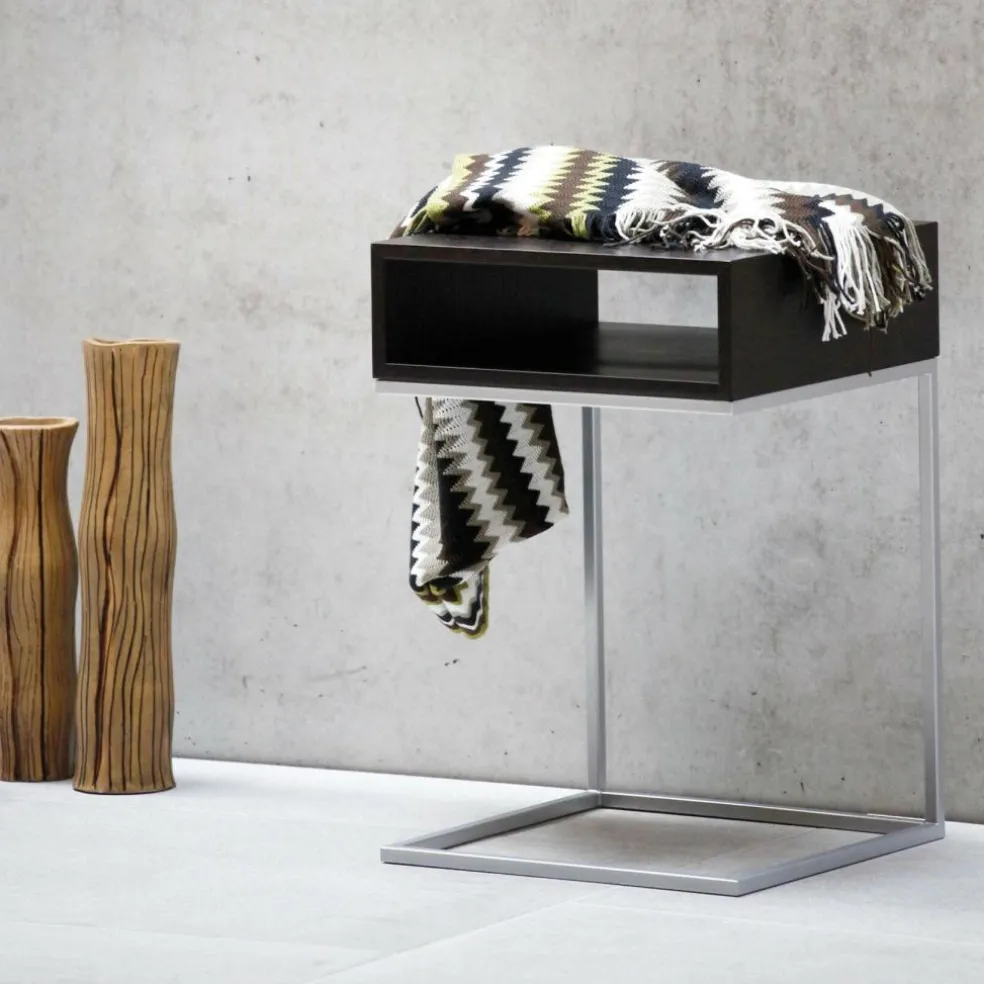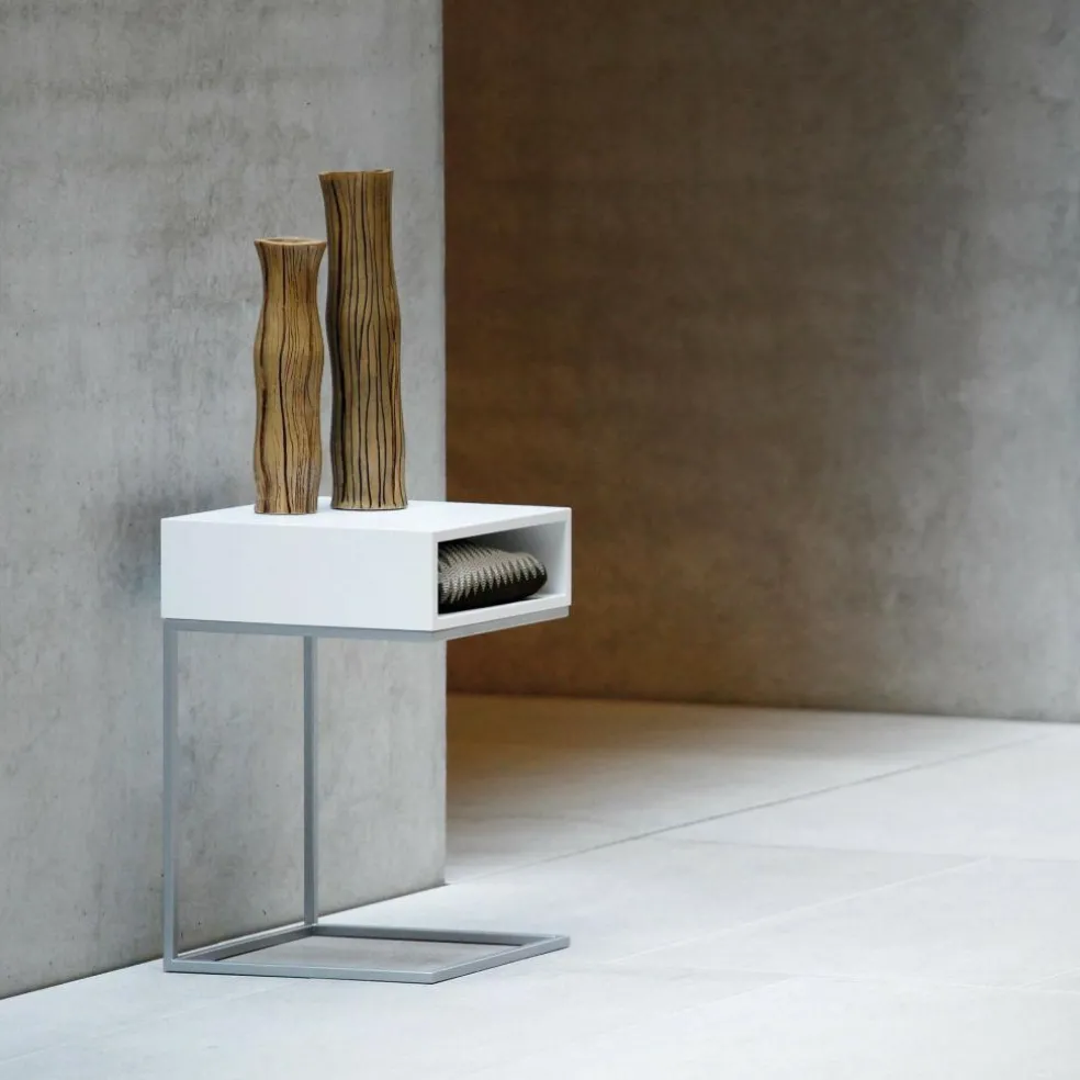 Ein Kästchen aus weiß lackiertem oder wenge gebeiztem Eichefurnier wird von einem filigranen Gestell aus silberfarbenem Stahl getragen. Im Staufach mit der Innenhöhe von 10 cm lassen sich Zeitschriften, Schlüssel und anderer Kleinkram ablegen – obenauf finden schöne Deko-Elemente eine würdevolle Präsentationsfläche. Aufgrund des seitlich angeordneten Fußes kann der Dina Beistelltisch auch ganz nah an Ihr Sofa oder das Bett geschoben werden – auf diese Weise sind die dort abgelegten Utensilien immer griffbereit. Und damit gar nicht erst Neid aufkommt: Einfach zwei bestellen, dann kann sich jeder dieses praktische Kleinmöbel an die Seite stellen.