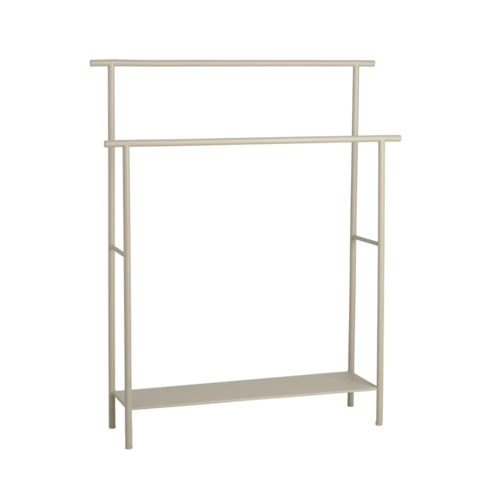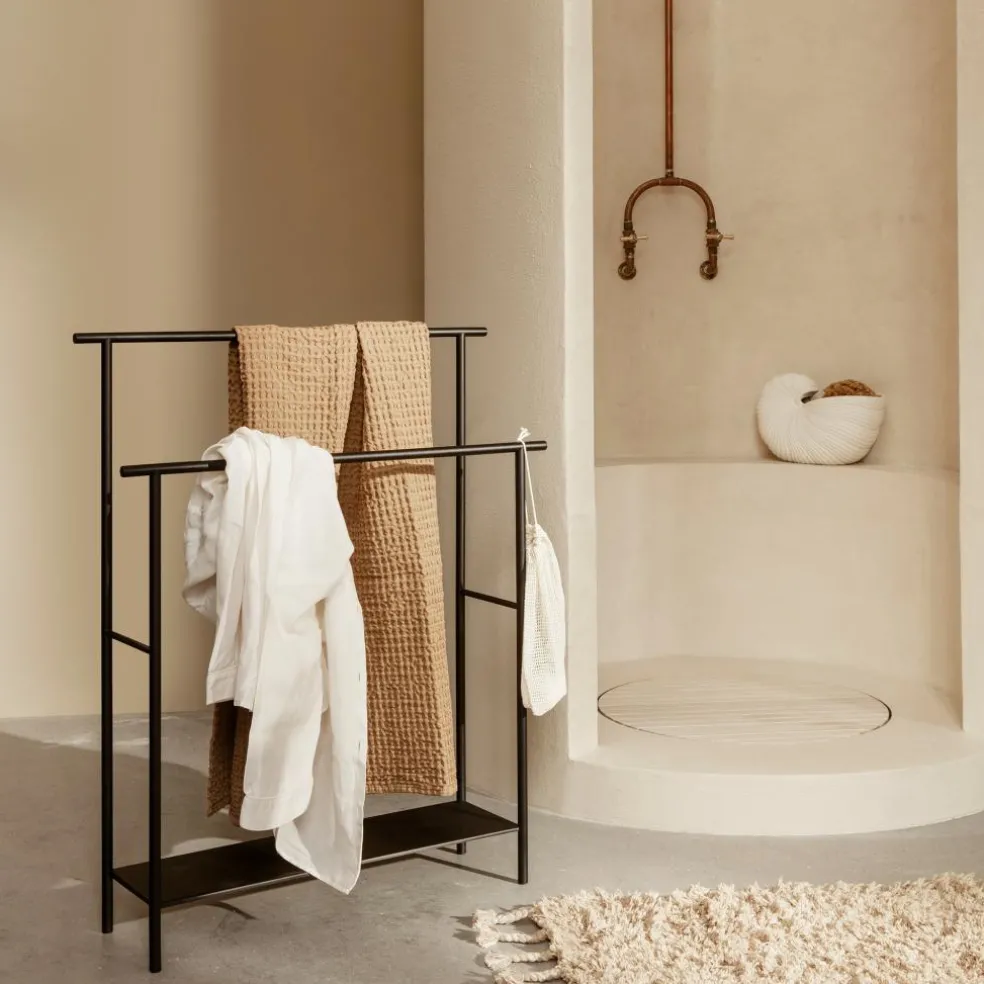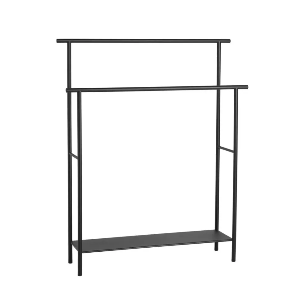 Sein funktionales Design macht den Dora Handtuchhalter zur praktischen Allround-Ablage. Denn auf seinen Stangen, die in unterschiedlichen Höhen zur Ablage dienen, können nicht nur Bade- und Handtücher, sondern auch Kleidung oder nützliche Badezimmerutensilien aufgehängt werden. Darüber hinaus bietet der Dora Handtuchhalter zusätzlichen Stauraum auf einer großzügigen Ablagefläche. Das Gestell ist aus pulverbeschichtetem Rundstahl gefertigt. Es besteht aus zwei Querstangen, die jeweils auf zwei Beinen sitzen und den oberen Abschluss zweier Rahmen bilden. Mithilfe dünner Querverstrebungen werden diese Rahmen zusammengehalten. Der untere Bereich wird durch den eingesetzten Regalboden stabilisiert, der sich über die gesamte Breite des Dora Handtuchhalters erstreckt. Mit seinen schlanken Stahlstangen fügt sich das Möbel diskret in seine Umgebung ein. Es ist dank seiner geringen Tiefe platzsparend und passt nicht nur ins Bad, sondern auch in einen Vorraum oder eine Garderobe.