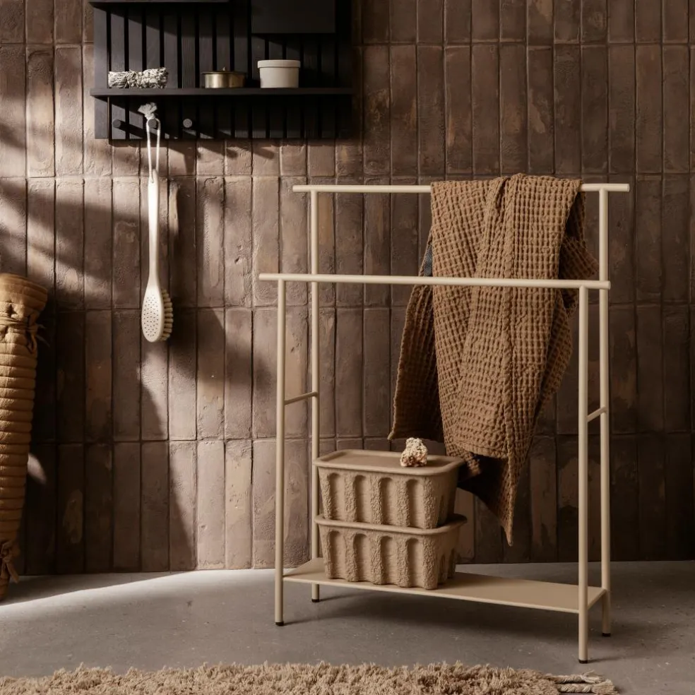 Der Dora Handtuchhalter wurde für die Marke Ferm Living entworfen. Er ist Teil einer Kollektion von praktischen Ablagemöbeln. Deren Designkonzept geht auf die Gestalt des Dora-Kleiderständers zurück, der als frei stehendes Möbel für den Einsatz in Nassräumen konzipiert ist.