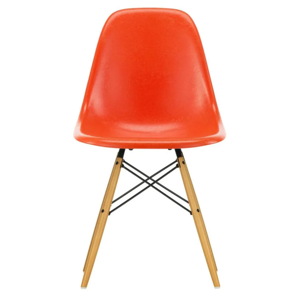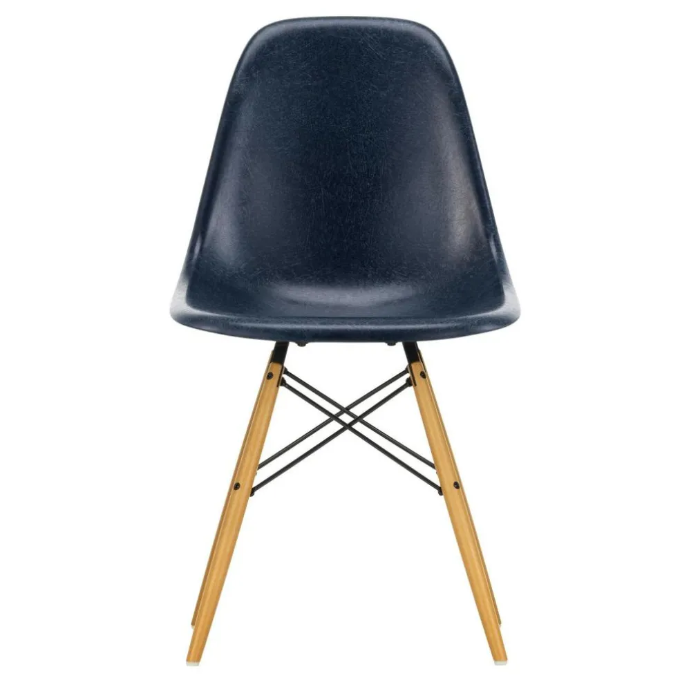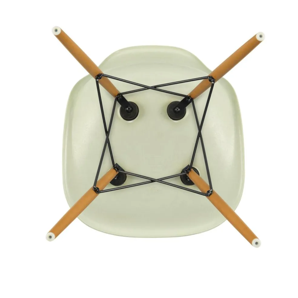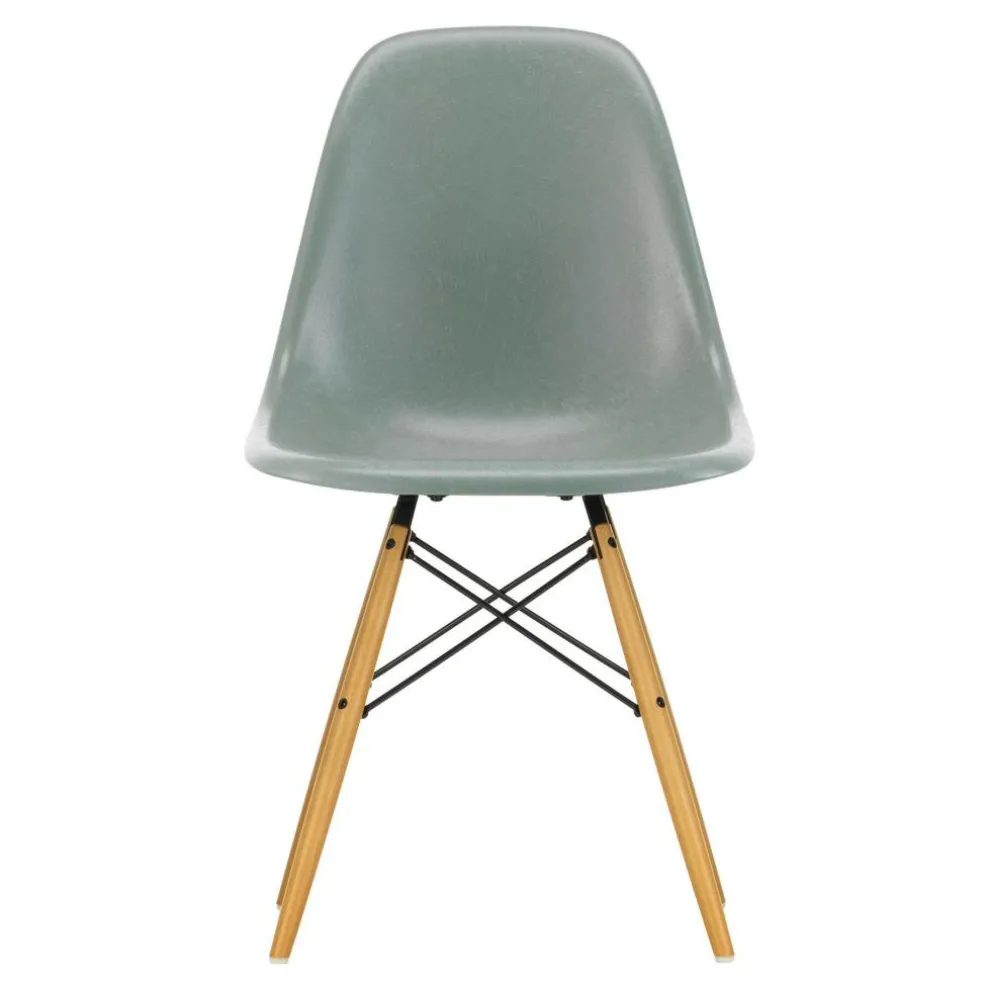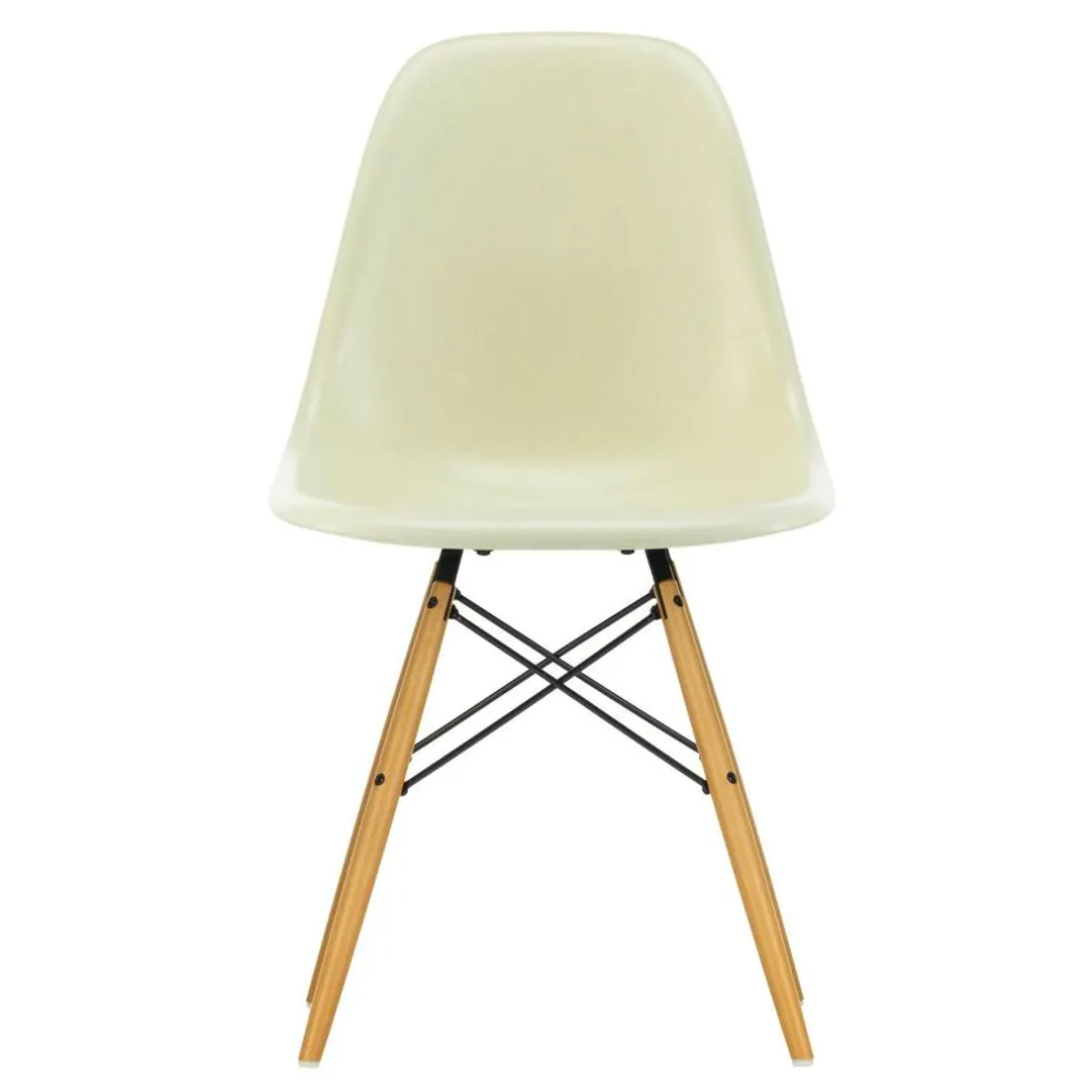 Der Eames Fiberglass Side Chair DSW Ahorn gelb wurde von den Designern Ray Eames und Charles Eames für den Hersteller Vitra entworfen. Der Stuhl gehört zur Produktfamilie der Eames Fiberglass Chairs, die bereits im Jahr 1948 beim Wettbewerb International Competition for Low-Cost Furniture Design, der vom New Yorker Museum of Modern Art initiiert wurde, mit einem Preis ausgezeichnet wurde. Das Konzept der Eames Fiberglass Chairs basiert auf der Idee, eine körpergerecht geformte Sitzschale mit individuellen Untergestellen zu kombinieren.