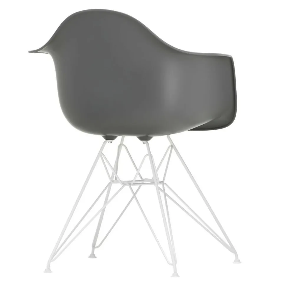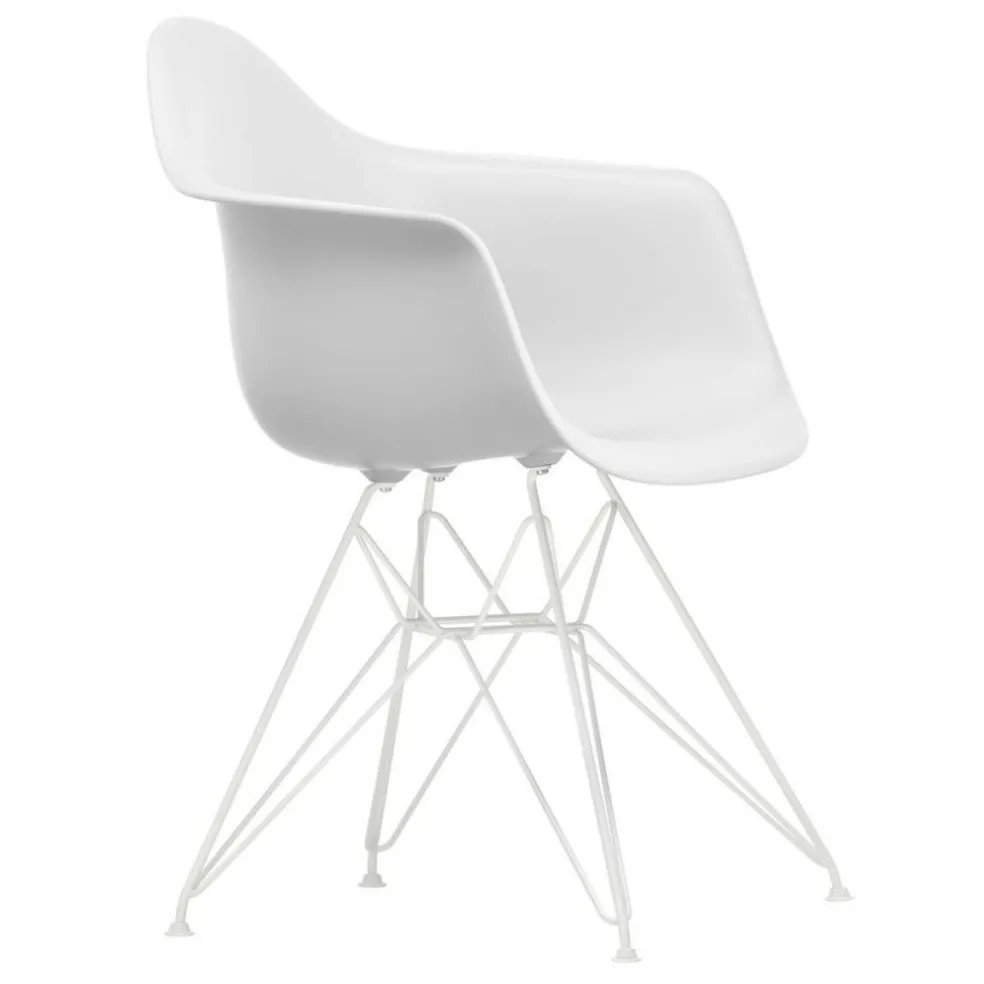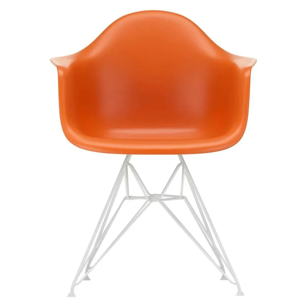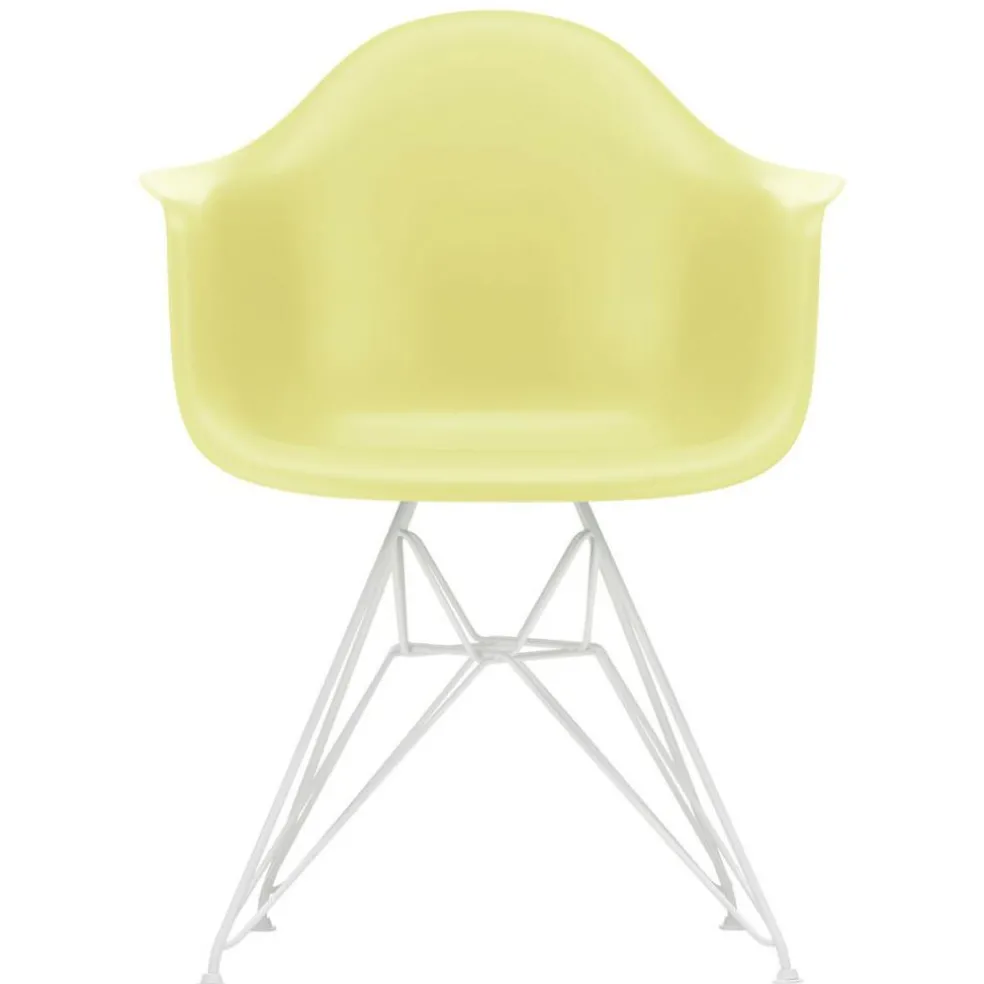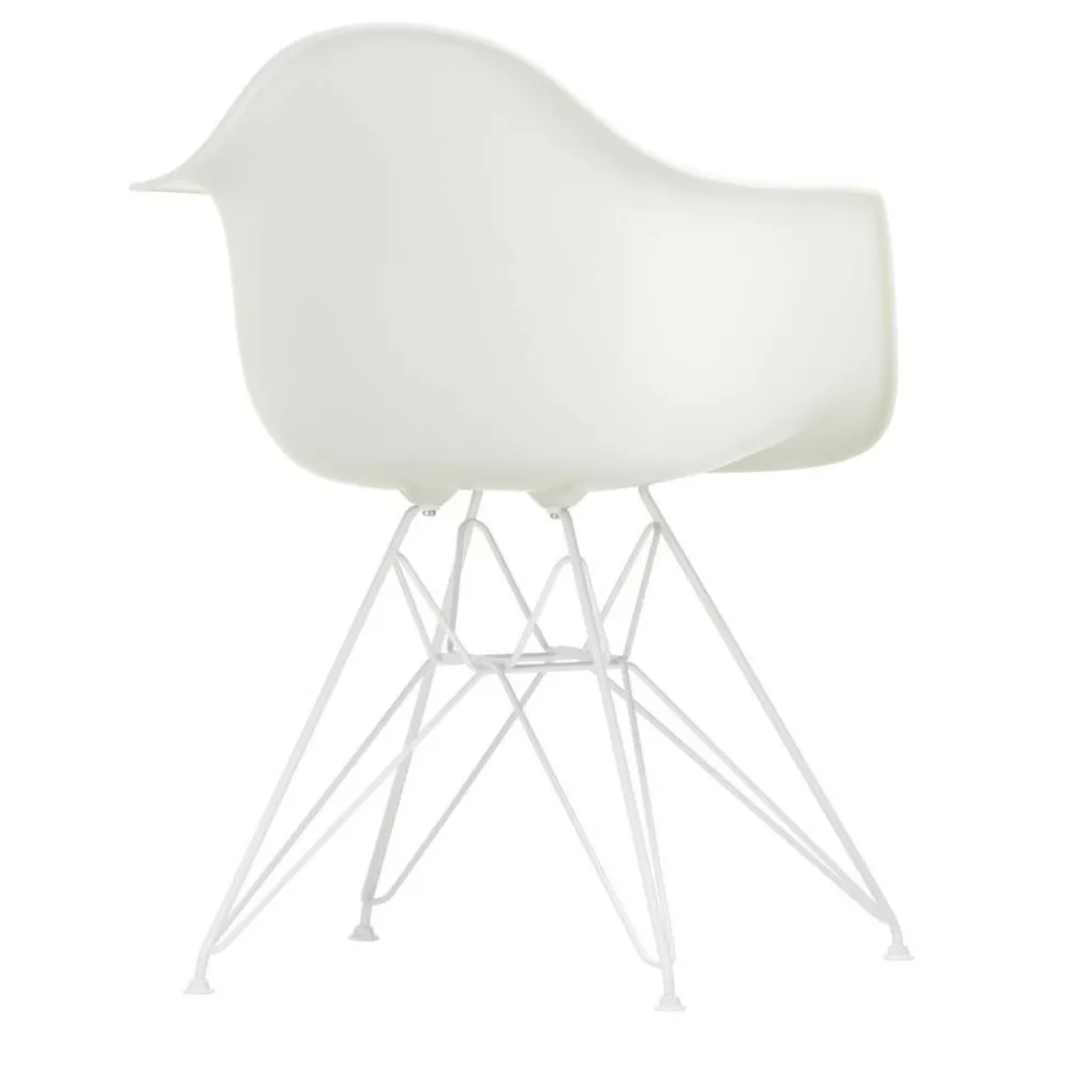 Mit seinem hochwertigen Kunststoffsitz und dem an die Konstruktion des Eiffelturms erinnernden Gestell ist der Eames Plastic Armchair DAR RE Gestell weiß ein attraktiver Hingucker in jedem modernen Interieur. Die Schale mit ihrer großzügigen Form, der hoch geschwungenen Rücken und die breiten Auflageflächen der Armlehnen versprechen einen bequemen Sitzkomfort, während der filigrane Unterbau aus robustem, pulverbeschichtetem Stahldraht dem Designstück einen leichten Touch verleiht. Die Oberfläche des Sitzes aus recyceltem Kunststoff kann aufgrund der Materialzusammensetzung reizvolle Farbsprenkel aufweisen. Der Eames Plastic Armchair DAR RE Gestell weiß passt auf die Terrasse oder ins Wohnzimmer und eignet sich für eine Bar, ein Designhotel oder den Wartebereich einer Praxis.