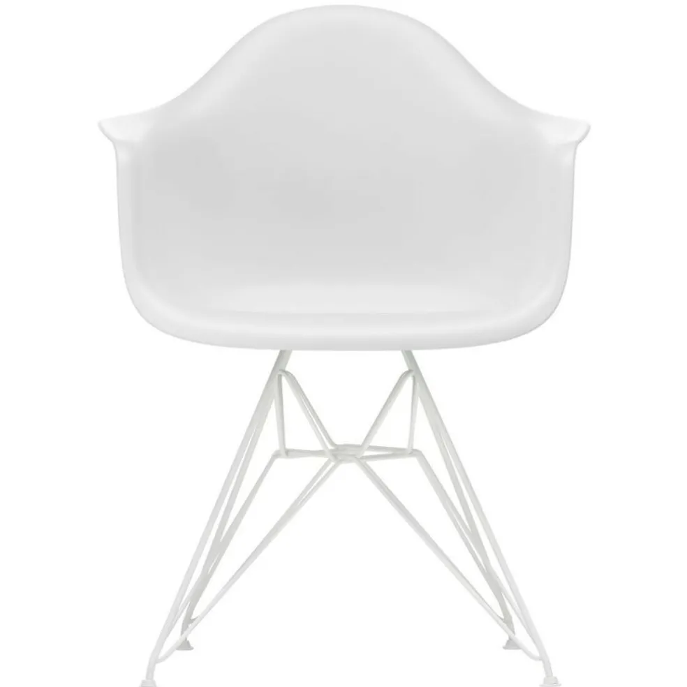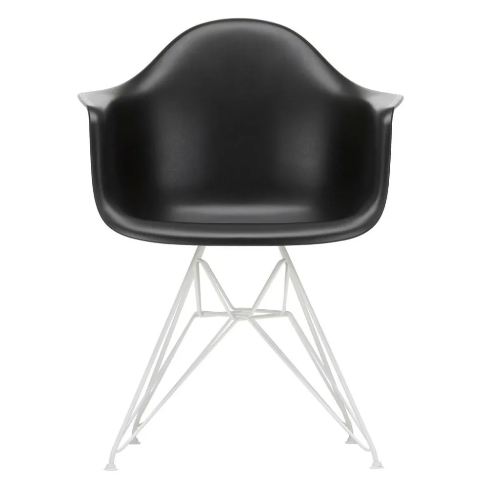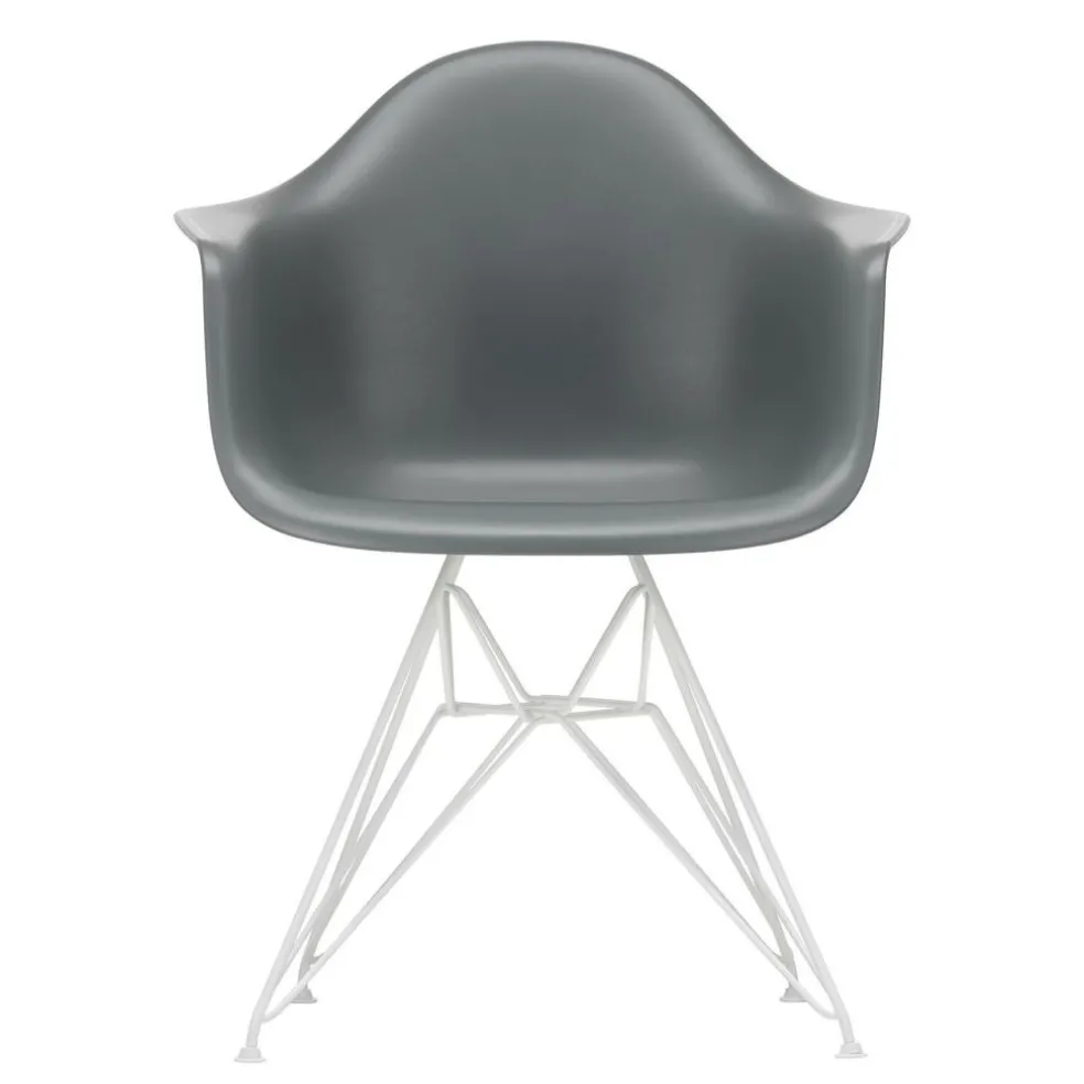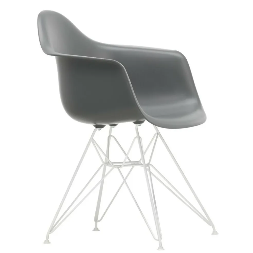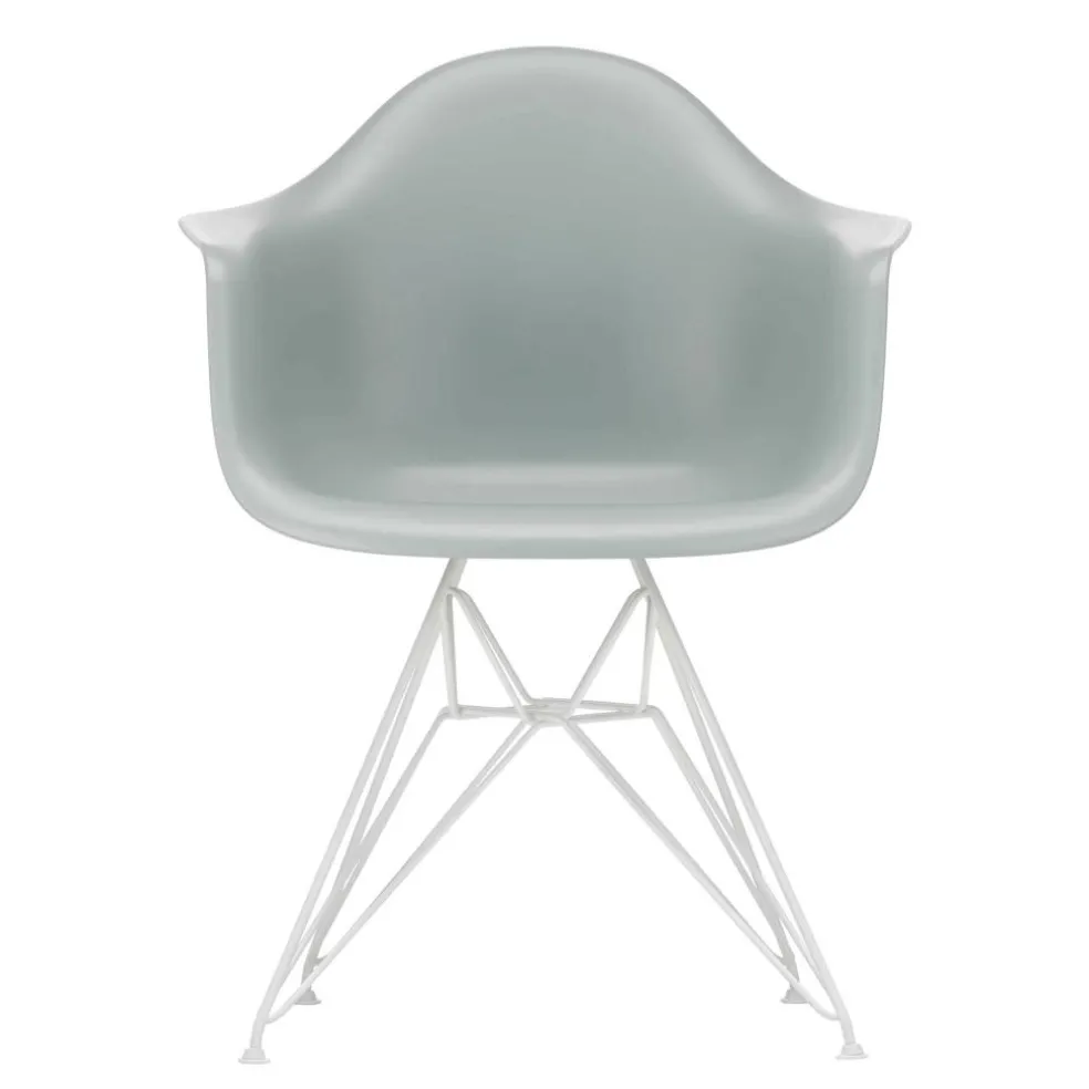 Mit seinem hochwertigen Kunststoffsitz und dem an die Konstruktion des Eiffelturms erinnernden Gestell ist der Eames Plastic Armchair DAR RE Gestell weiß ein attraktiver Hingucker in jedem modernen Interieur. Die Schale mit ihrer großzügigen Form, der hoch geschwungenen Rücken und die breiten Auflageflächen der Armlehnen versprechen einen bequemen Sitzkomfort, während der filigrane Unterbau aus robustem, pulverbeschichtetem Stahldraht dem Designstück einen leichten Touch verleiht. Die Oberfläche des Sitzes aus recyceltem Kunststoff kann aufgrund der Materialzusammensetzung reizvolle Farbsprenkel aufweisen. Der Eames Plastic Armchair DAR RE Gestell weiß passt auf die Terrasse oder ins Wohnzimmer und eignet sich für eine Bar, ein Designhotel oder den Wartebereich einer Praxis.