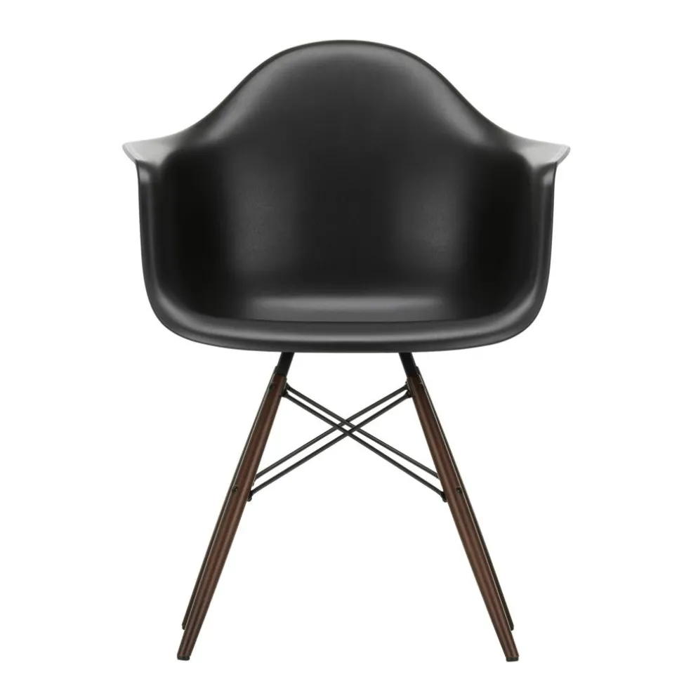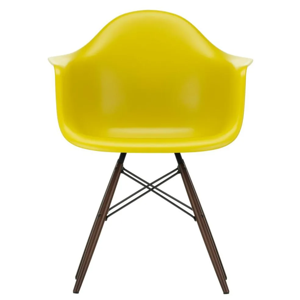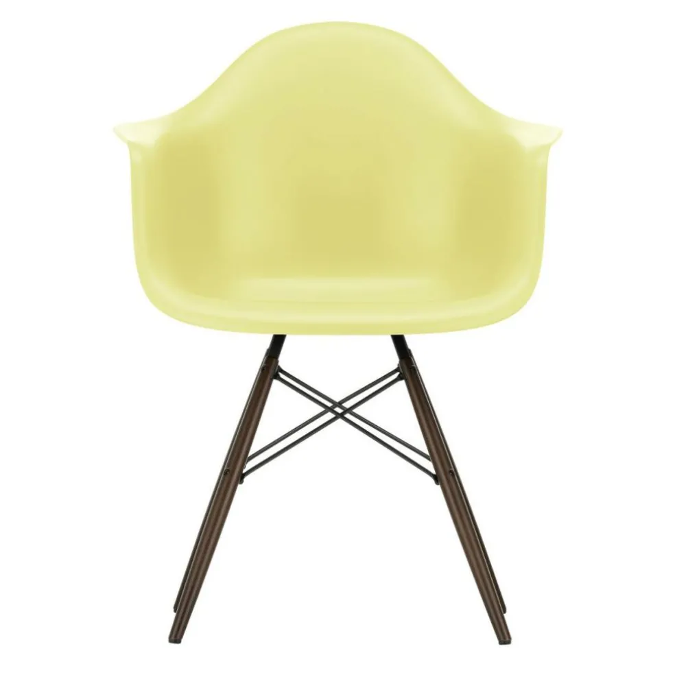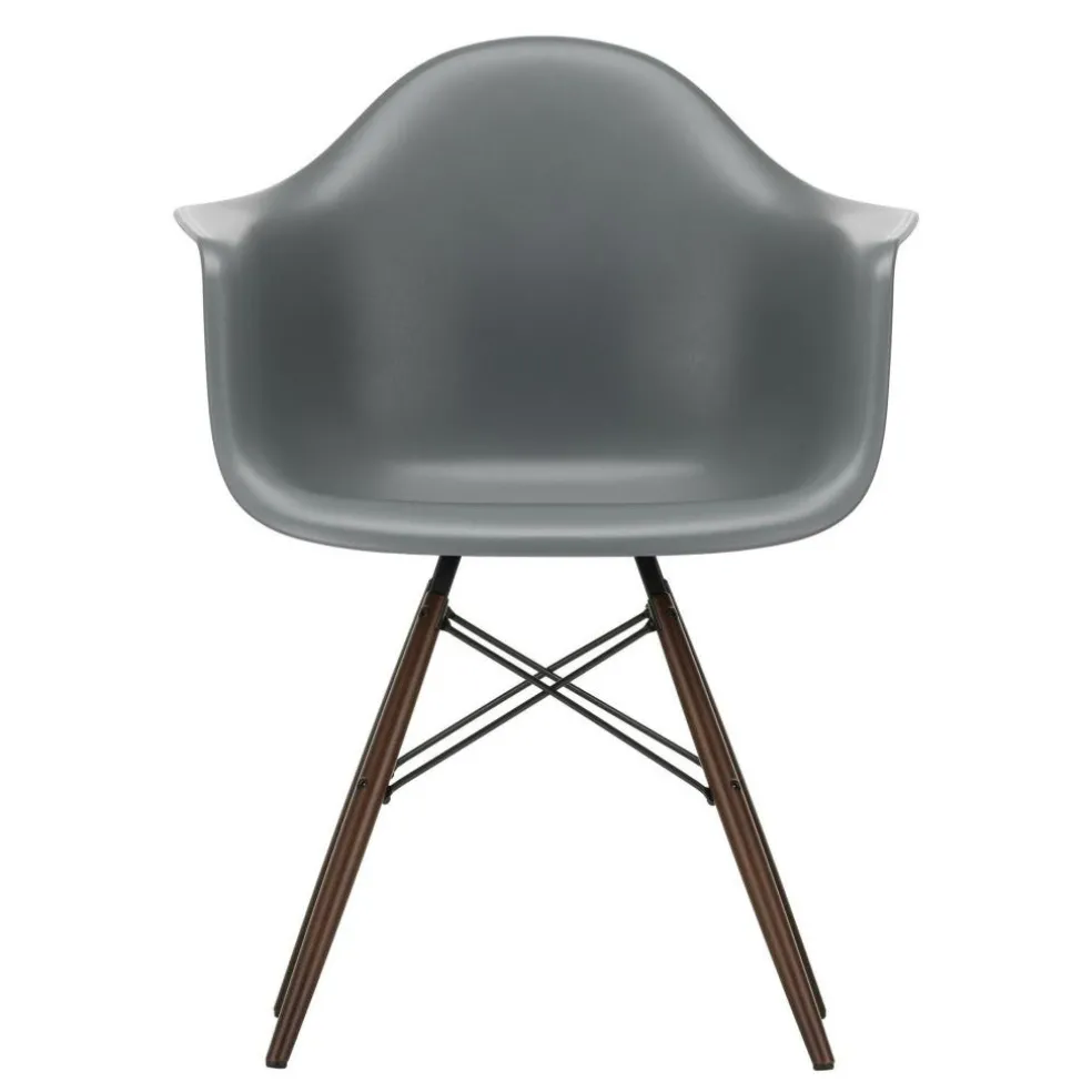 Der Eames Plastic Armchair DAW RE Ahorn dunkel wurde von Ray und Charles Eames für die Marke Vitra entworfen. Er ist Teil einer Serie von Stühlen, die ikonische Designs aus 1950 verwenden und Sitzschalen aus Kunststoff mit verschiedenen Untergestellen kombinieren. Das DAW-Modell beeindruckt mit einer Basis aus Holz. Mit ihrer nachhaltigen Materialwahl präsentieren sich die Eames-Plastic-Armchairs zeitgemäß.