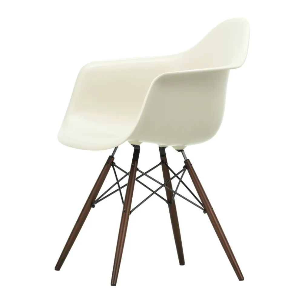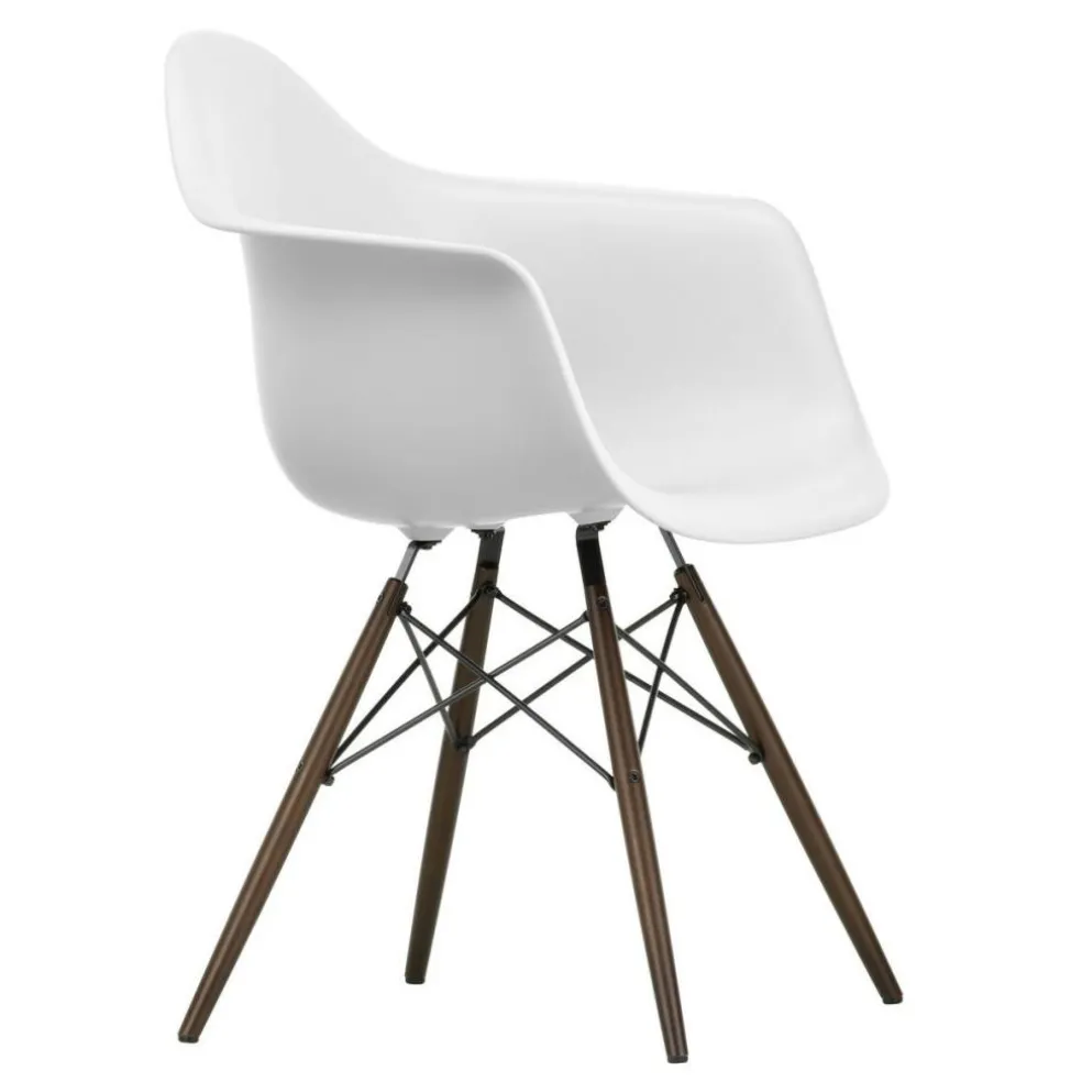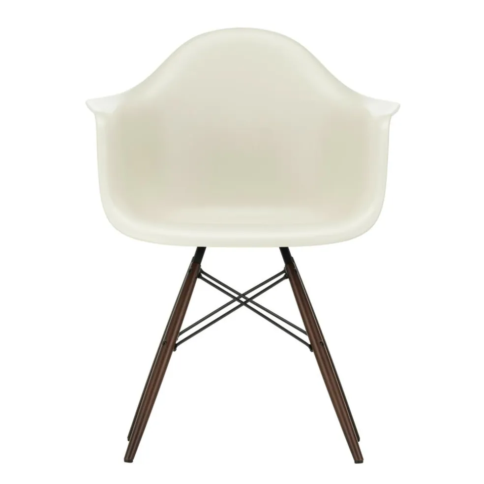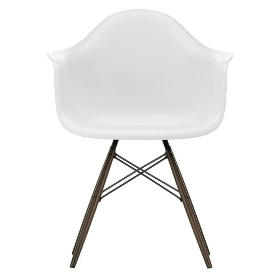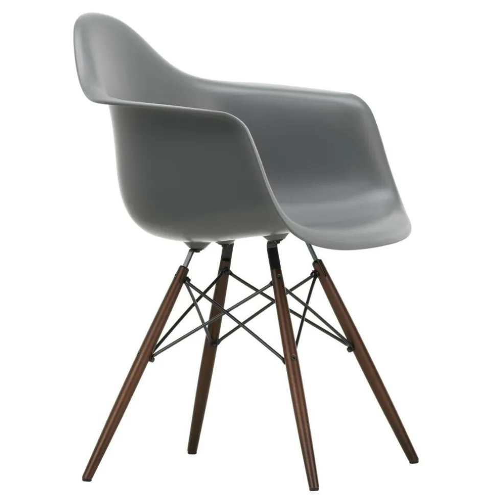Der Eames Plastic Armchair DAW RE Ahorn dunkel wurde von Ray und Charles Eames für die Marke Vitra entworfen. Er ist Teil einer Serie von Stühlen, die ikonische Designs aus 1950 verwenden und Sitzschalen aus Kunststoff mit verschiedenen Untergestellen kombinieren. Das DAW-Modell beeindruckt mit einer Basis aus Holz. Mit ihrer nachhaltigen Materialwahl präsentieren sich die Eames-Plastic-Armchairs zeitgemäß.