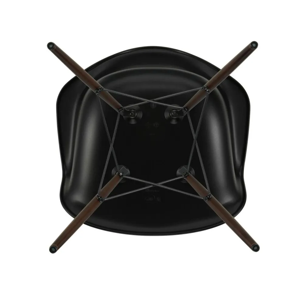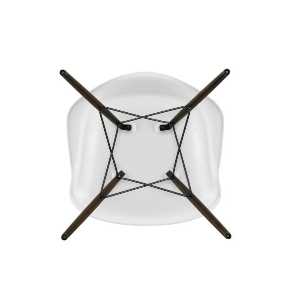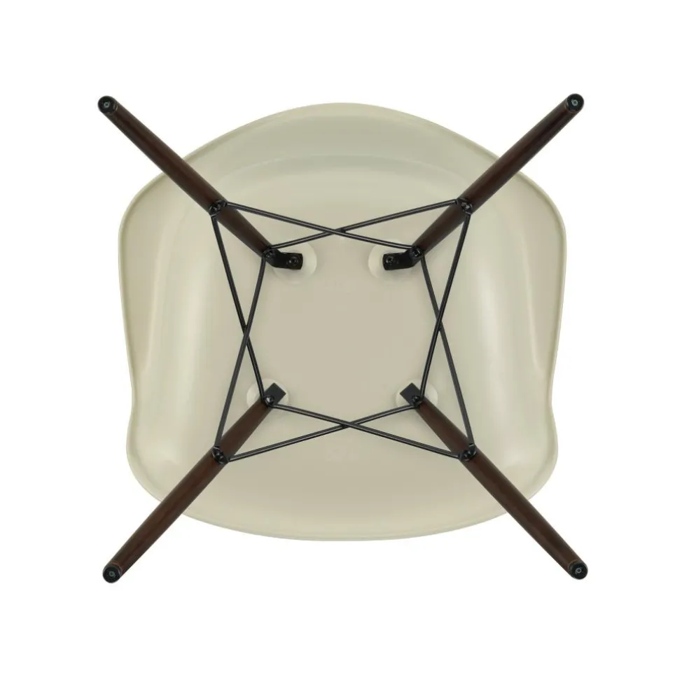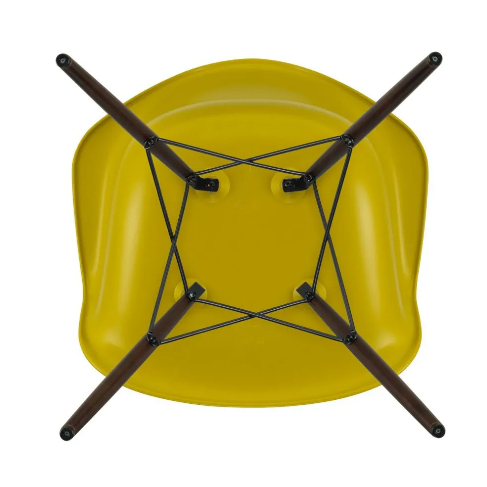 Ein großzügiger, ergonomisch geformter Schalensitz macht den Eames Plastic Armchair DAW RE Ahorn dunkel zu einem bequemen Sitzmöbel, das mit seinem auffälligen Unterbau einen attraktiven Blickfang darstellt. Das vierbeinige Gestell setzt sich aus konisch geschnittenen Stäben aus Ahornholz zusammen. Eine kreuzweise Verstrebung aus Stahldraht schenkt der Konstruktion eine stabile Belastbarkeit. Die Beine sind mit Filzgleitern versehen. So eignet sich der Eames Plastic Armchair DAW RE Ahorn dunkel für harte Böden in einem Warteraum, Café oder im Wohnzimmer. Dabei zeigt die Schale aus recyceltem Post-Consumer-Kunststoff kleine Farbsprenkel, was dem Designstuhl einen individuellen Charakter verleiht.