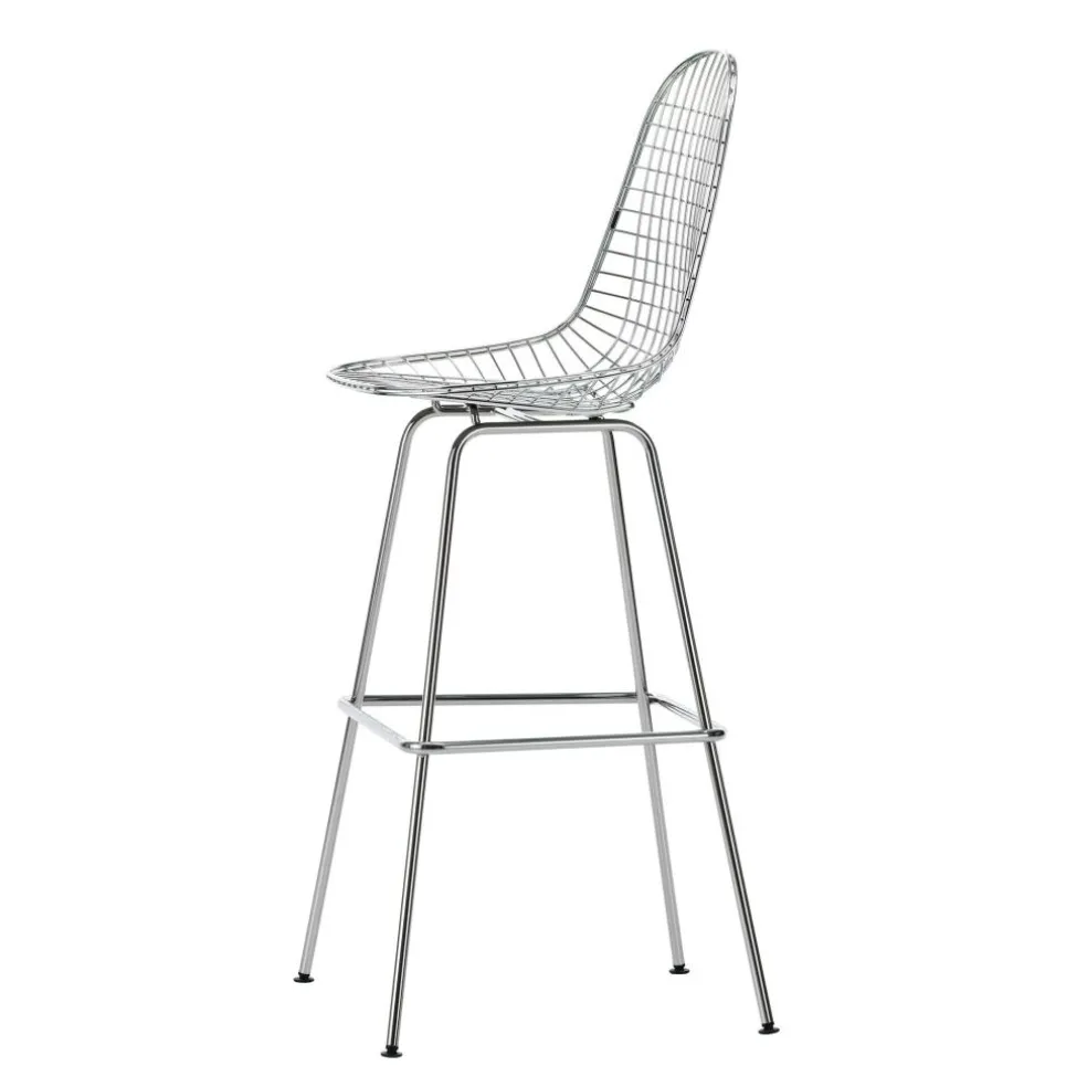 Hergestellt aus hochwertigem Rundstahl und mit einer verchromten oder pulverbeschichteten Oberfläche versehen, eignet sich der Eames Wire Barstuhl hoch nicht nur für die Verwendung im Innenraum. Sein witterungsbeständiges Material ist auch für den Einsatz im Freien geschaffen. So passt der stylishe Barstuhl in ein Straßencafé oder in eine Outdoorbar sowie in die Bürokantine oder in den Barkeller daheim. Dabei stellt das regelmäßige Gitternetz seines Sitzes einen auffälligen Blickfang dar. Ergänzt wird das attraktive Designstück durch ein robustes Untergestell, das aus schlankem Rundstahl gebogen ist. Weit ausgestellte Beine mit Filzgleitern schenken der Konstruktion eine hohe Stabilität. Eine rundum laufende Fußraste erhöht nicht nur die Belastbarkeit des Barmöbels, sie ermöglicht auch einen komfortablen Sitz.