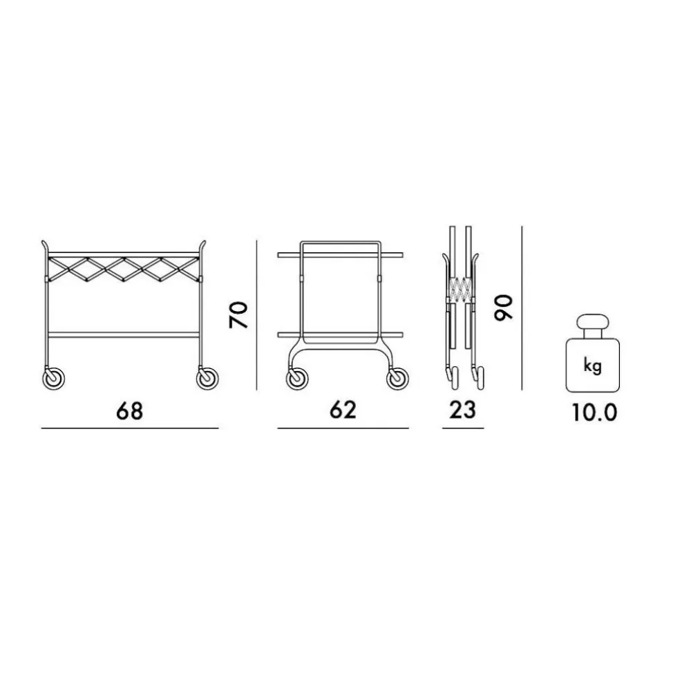 Der Gastone Servierwagen klappbar matt wiegt 10 kg. Zusammengeklappt ist er nur 23 cm tief und 90 cm. Wenn das Modell auseinandergeklappt ist, beträgt die Höhe 70 cm. Das Modell ist dann 68 cm breit und 62 cm tief.