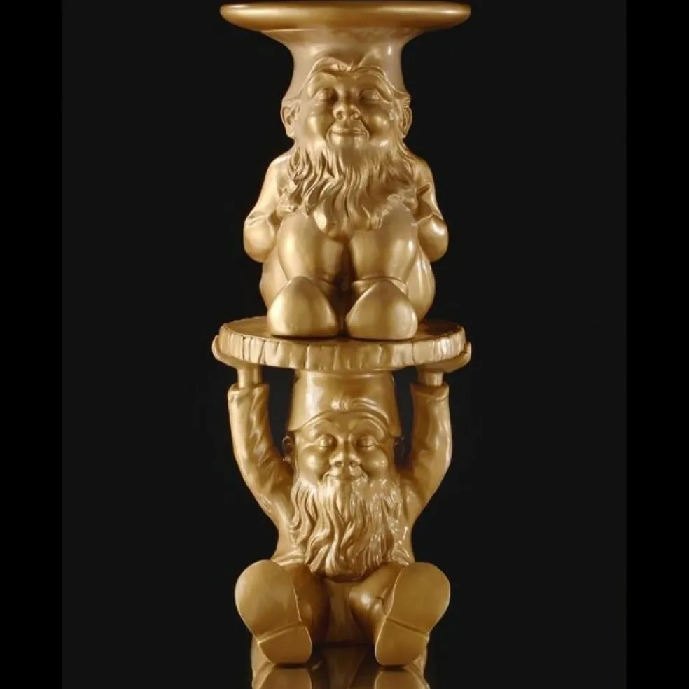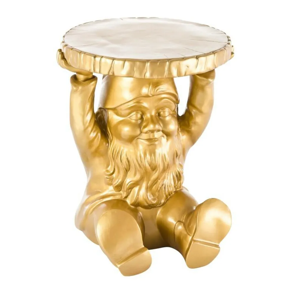 Napoleon, Attila und Saint-Esprit sind die Namensgeber des Gnomes/Zwerg Beistelltisches.Eine niedliche Zwergenfigur dient bei den Varianten Napoleon und Attila als Basis. Bei der Attila-Version hält der Zwerg die Tischplatte mit erhobenen Händen, bei der Napoleon-Version sitzt sie auf dem Kopf. Der Saint-Esprit-Tisch ähnelt einem Baumstamm. Es gibt den Gnomes/Zwerg Beistelltisch einfarbig oder bunt. Man kann den Tisch als nützliche Ablage und als Hocker verwenden. Doch auch als Dekorationsobjekt wird er gerne eingesetzt. Er besteht aus thermoplastischem Technopolymer. Wird der Gnomes/Zwerg Beistelltisch einmal schmutzig oder nass, kann er mit einem weichen Tuch abgewischt werden.