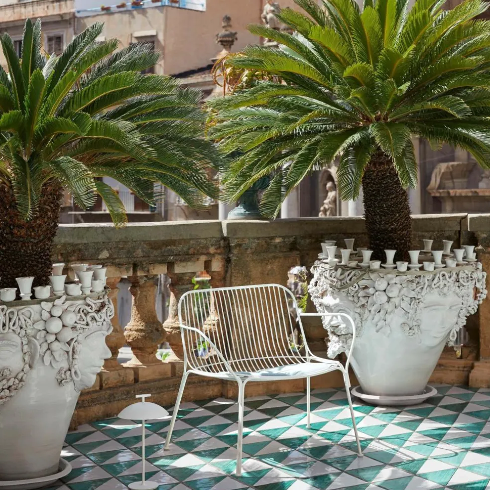 Der Hiray Lounge Gartenarmlehnstuhl wurde von Ludovica Palomba & Roberto Palomba für die Marke Kartell entworfen. Die Designer spielen gekonnt mit dem Material Metall.
