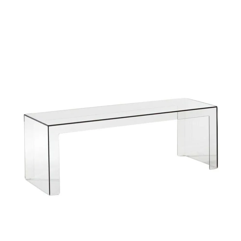 Obwohl der Invisible Side Beistelltisch durchsichtig ist, kann man ihn kaum übersehen. Allerdings scheint es so, als ob auf der Tischplatte abgestellte Gegenstände im Raum schweben, wenn man nicht genau hinsieht. Der Tisch ist schlicht geformt und sieht wie eine Bank aus. Rechts und links ist die Tischplatte zu zwei Standfüßen nach unten geknickt. Der Invisible Side Beistelltisch vereint Anmut und Funktionalität. Diese Kombination hat Fachjurys begeistert, die dem Modell im Jahr 2012 den begehrten Designerpreis Red Dot Award und den Good Design Award verliehen. Der Invisible Side Beistelltisch besteht aus PMMA. Der pflegeleichte Kunststoff kann mit einem feuchten Tuch gereinigt werden. Besonders gut harmoniert das extravagante Modell mit moderner Einrichtung. Es passt neben die Sofalandschaft im Wohnzimmer, in Büros und viele weitere Orte.