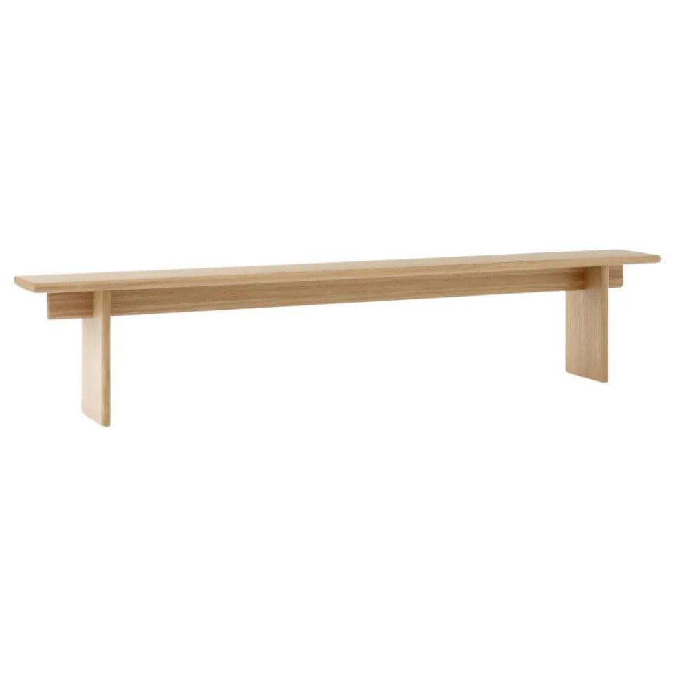 Die Bank besteht aus FSC®-zertifiziertem Eichenfurnier und überzeugt mit einer klaren, schlanken Silhouette. Die breiten Beine und die sichtbare Querstrebe verleihen ihr eine ausgewogene Stabilität, während die Sitzfläche für eine minimalistische Optik sorgt. Gekonnt vereint die schlichte und minimalistische Bank Aspekte des japanischen als auch des skandinavischen Designs. Der verwendete wasserbasierte Lack schützt das Holz und unterstreicht dessen natürliche Schönheit. Mit einer großzügigen Länge von 230 cm bietet die Ita OS6 Bank bequem Platz für mehrere Personen. Ihre Tiefe von 30 cm und Sitzhöhe von 45 cm machen sie zur idealen Ergänzung für Esstische, Flure oder Wohnbereiche. Die 41,5 kg schwere Bank kann sowohl als eigenständiges Sitzmöbel als auch in Kombination mit dem Esstisch der Ita-Kollektion genutzt werden. Die Ita OS6 Bank 230cm wird zur einfachen Selbstmontage geliefert und lässt sich dank ihres durchdachten Stecksystems schnell aufbauen.