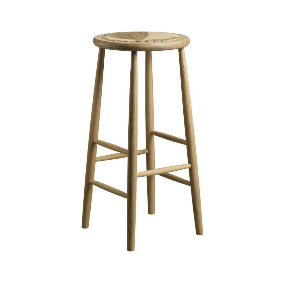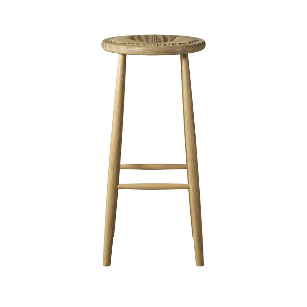 Der J165B Barhocker H75cm eignet sich hervorragend für den Küchentresen, die Hausbar oder ein Lokal. Mit seinem Gespür für nordischen Stil und Sinn für Details geht der dänische Designer an den Entwurf heran. Der J165B Barhocker H75cm weist alle Elemente eines klassischen Barhockers auf: Die Beine sind oben und unten dünner als im Mittelteil. Auf zwei Seiten sind sie mit zwei, auf den anderen Seiten mit je einer Querstrebe verbunden. Darauf lassen sich die Füße bequem abstellen. Der elegante Rahmen des J165B Barhockers H75cm besteht aus noblem Eichenholz. Das Material ist mit dem FSC®-Siegel ausgezeichnet, was ihm die Herkunft aus nachhaltiger Forstwirtschaft attestiert. Die runde Sitzfläche besteht aus Gurtband. Es ist zu einem harmonischen Muster drappiert.