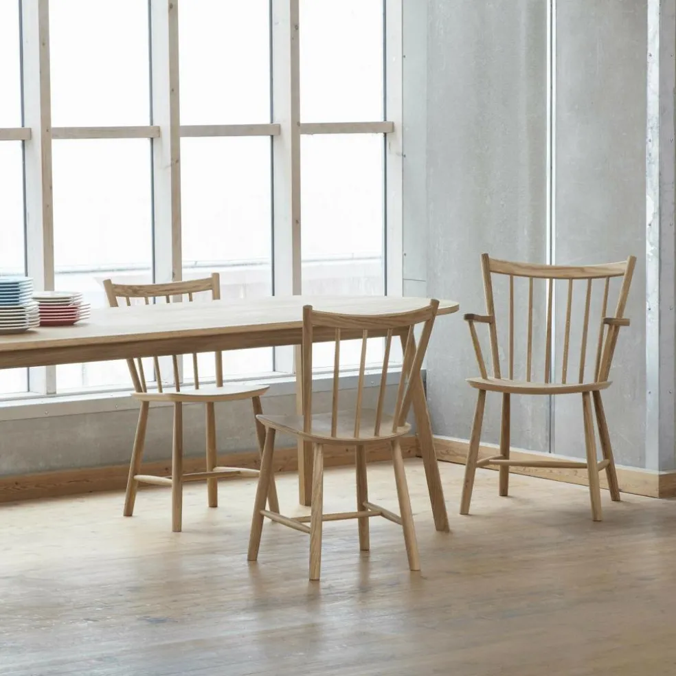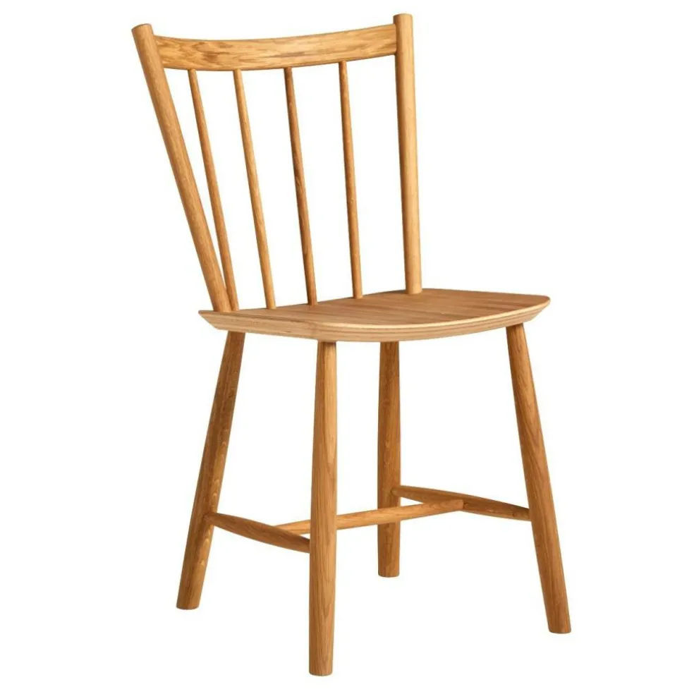 Der J41 Stuhl Eiche besteht aus hochwertigem Eichenholz. Es gibt Varianten mit wasserbasiertem Lack und Stühle, die mit geölter Oberfläche zu haben sind. Das Holz ist mit dem FSC®-Siegel ausgezeichnet. Es sagt aus, dass das Material aus nachhaltiger Forstwirtschaft stammt. Das Gestell des Stuhls besteht aus vier ausgestellten Beinen, die mit Streben miteinander verbunden sind. Die gebogene Rückenlehne ist aus Holzstäben gemacht, die fächerartig im Rahmen befestigt sind. Der J41 Stuhl Eiche eignet sich für jedes Wohn- und Esszimmer. Wegen seines schlichten Entwurfs passt er zu jedem Einrichtungsstil. Am besten lässt er sich mit Holztischen kombinieren.