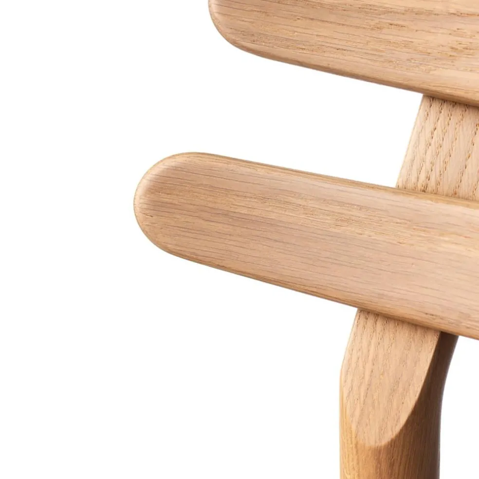 Das Gestell ist aus FSC®-zertifiziertem Eichenholz mit lackierter Oberfläche gearbeitet. Die Lehne und die Sitzfläche bestehen aus Eichenfurnier. Der J48 Stuhl misst 47,5cm Breite, 78,5cm Höhe und 50,5cm Tiefe. Die Sitzhöhe ist 44cm. Er wiegt 6,8kg und kann ein Gewicht bis 100kg tragen.