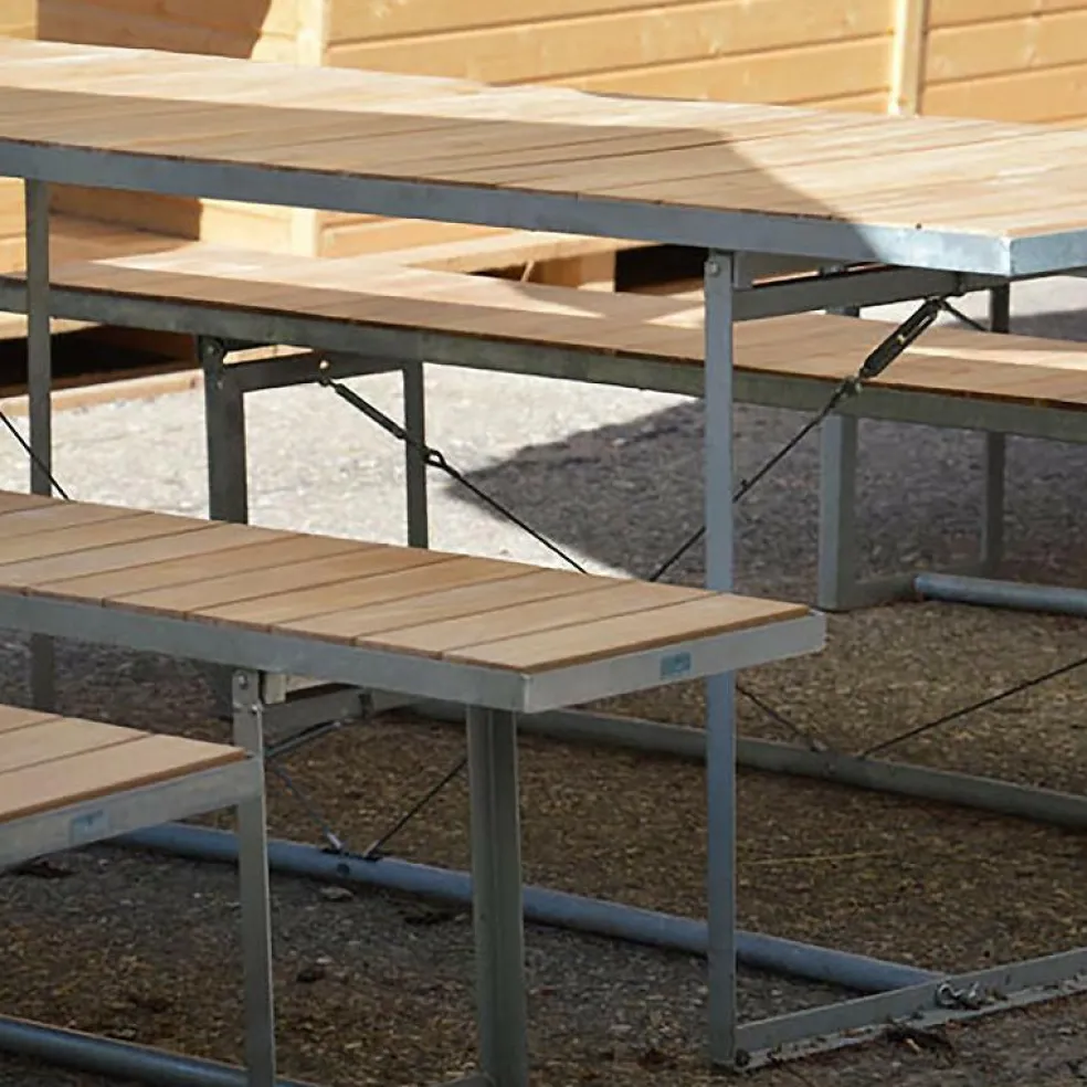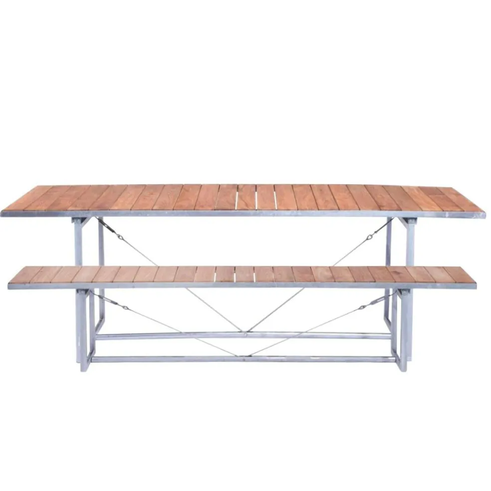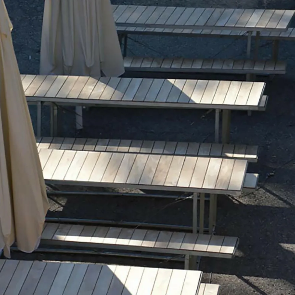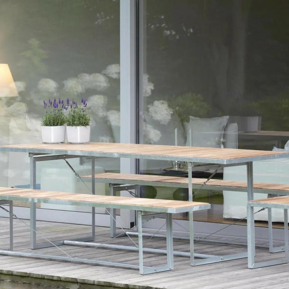 Die Gartenmöbel Jever erinnern an eine klassische Bierbank-Garnitur, strahlen aber weitaus mehr Raffinesse und Eleganz aus. Das Gestell des Jever Tisches und der Bank ist aus feuerverzinktem Stahl gefertigt. Die Querleisten der Jan Kurtz Gartenmöbel aus Holz bestehen aus wetterbeständigen Eichenfurnier.