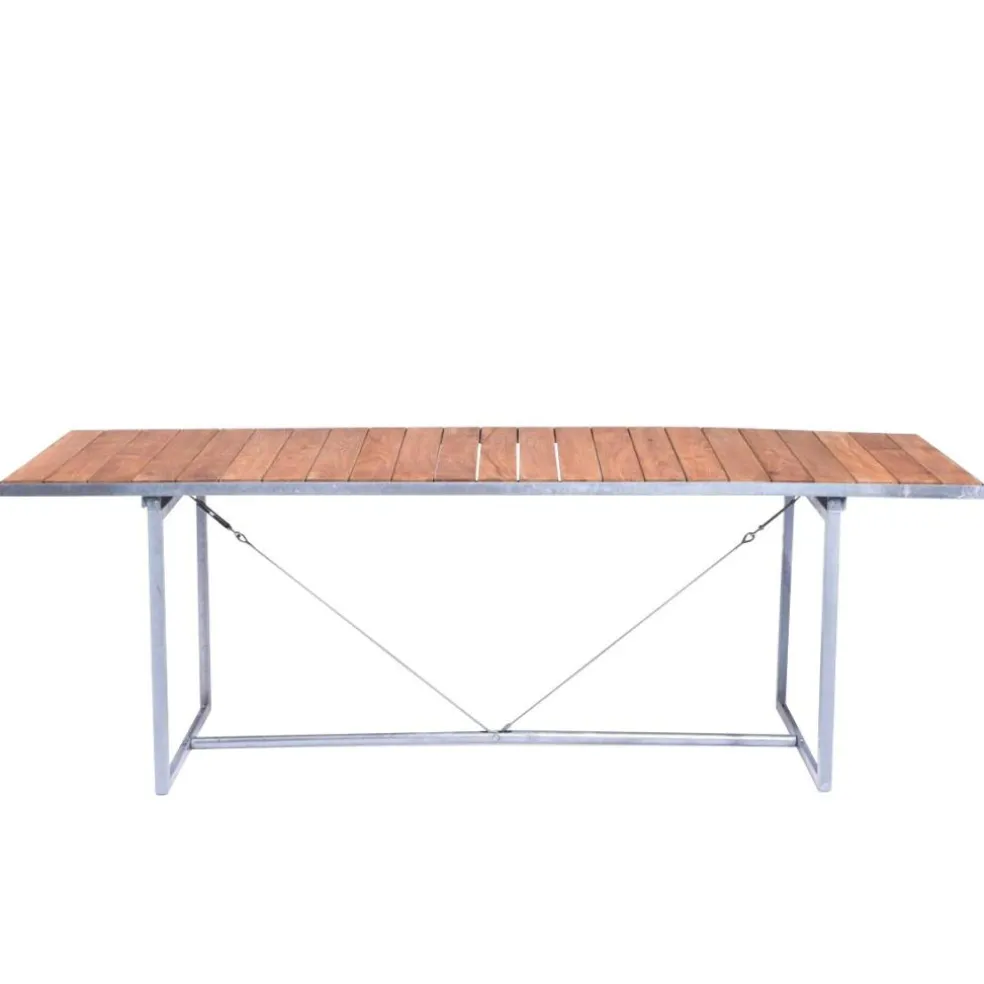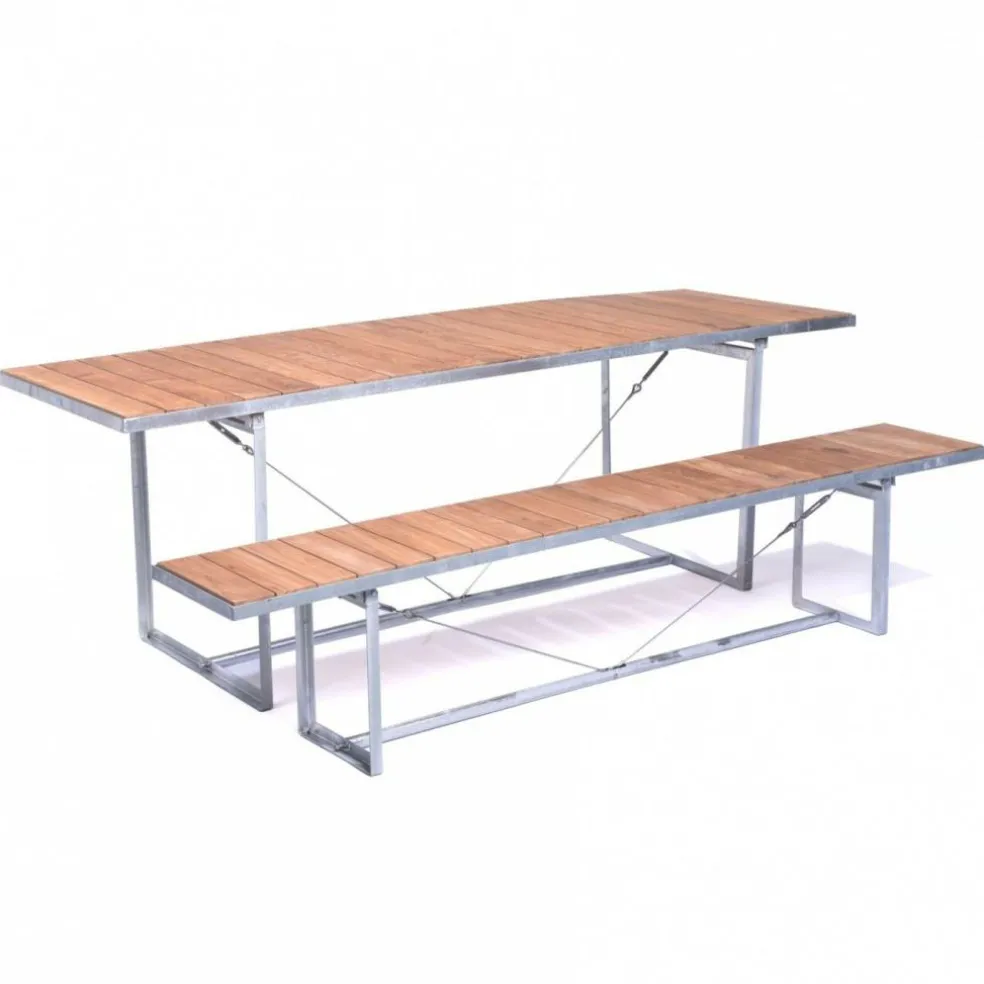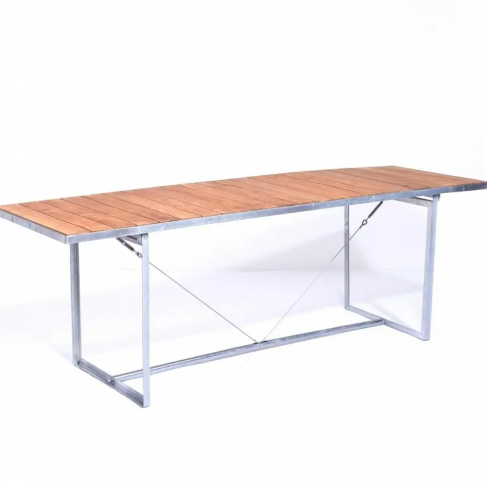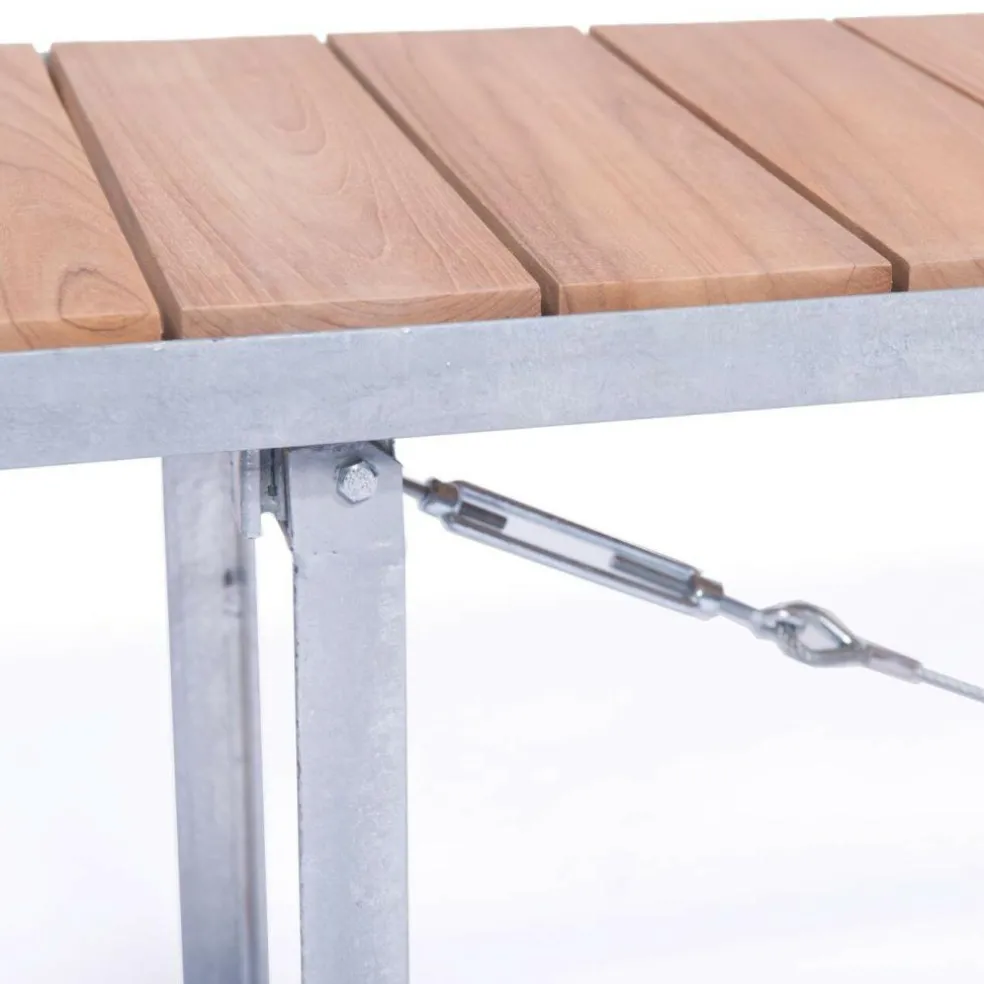 Mit seinen großzügigen Abmessungen bietet der Jever Gartentisch viel Platz für eine Familienrunde oder die Gartenparty mit 10 Personen. Dabei verspricht seine Fläche, die sich aus dicht aneinander gereihten Latten mit einem hochwertigen Eichenfurnier zusammensetzt, eine angenehm sanfte Haptik. Im klaren Kontrast dazu steht das Gestell, das aus unbehandeltem Edelstahl besteht. Die Tischplatte wird von einem Rahmen aus Flachstahl umfasst, der von zwei vertikalen Rahmen getragen wird. Diese sind am Boden mit einem Stahlrohr verstrebt und darüber hinaus mit Stahldrähten diagonal verspannt, was dem Jever Gartentisch eine hohe Stabilität verleiht. Im Handumdrehen aufgestellt, lässt sich das Designmöbel ebenso leicht zusammenklappen und platzsparend verstauen. Damit eignet es sich perfekt für ein Gartenlokal. Zudem passt der Jever Gartentisch genauso gut in ein Atrium am Arbeitsplatz, auf die Terrasse eines Hotels oder in die Wiese daheim.