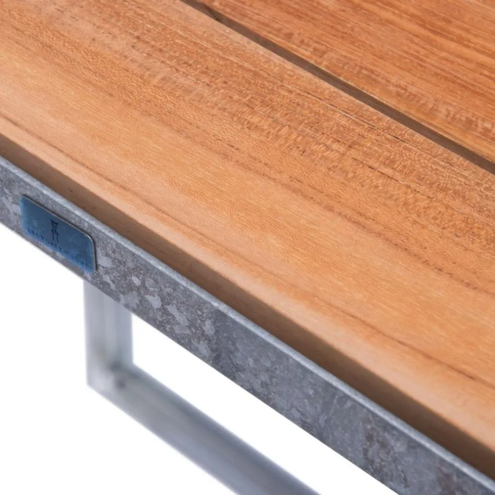 Der Jever Gartentisch wurde von Marcus Hofbauer für die Marke Jan Kurtz entworfen. Inspiriert von den Tragwerken im Industriedesign fällt der Klapptisch mit seiner sichtbaren Konstruktion auf. Seine große Tischfläche lässt an einen Architektentisch denken, die eingelegten Holzlatten erinnern an gesellige Biergärten.