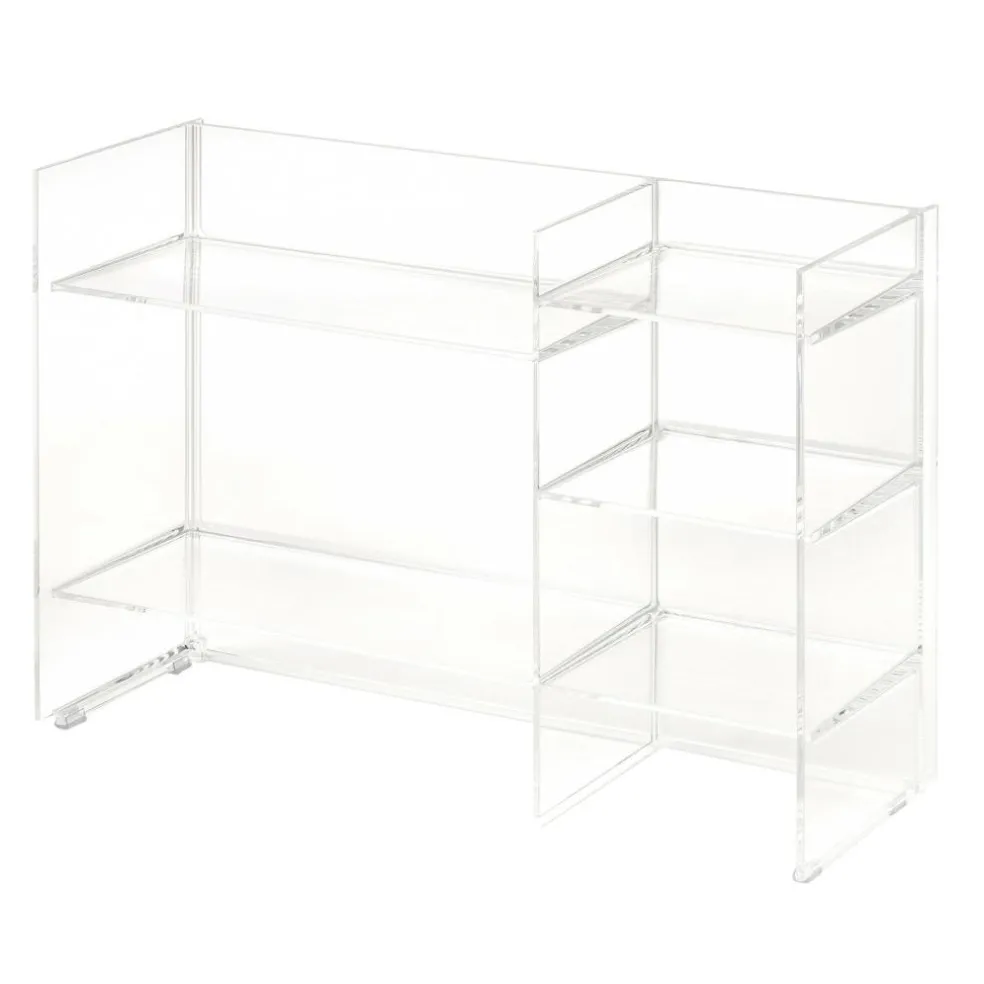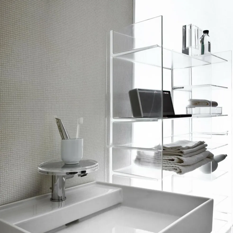 Das Kartell by Laufen Sound-Rack Regal wurde speziell für das Badezimmer konzipiert. Shampoo, Make-up, Rasiergeräte und vieles mehr kann darauf abgelegt werden. Geeignet ist das Kartell by Laufen Sound-Rack Regal auch für jedes weitere Zimmer, wo Stauraum gefragt ist. Das Regal ist zweigeteilt: Die linke Seite ist breiter und mit zwei Einlagebrettern gegliedert. Der schmalere rechte Teil hat drei Einlagebretter. Für das Kartell by Laufen Sound-Rack Regal verwenden die Designer PMMA. Es ist transparent und in verschiedenen durchgefärbten Varianten zu haben. Auf der glasklaren Variante abgelegte Handtücher, Pflegeprodukte und andere Utensilien scheinen im Raum zu schweben.