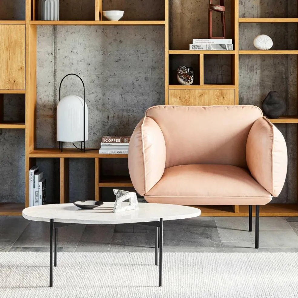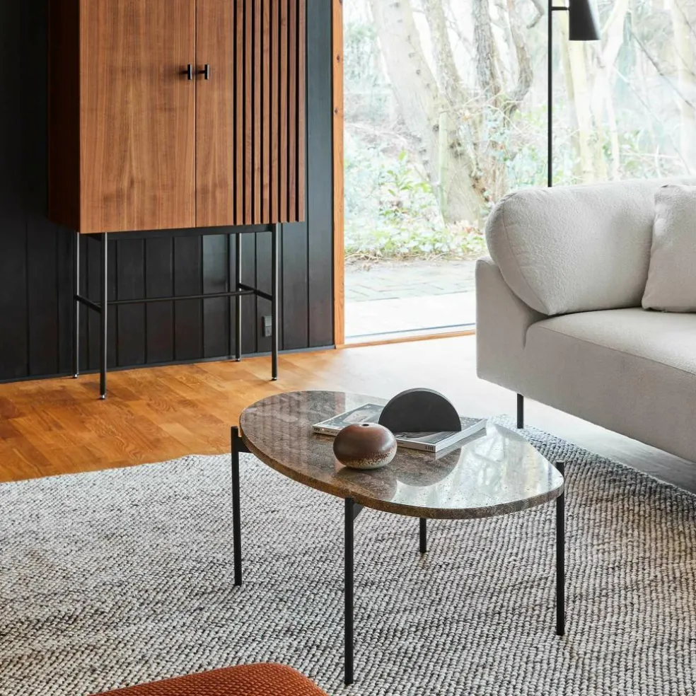 Was beim La Terra Beistelltisch L ins Auge sticht, ist die außergewöhnliche Platte aus Travertin. Der Stein wirkt schwer und robust und hat gleichzeitig eine von der Natur gezeichnete Oberfläche. Auch die Form der Tischplatte ist natürlich und unregelmäßig. Im Kontrast dazu steht das Metallgestell, das mit seinen geradlinigen Formen Stabilität ausdrückt, jedoch aufgrund der schlanken, runden Beine auch einen leichten Charakter ausstrahlt. Dies macht den La Terra Beistelltisch L so vielseitig. Denn er fügt sich als einzelner Couchtisch oder im Ensemble mit weiteren La-Terra-Tischchen nicht nur perfekt in die Sofalandschaft daheim ein, sondern passt auch in den modernen Wartebereich einer Praxis oder die Lobby im Hotel.