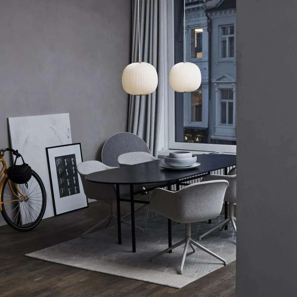 Durch das angenehme Licht kommt die Leuchte gerne in der Küche oder dem Esszimmer zum Einsatz. In einer runden Ausführung präsentiert sich hier die Lamella 3 Pendelleuchte. Die Lampen von Le Klint sind aber auch in zwei weiteren Varianten erhältlich: zum einen die bauchige Lamella 1 und zum anderen die Lamella 2 in einer schlanken Form.