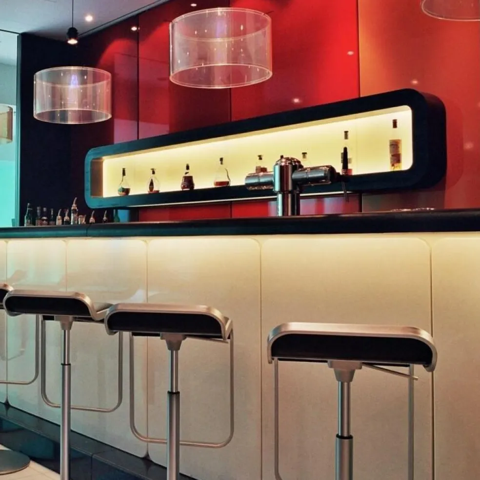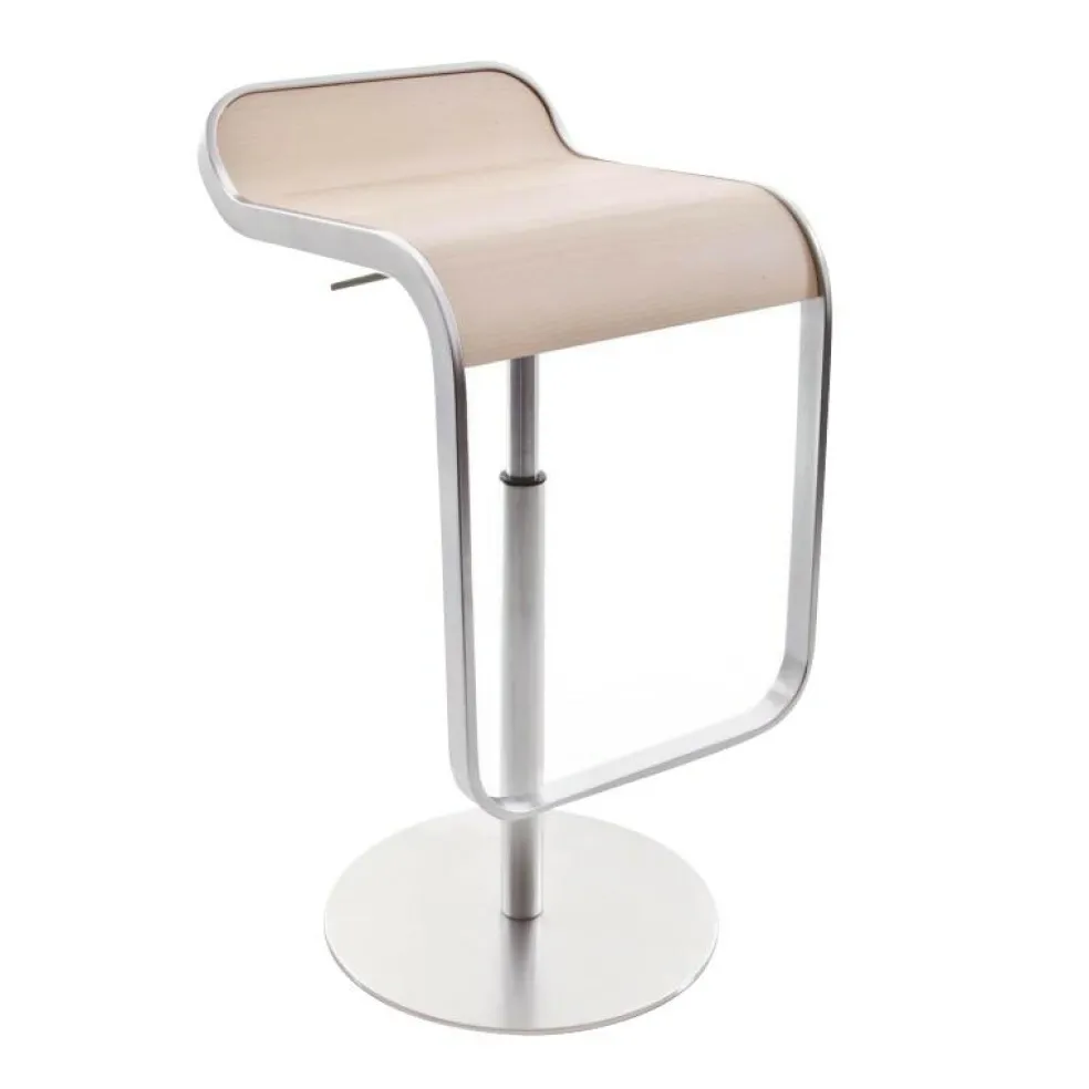 Ähnlich wie ein Raumschiff, bei dem auf unnötigen Ballast verzichtet werden muss, reduziert sich der Entwurf des LEM S79 Barhocker Sitzfläche Eiche 63-75cm auf das Wesentliche. Zum Blickfang wird ein glänzender Rahmen, der sich von der Sitzschale an der Vorderseite nach unten zieht und eine Fußstütze bildet. Das Gestell besteht aus Metall mit einer galvanisierenden matten Veredelung aus Nickel und Chrom. Die runde Metallbodenplatte ist mit Edelstahl Aisi 304 pulverbeschichtet und hat einen Durchmesser von 37 cm. Zur Schonung empfindlicher Böden sind an der Unterseite Filzgleiter montiert. Die Sitzfläche besteht aus Eichenlaminat, dass mit Acrylharz versiegelt wurde.