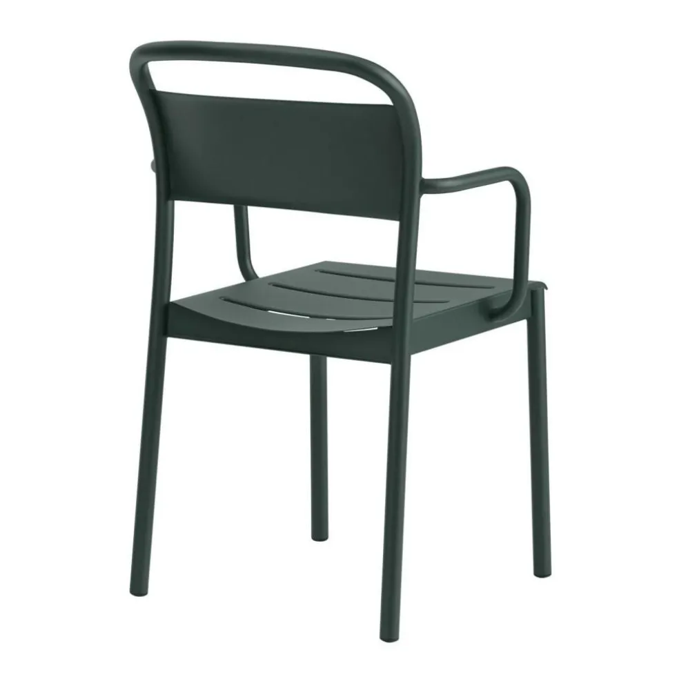 Gefertigt ist der Linear Steel Gartenarmlehnstuhl aus pulverbeschichtetem Stahl. Das macht ihn zur idealen Sitzgelegenheit für den Garten, den Balkon oder die Terrasse. Das Material hält UV-Strahlen Stand, auch Regen kann ihm nichts anhaben. Das matte Material verleiht dem Linear Steel Gartenarmlehnstuhl ein elegantes Aussehen. Praktisch ist auch, dass man bis zu fünf Stück der Stühle übereinander stapeln kann. Festen Stand garantieren vier rund geformte Füße, an deren Unterseite Kunststoffgleiter angebracht sind. Darauf ist eine Sitzfläche montiert, die drei Spalten aufweist. Dadurch kann Regenwasser ganz einfach abfließen. Eine ergonomisch geformte Rückenlehne unterstützt den Körper auch bei längerem Sitzen. An den beiden Seiten laden rund geformte Armlehnen dazu ein, die Unterarme bequem abzustützen.