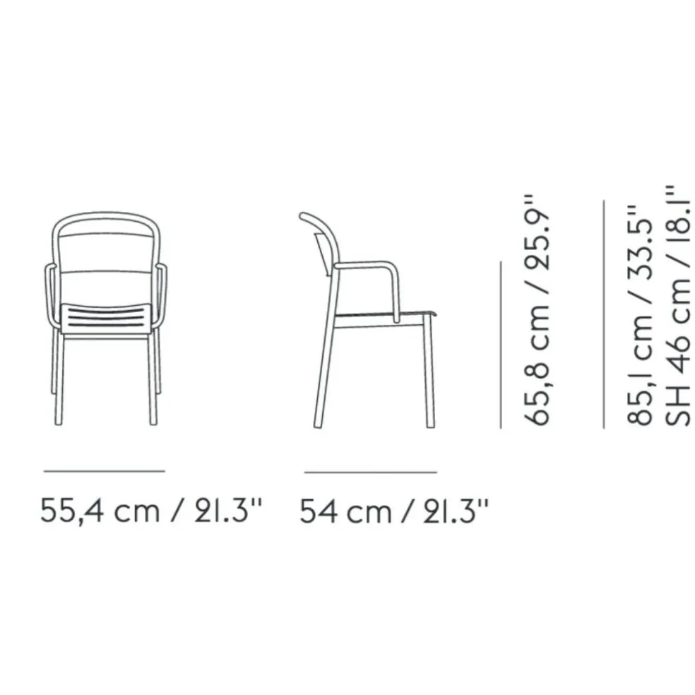 Der Linear Steel Gartenarmlehnstuhl ist 54 cm breit und 49,6 cm tief. Mit samt der Rückenlehne ist er 85,1 cm hoch. Die Armlehnen sind auf 65,8 cm Höhe befestigt. Das wetterfeste Möbelstück ist eine wahre Bereicherung für Ihre Oase im Freien.