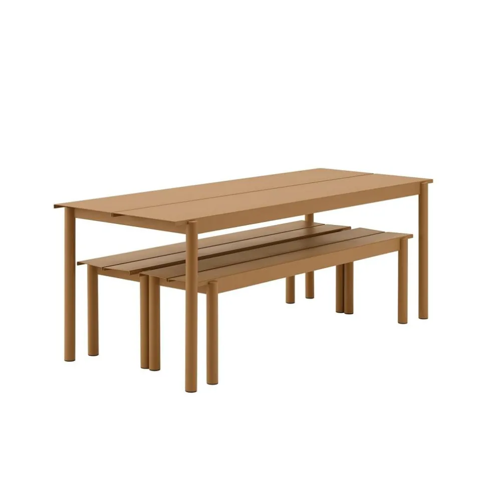 Bewusst entschied sich Bentzen bei der Linear-Steel-Serie für pulverbeschichteten Stahl. Das Material überzeugt mit langer Haltbarkeit und hält außerdem selbst widrigen Witterungsverhältnissen Stand. Weder UV-Strahlen noch Hitze und Regen können dem Linear Steel Gartenset L 200cm etwas anhaben. Das Design des Sets spielt elegant mit geometrischen Formen: Die runden Füße sind sowohl beim Tisch als auch bei der Bank an der Außenseite montiert. Die Sitz- und Ablageflächen weisen Spalten auf, durch die Regenwasser abfließen kann. Sie sind außerdem an beiden Seiten über das Gestell verlängert, was das Set unverwechselbar macht.