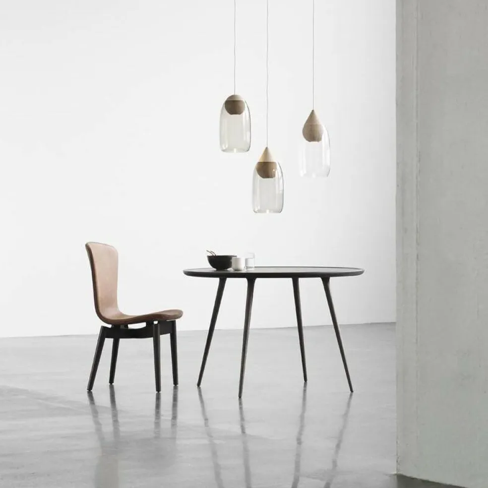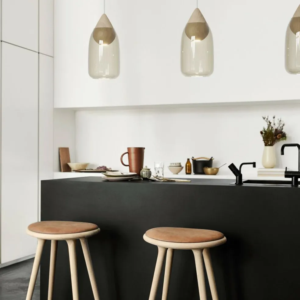 Die Liuku Drop Pendelleuchte setzt sich aus zwei Teilen zusammen. Es besteht die Möglichkeit, einen mundgeblasenen Glasschirm über den Tropfen aus Holz zu stülpen. Dadurch entsteht ein neuer Lichteffekt. Die zylinderartigen Glasschirme, die in verschiedenen Farben verfügbar sind, dämpfen das Licht und geben es gebündelt nach unten ab.